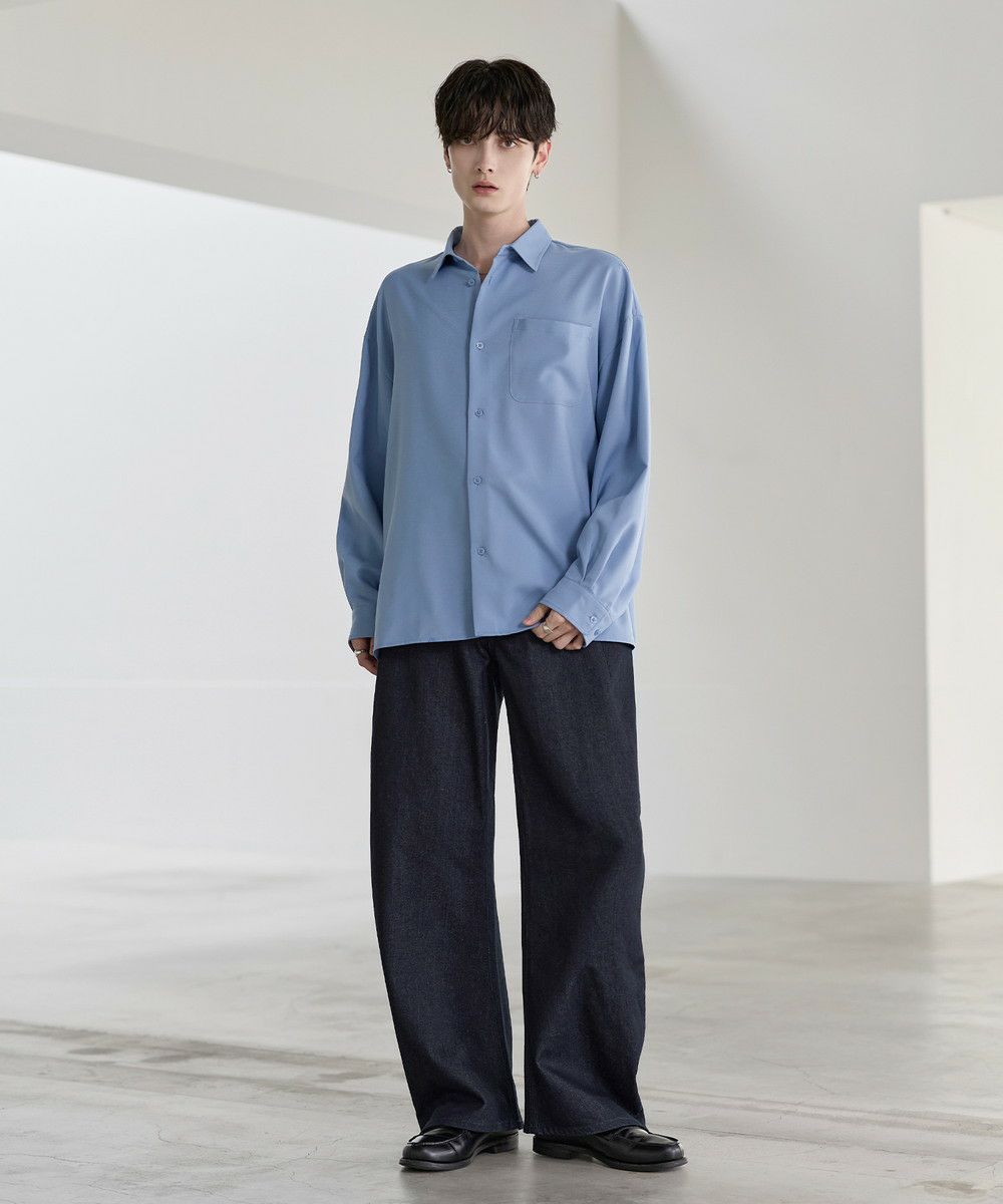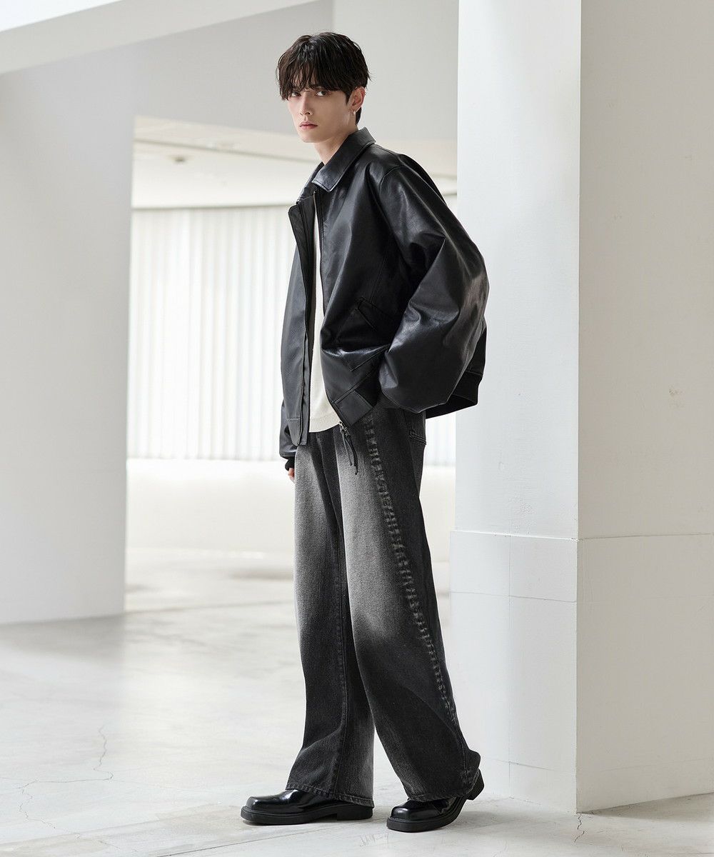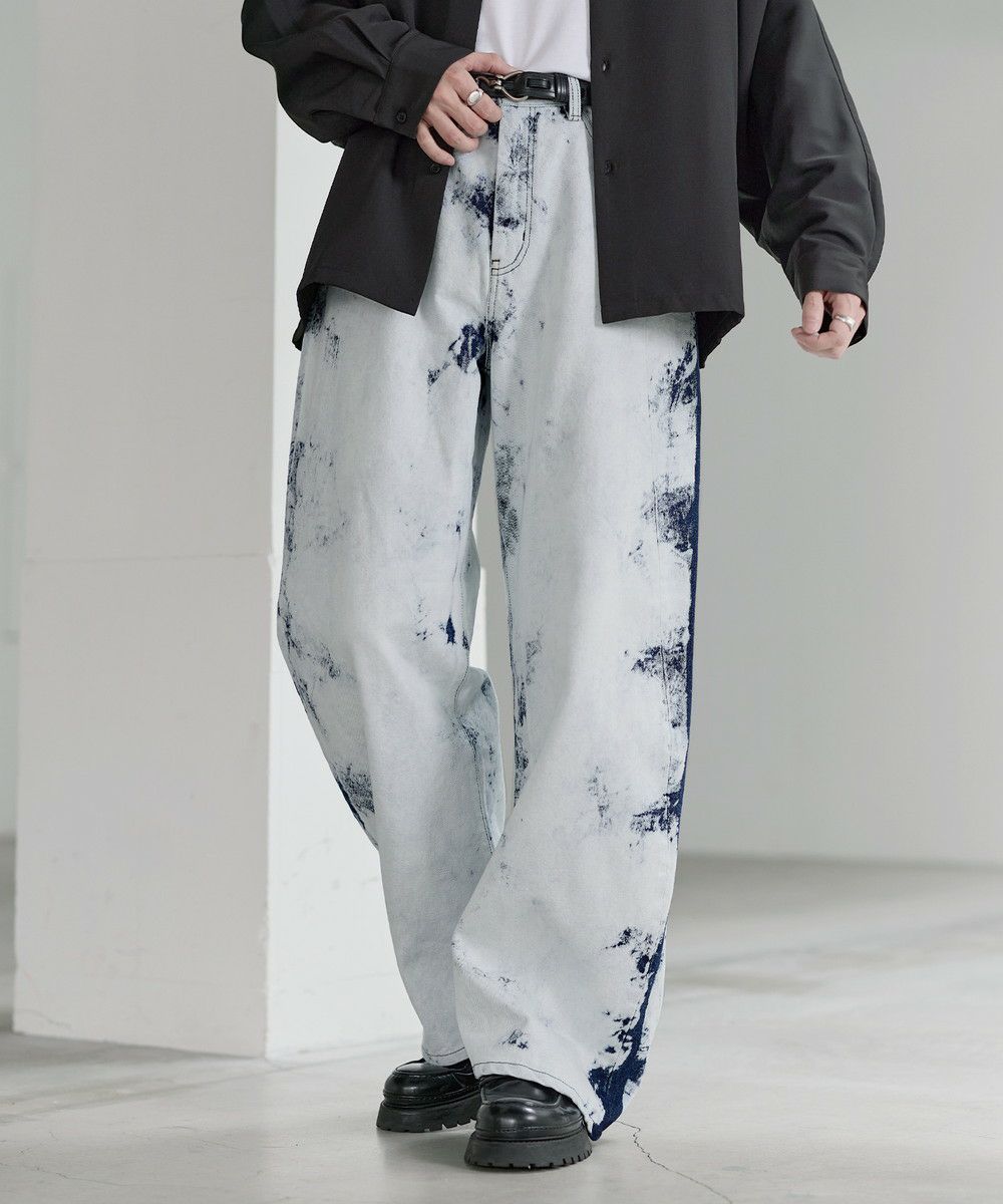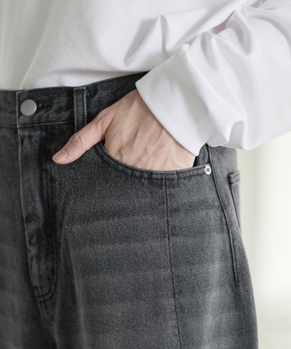 シンプルなTシャツやシャツを合わせて、デニムの存在感を際立たせたコーディネートがおすすめ。足元にはボリューム感のあるレザーシューズや厚底スニーカーを合わせることで、ワイドシルエットとのバランスがとれ、全体にまとまりのあるスタイルに仕上がります。個性的なシルエットと加工感を活かしつつ、モノトーンからカラーアイテムまで幅広いトップスと好相性の一本です。