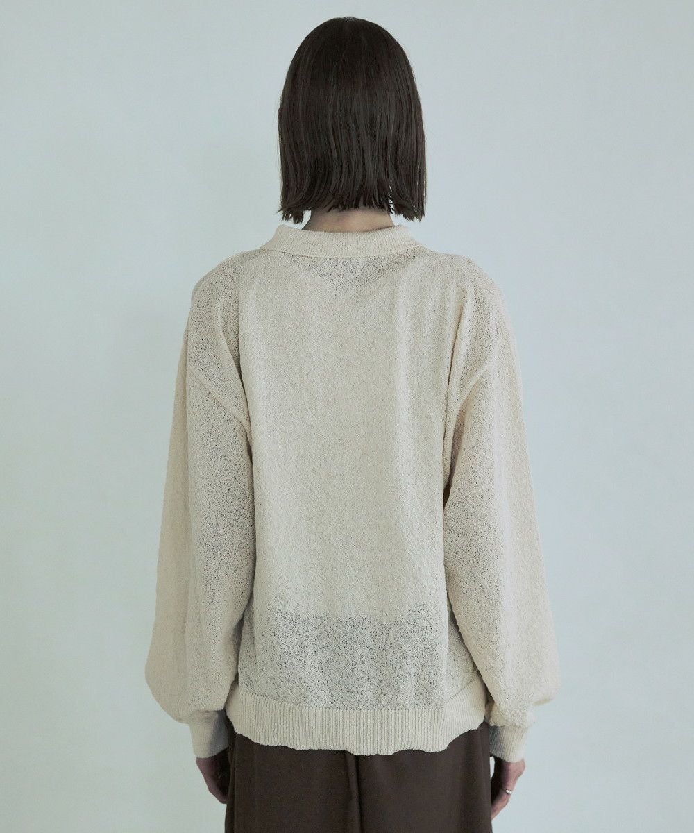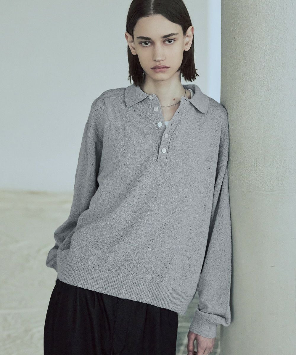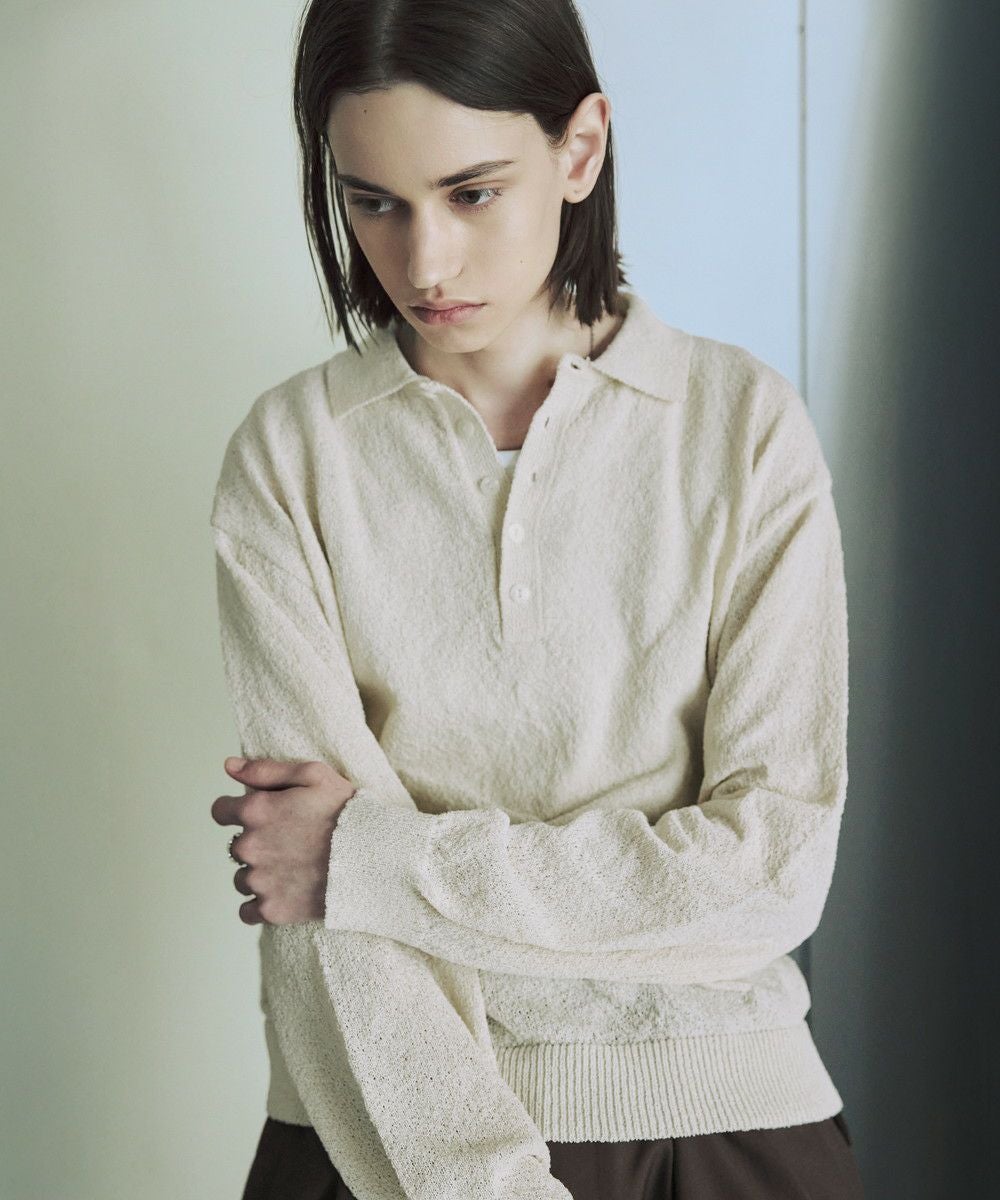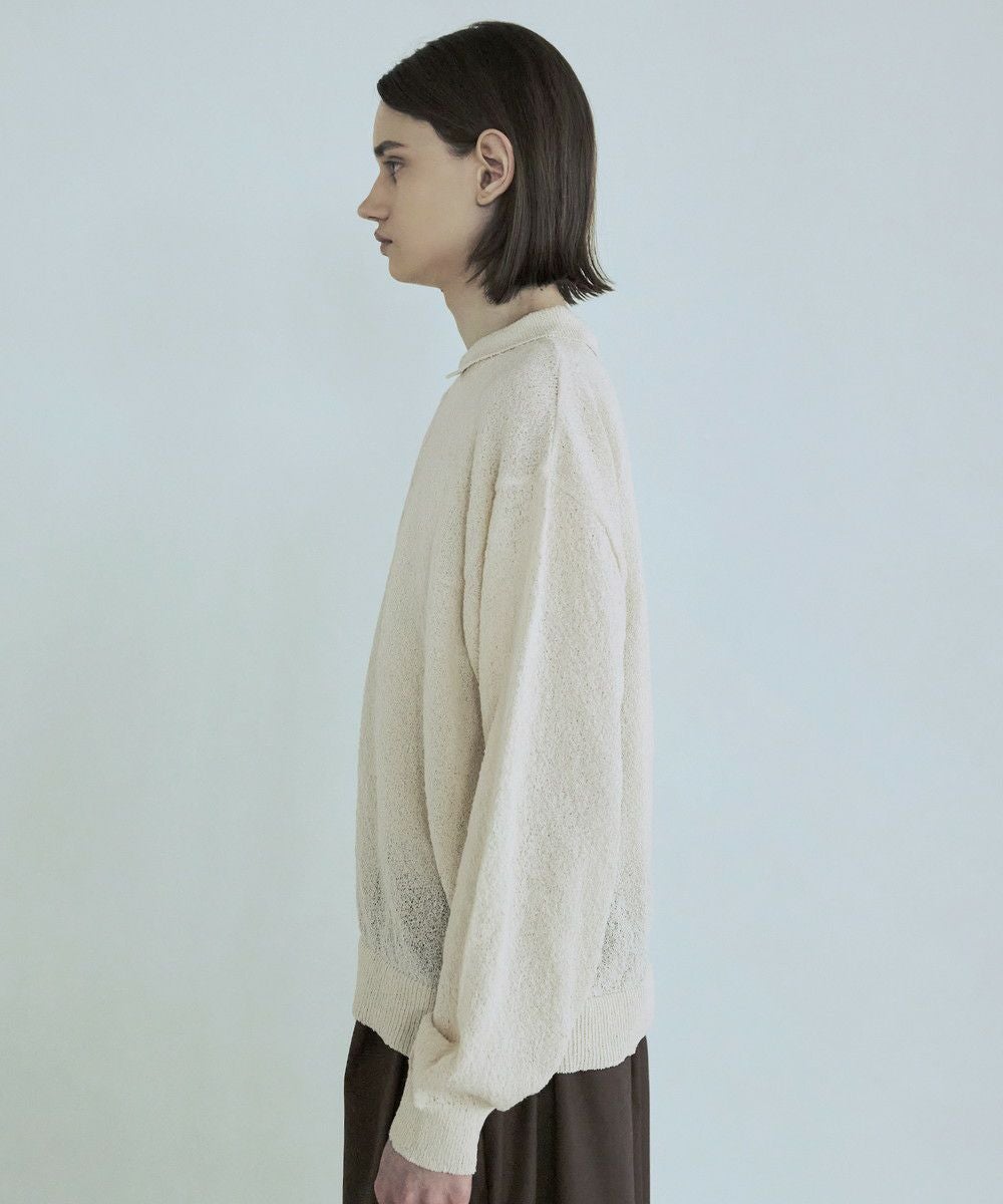 表情豊かなシアーブークレ生地で仕上げた襟付きヘンリーニット。ゆとりを持たせた身幅やアームホール、ドロップショルダーがリラックス感を演出しつつ、襟付きのデザインにすることでカジュアルすぎない品のある印象にまとめてくれます。丸みのある袖は袖口をリブで引き締めることで、だらしなく見えない絶妙なシルエットに。タンクトップとレイヤードして着用すると、上品な透け感がお洒落な着こなしを叶えます。