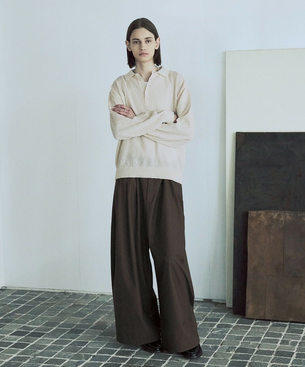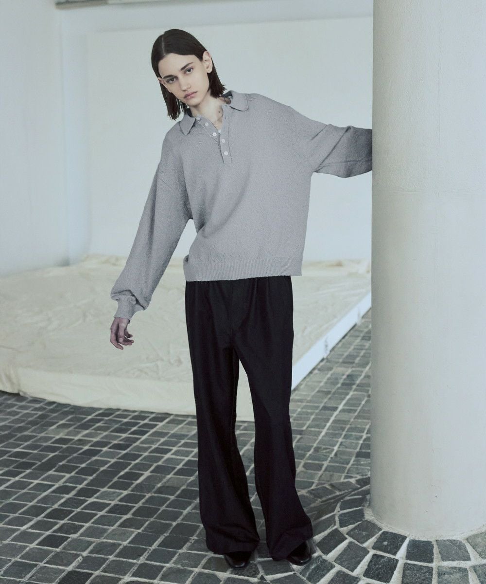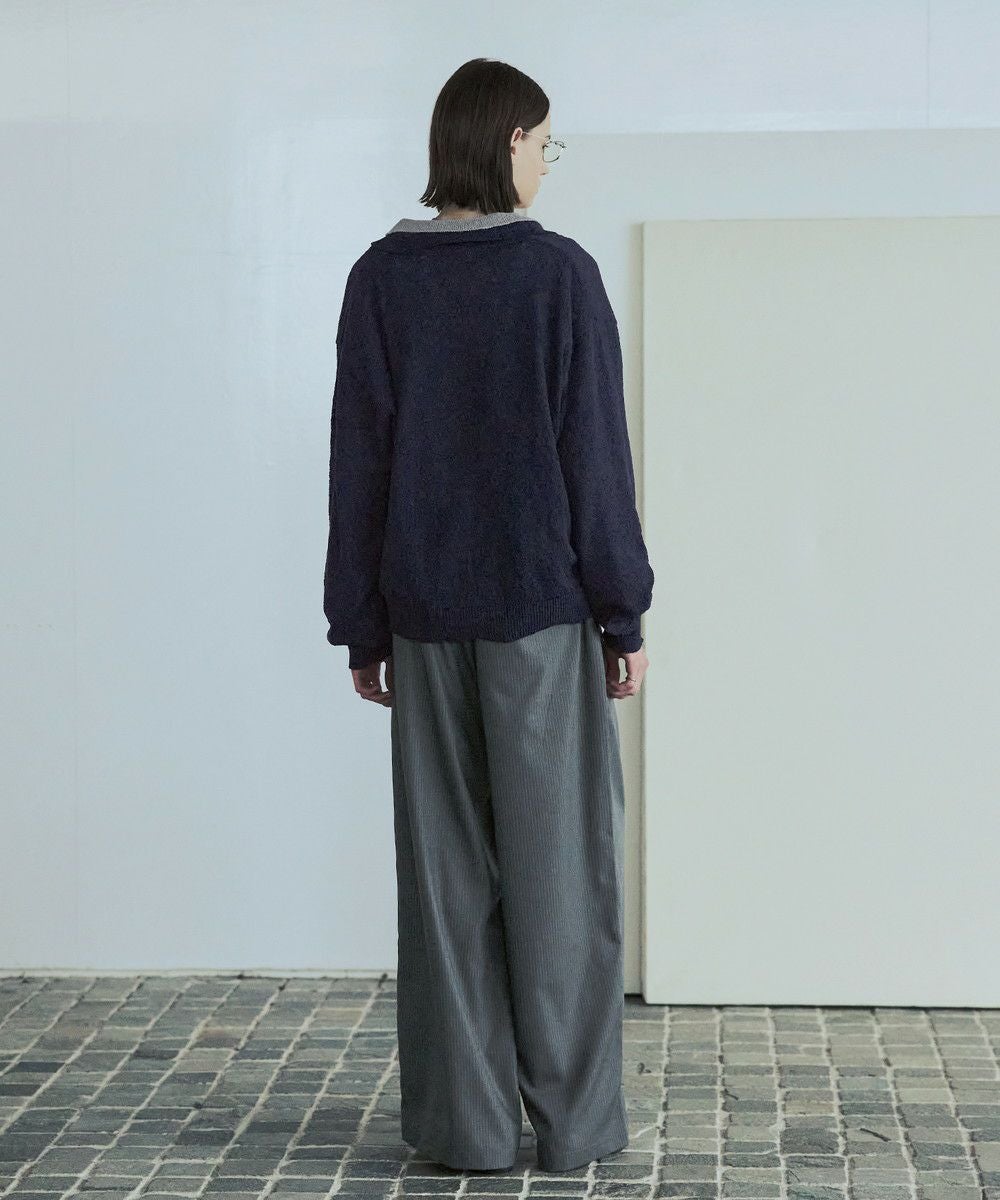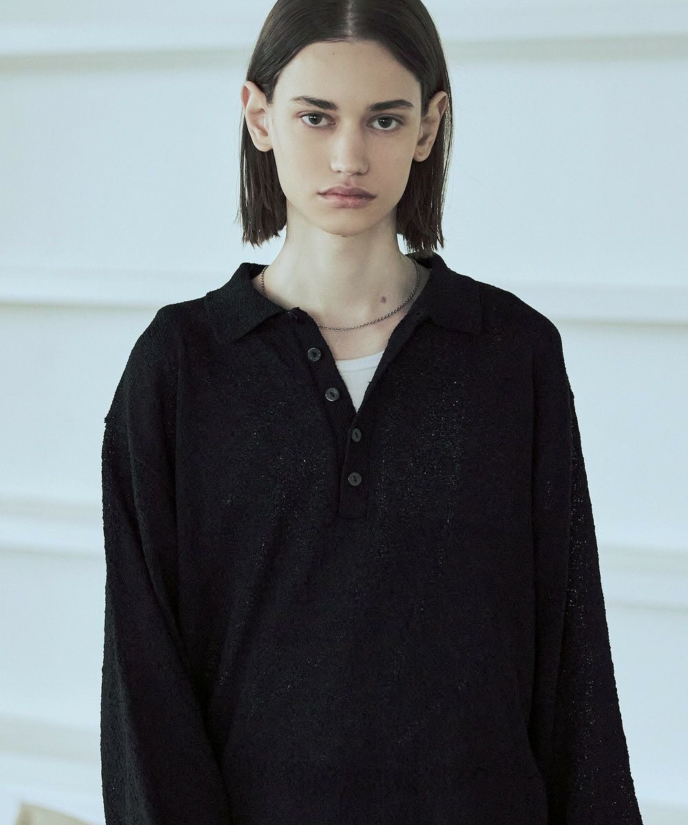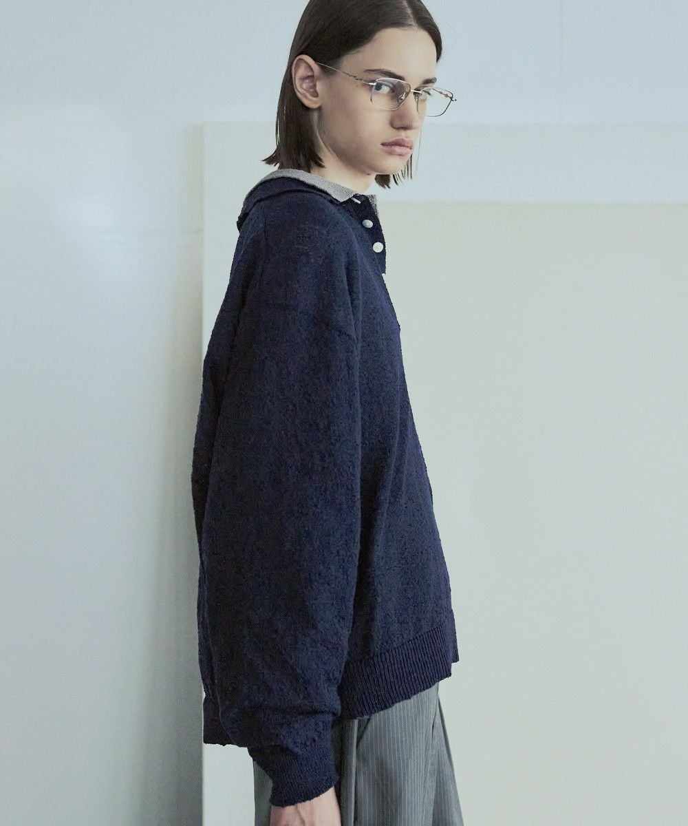 表情豊かなシアーブークレ生地で仕上げた襟付きヘンリーニット。ゆとりを持たせた身幅やアームホール、ドロップショルダーがリラックス感を演出しつつ、襟付きのデザインにすることでカジュアルすぎない品のある印象にまとめてくれます。丸みのある袖は袖口をリブで引き締めることで、だらしなく見えない絶妙なシルエットに。タンクトップとレイヤードして着用すると、上品な透け感がお洒落な着こなしを叶えます。