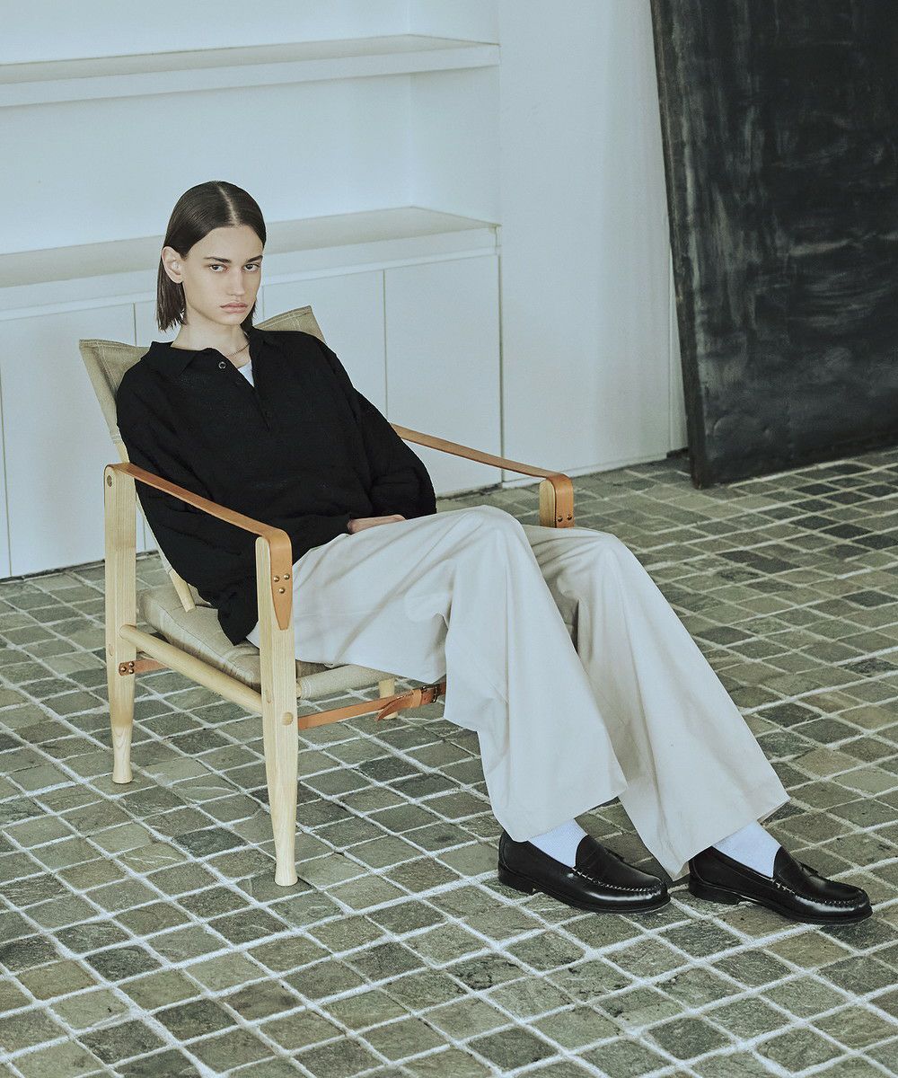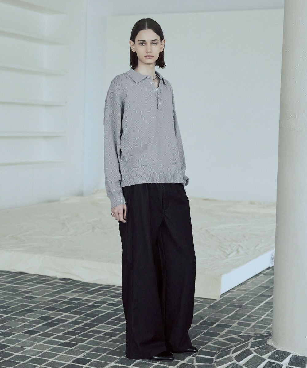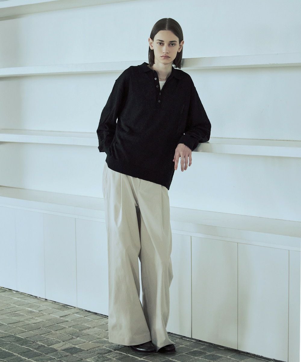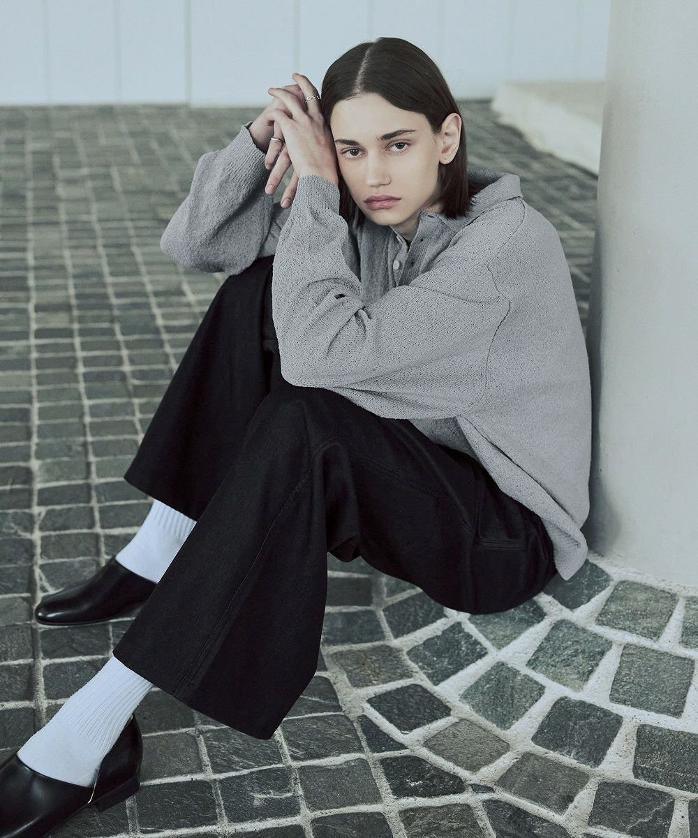 表情豊かなシアーブークレ生地で仕上げた襟付きヘンリーニット。ゆとりを持たせた身幅やアームホール、ドロップショルダーがリラックス感を演出しつつ、襟付きのデザインにすることでカジュアルすぎない品のある印象にまとめてくれます。丸みのある袖は袖口をリブで引き締めることで、だらしなく見えない絶妙なシルエットに。タンクトップとレイヤードして着用すると、上品な透け感がお洒落な着こなしを叶えます。