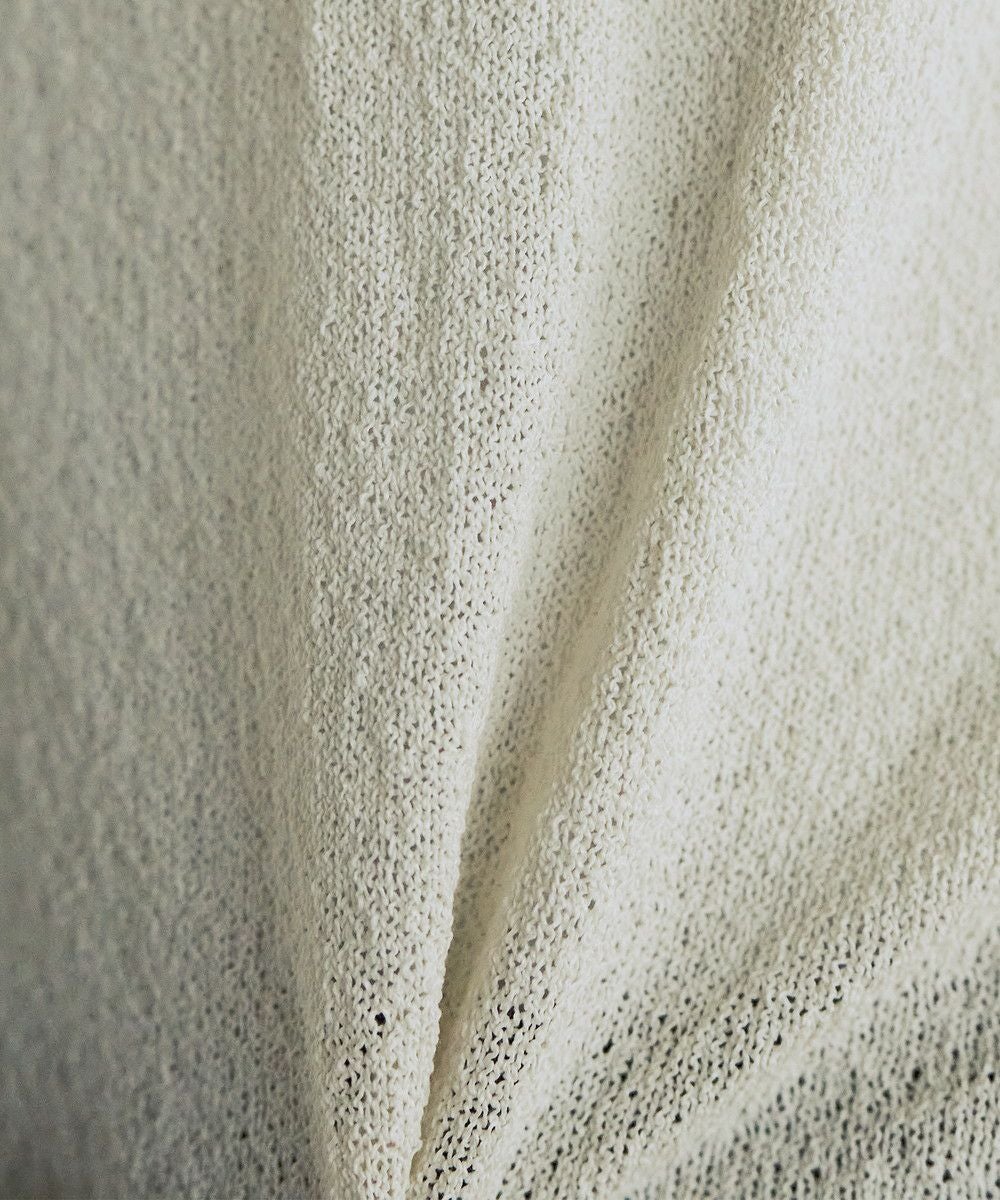 糸のループによってモコモコとした表情を生み出すブークレ生地を採用しました。ループした糸の中に空気を含みやすく、軽くてふんわりとした着心地が魅力。お手入れが簡単なポリエステル100%素材なのもうれしいポイントです。