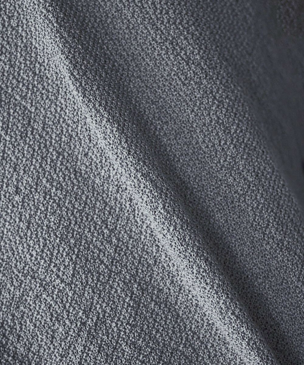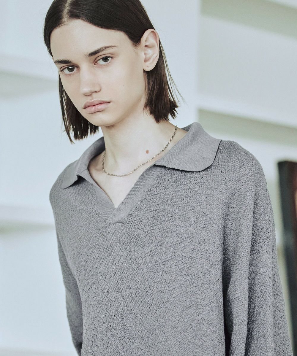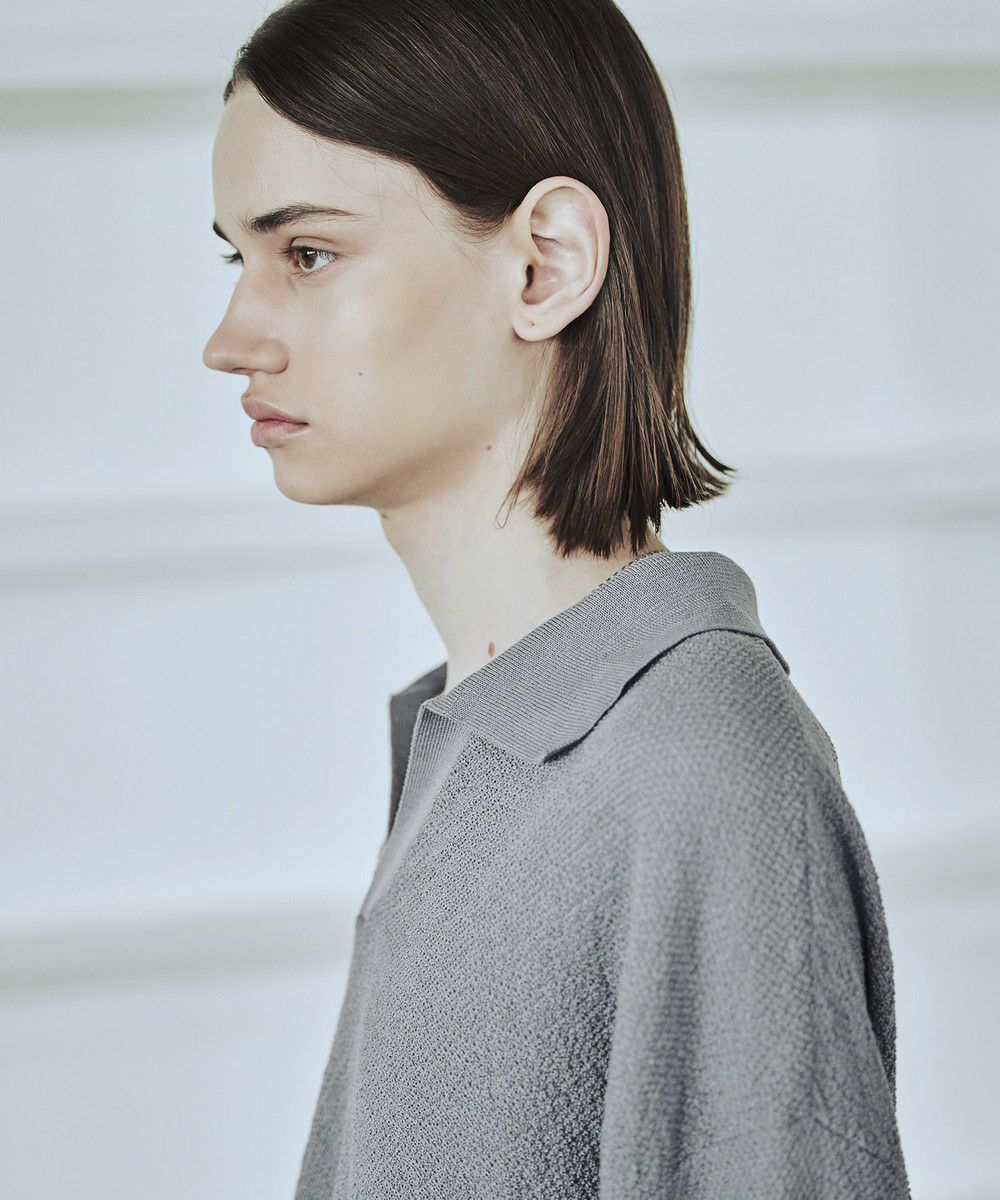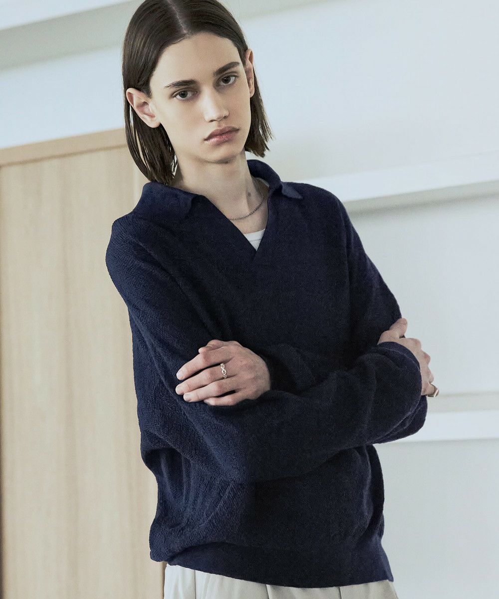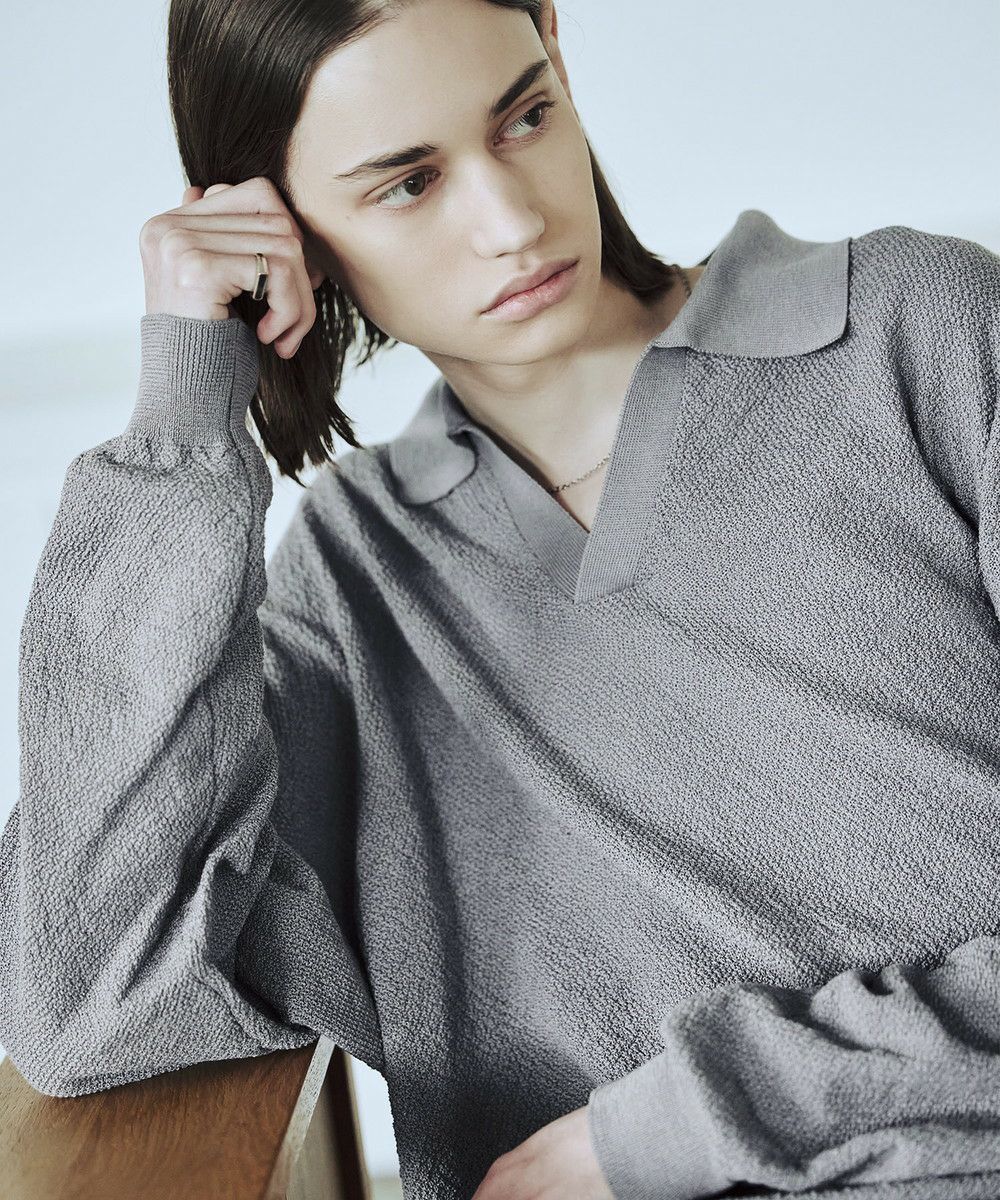 ドライなタッチのポリエステル100%ニットを使用。やや透け感のある編地で、レイヤードコーデが映える素材です。春先や秋口などに特にオススメとなっています。