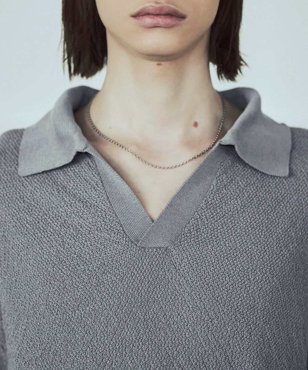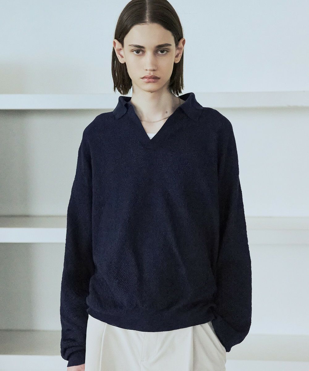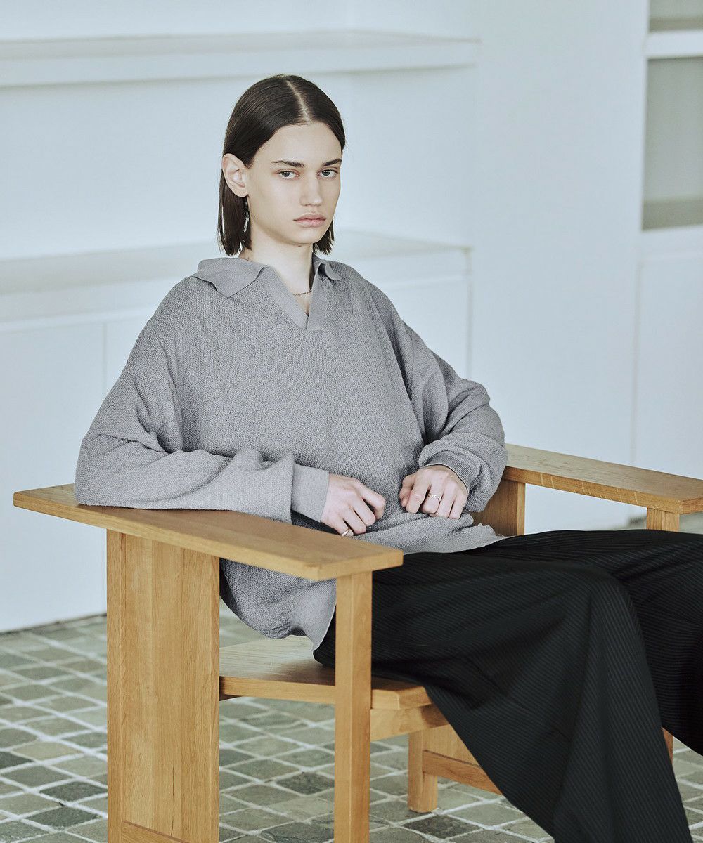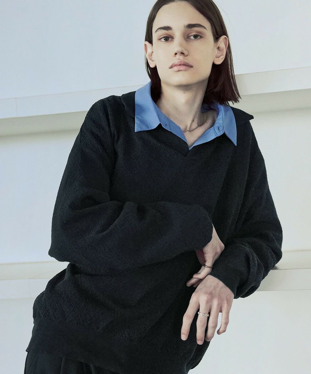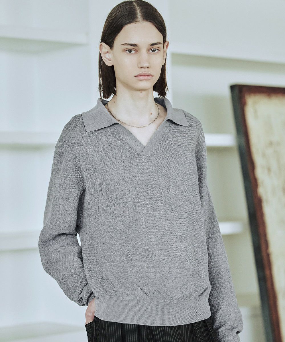 ドライなタッチのポリエステル100%ニットを使用。やや透け感のある編地で、レイヤードコーデが映える素材です。春先や秋口などに特にオススメとなっています。
