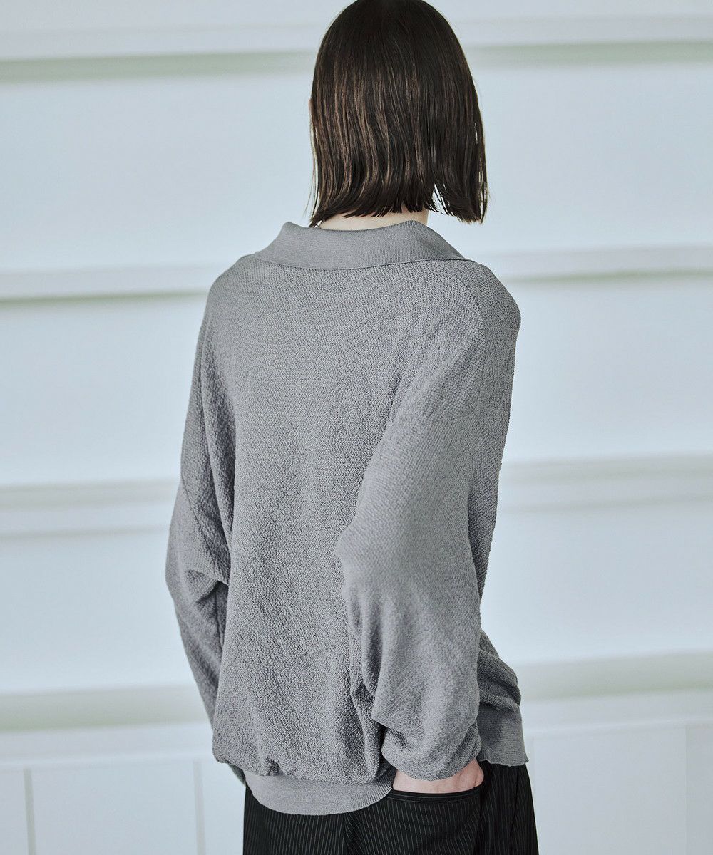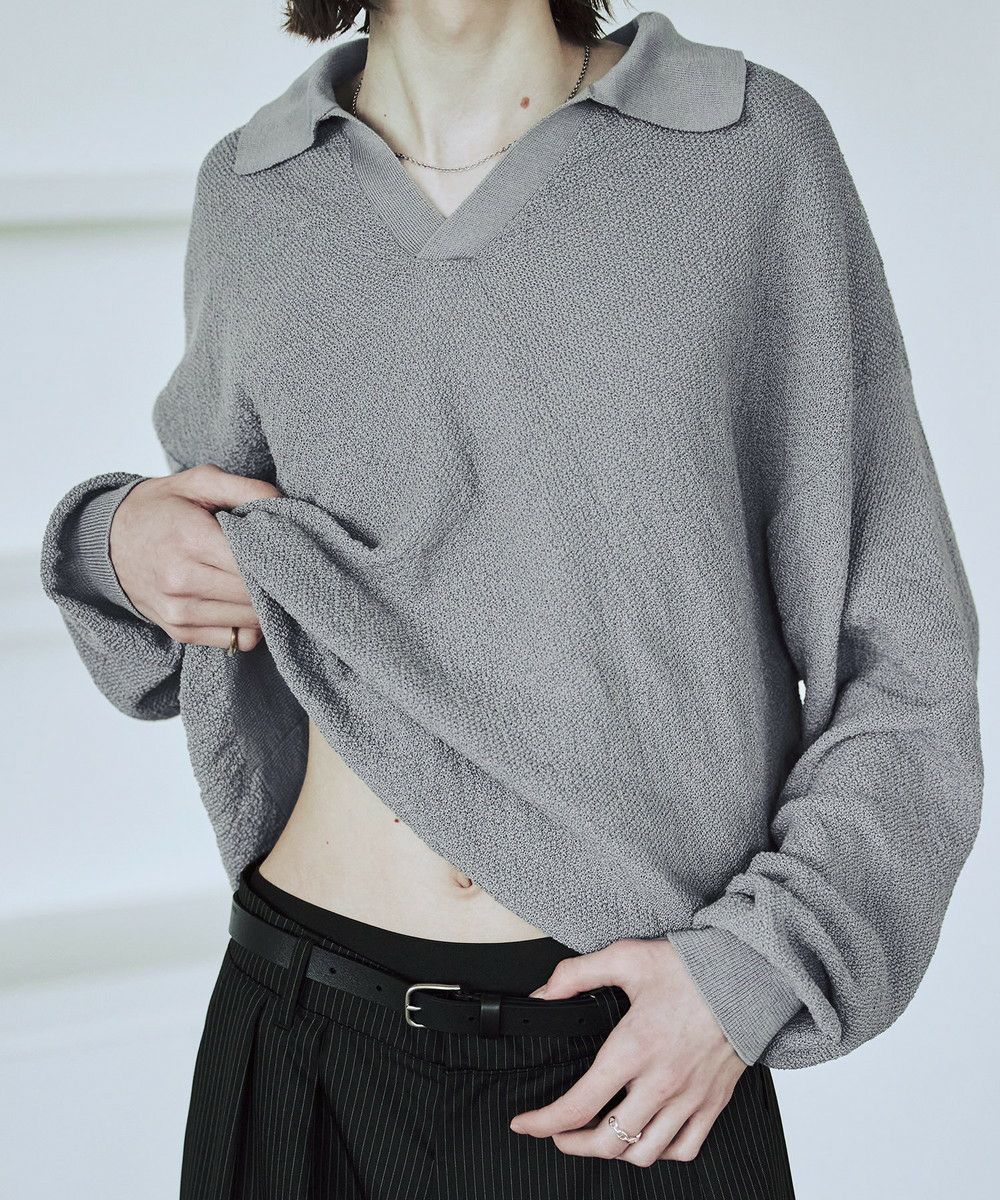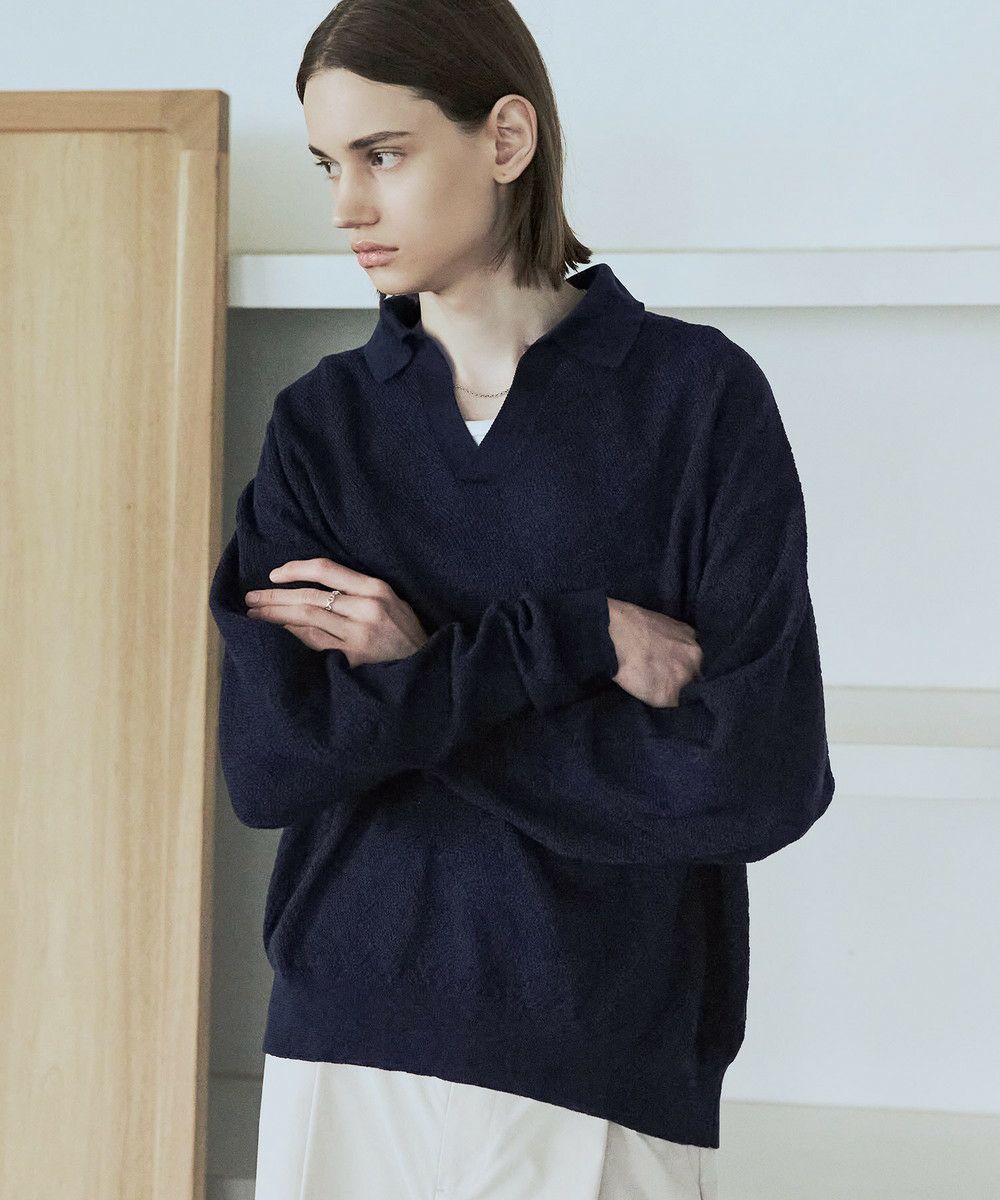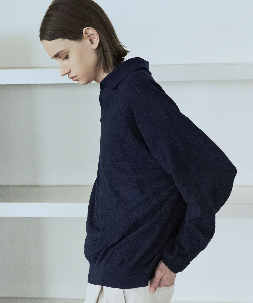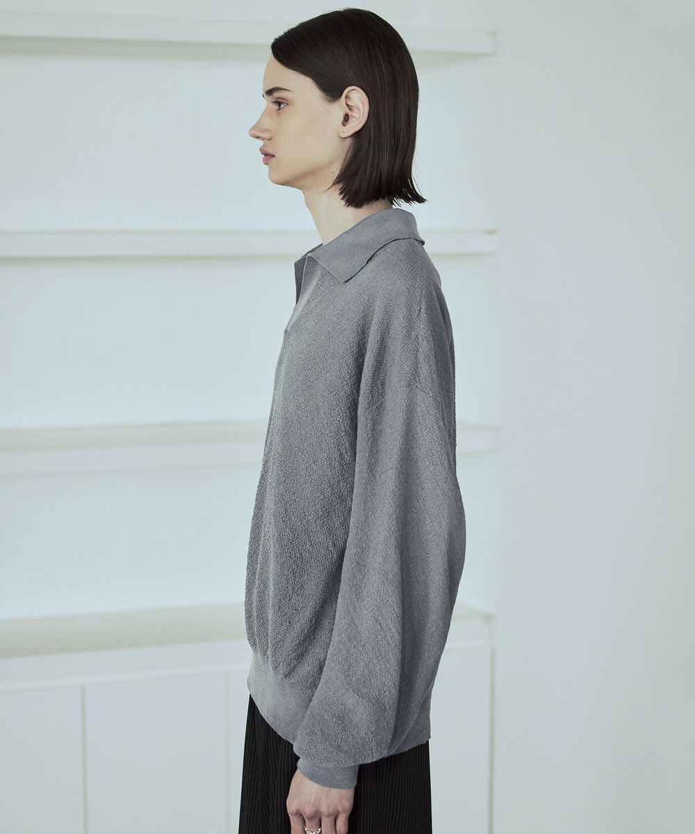 ドライなタッチのポリエステル100%ニットを使用。やや透け感のある編地で、レイヤードコーデが映える素材です。春先や秋口などに特にオススメとなっています。