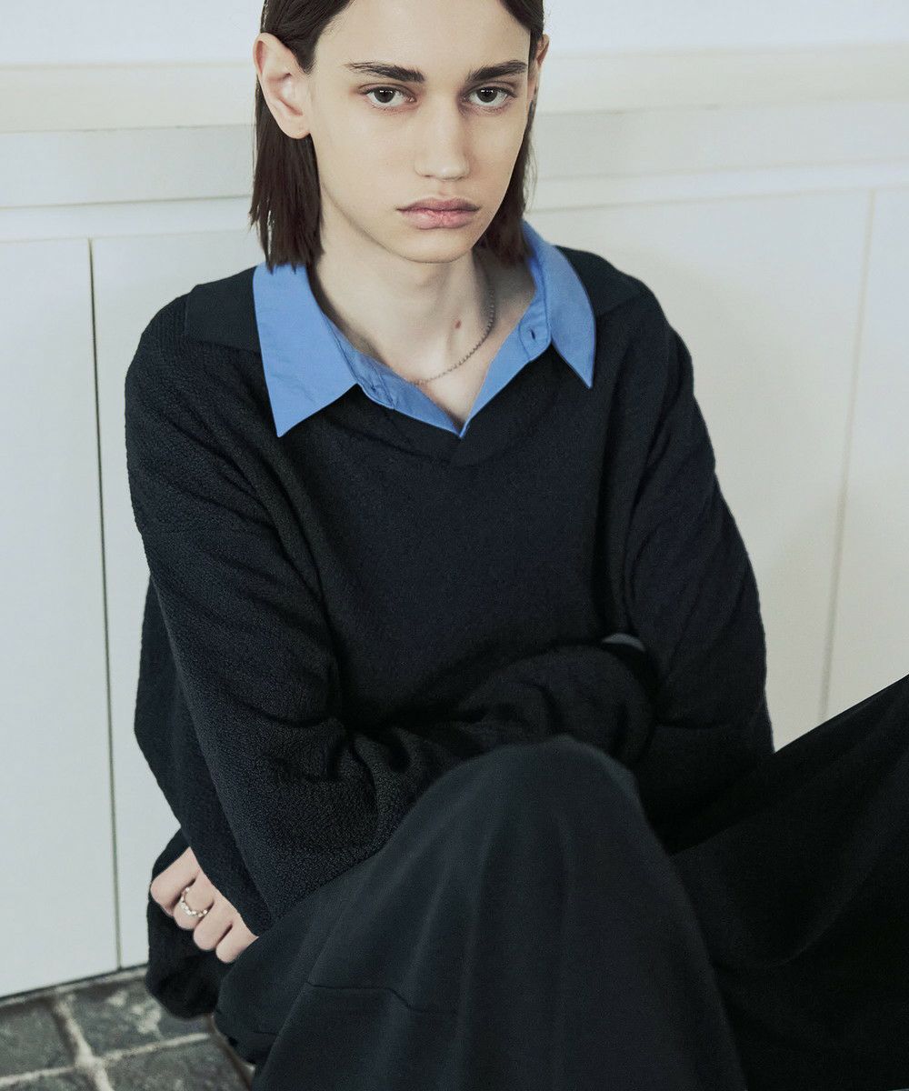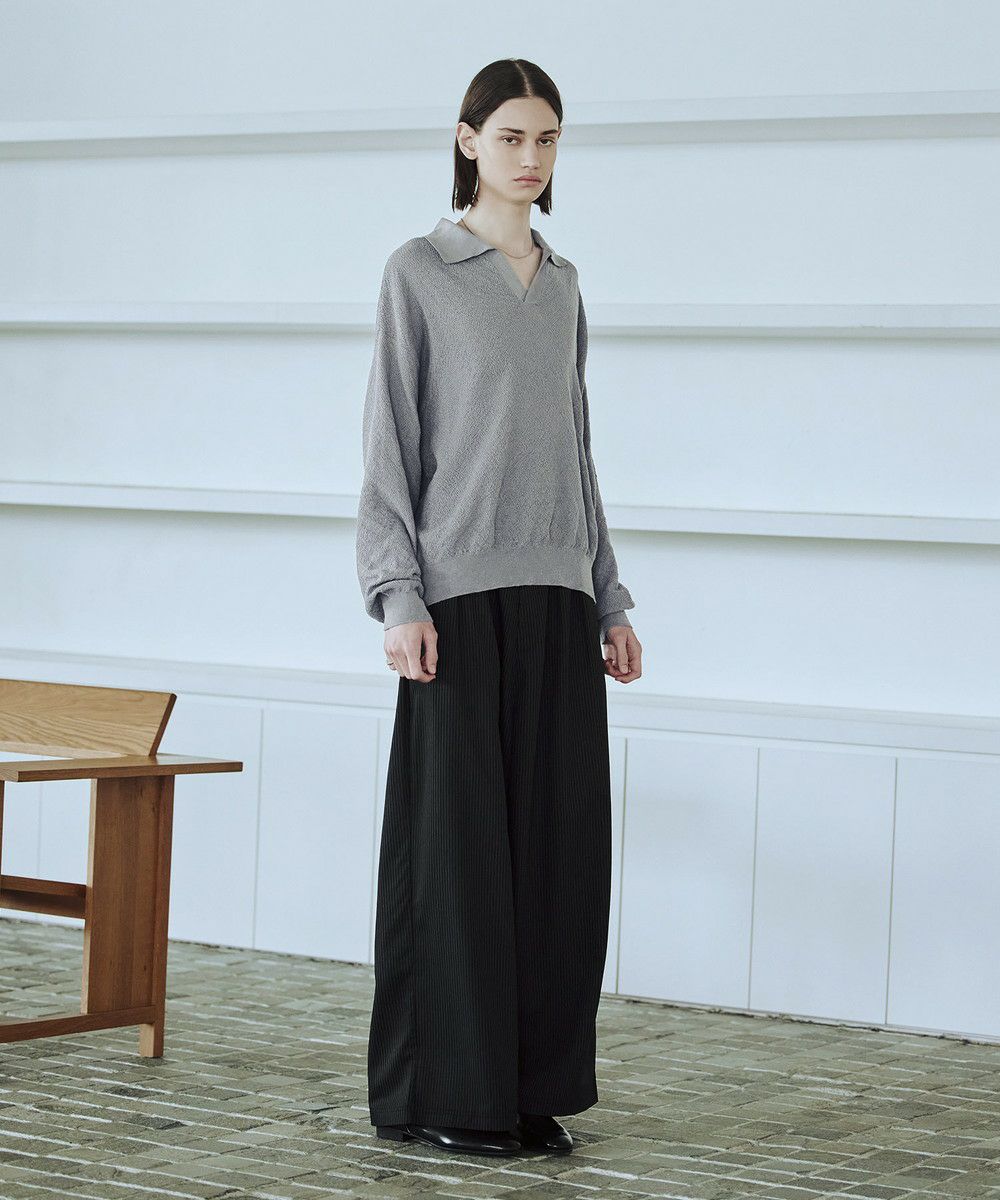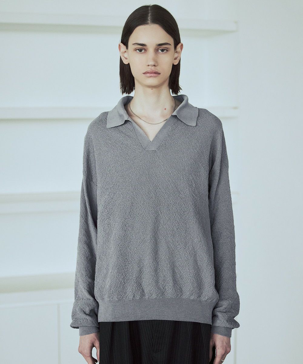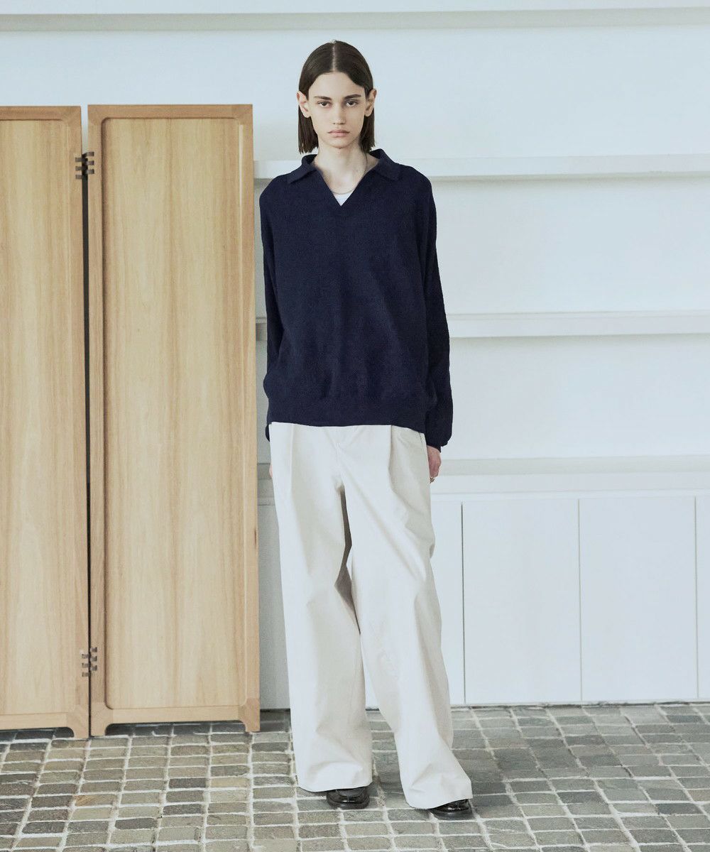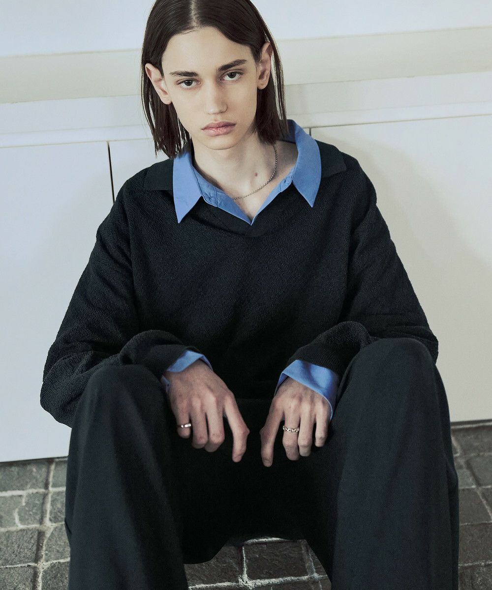 ドライなタッチのポリエステル100%ニットを使用。やや透け感のある編地で、レイヤードコーデが映える素材です。春先や秋口などに特にオススメとなっています。