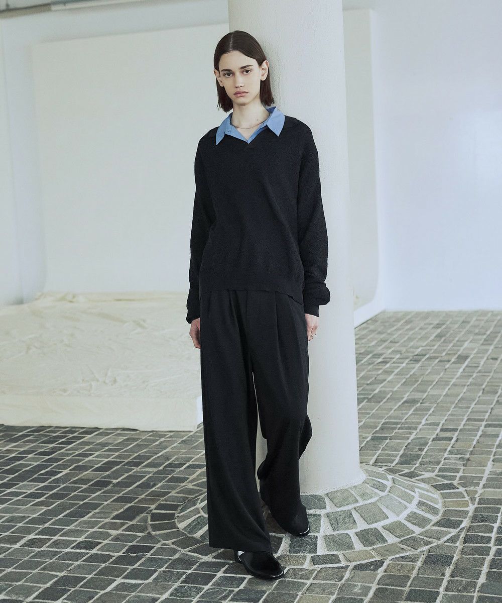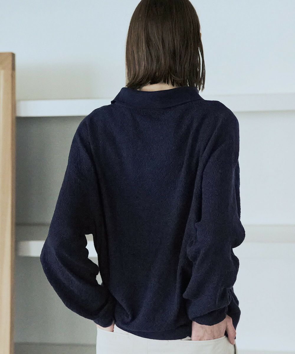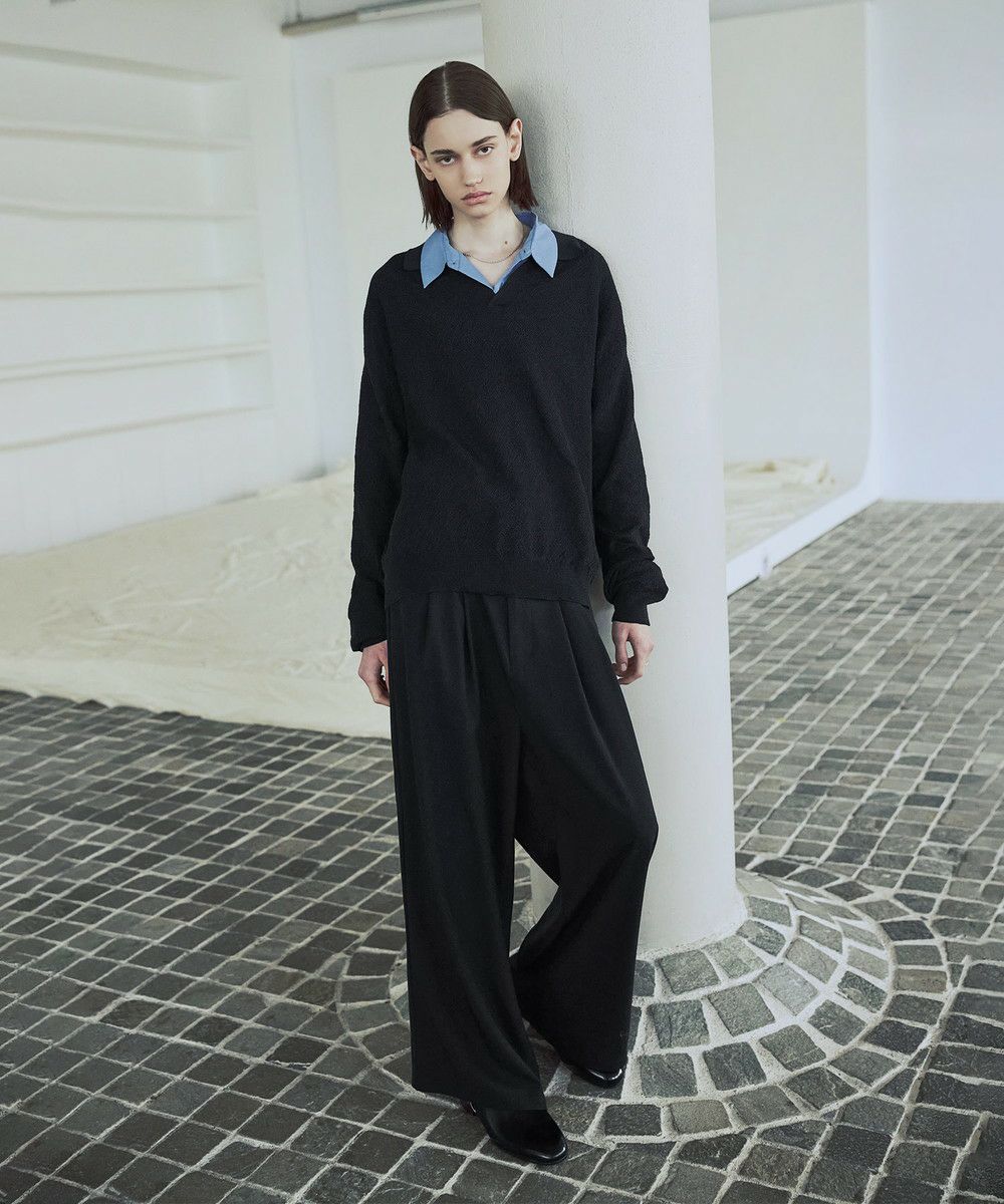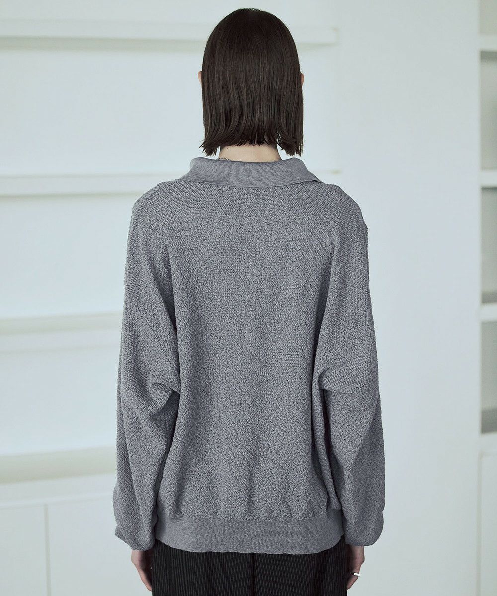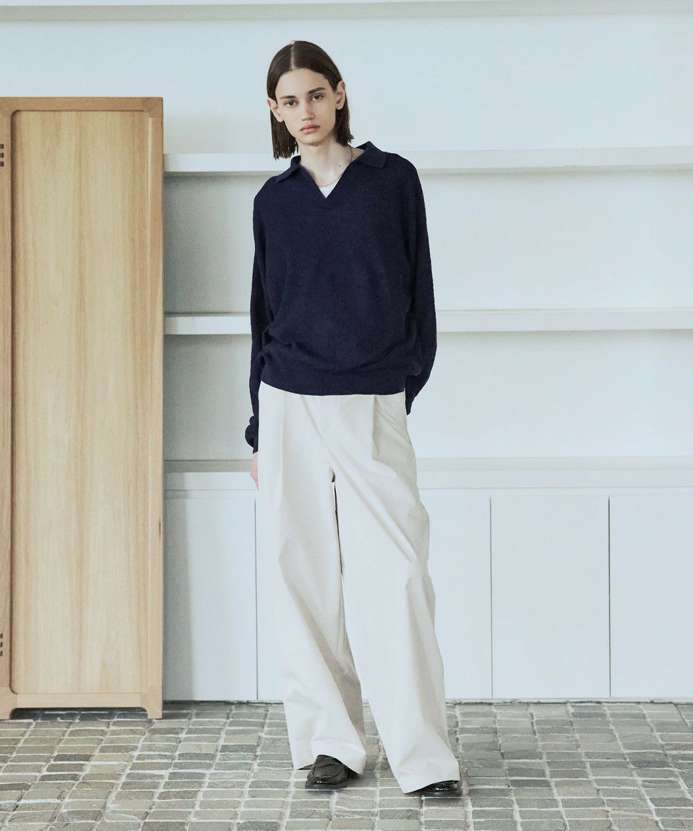 ドライなタッチのポリエステル100%ニットを使用。やや透け感のある編地で、レイヤードコーデが映える素材です。春先や秋口などに特にオススメとなっています。