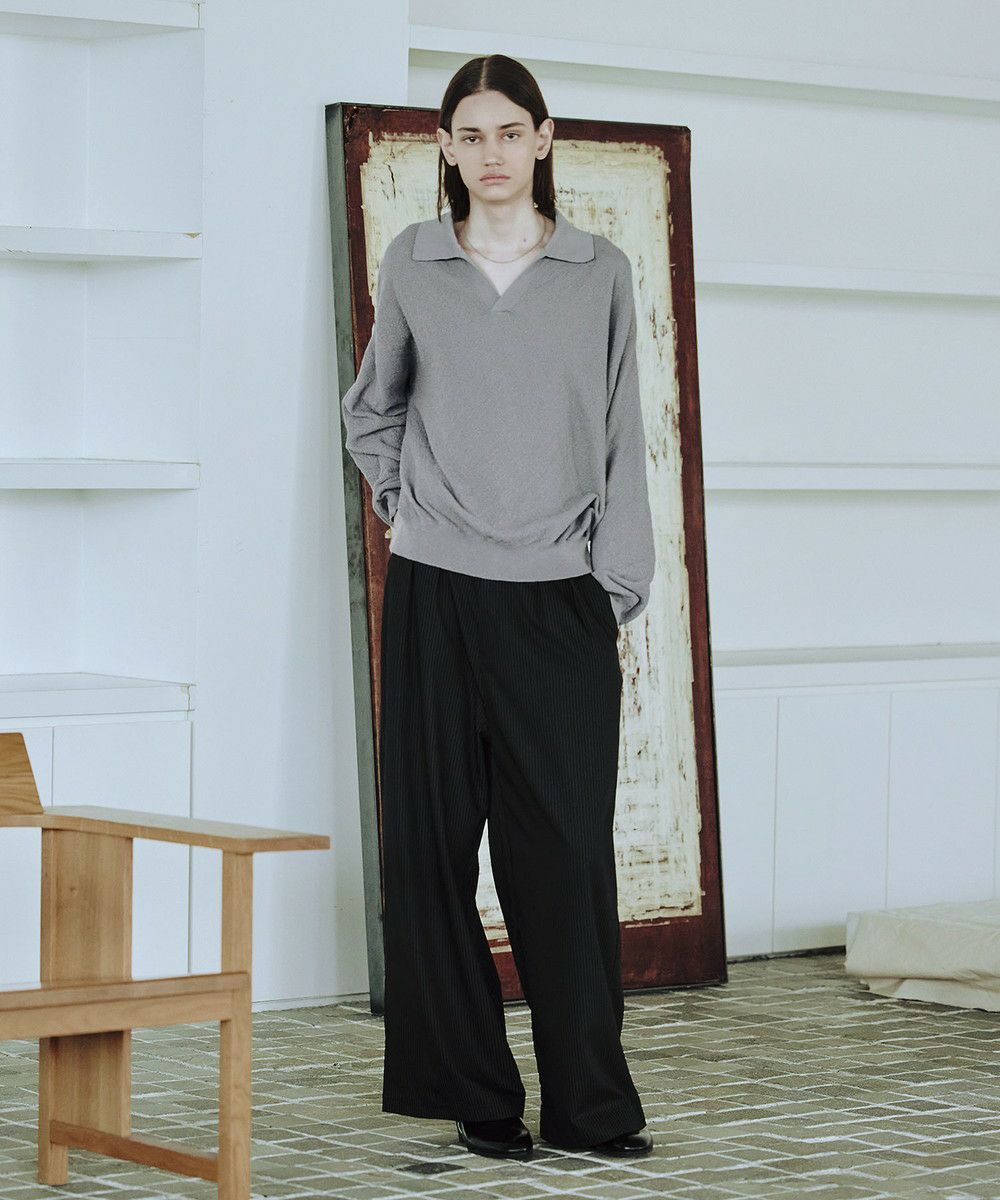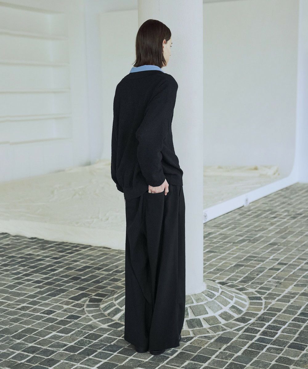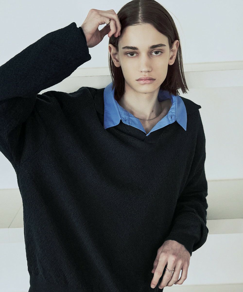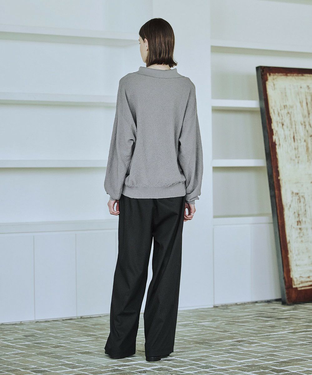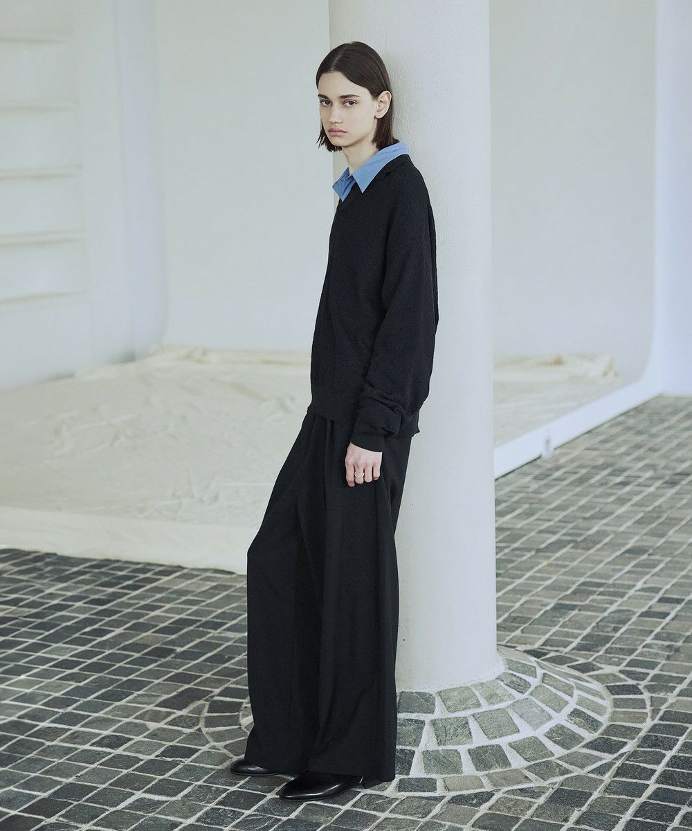 ドライなタッチのポリエステル100%ニットを使用。やや透け感のある編地で、レイヤードコーデが映える素材です。春先や秋口などに特にオススメとなっています。