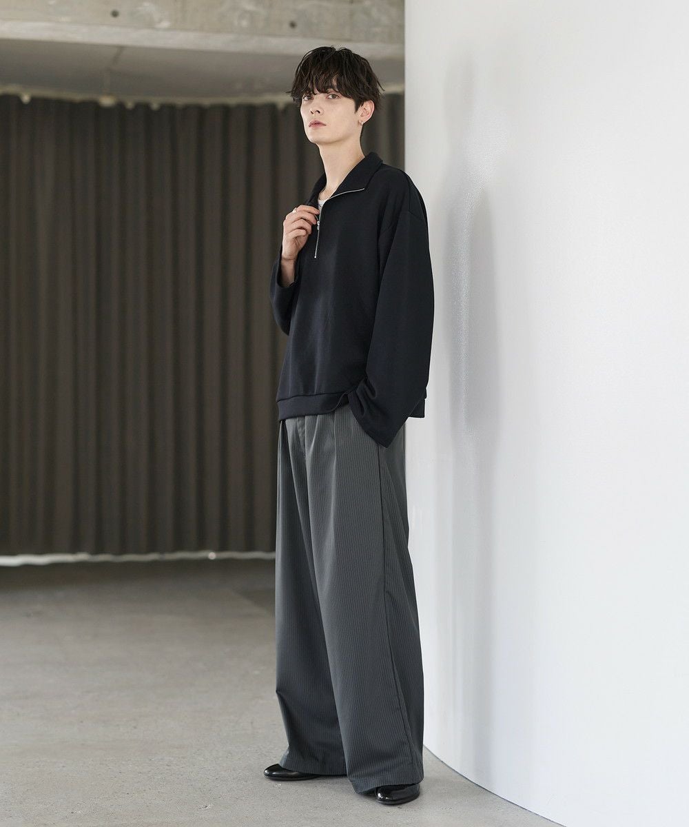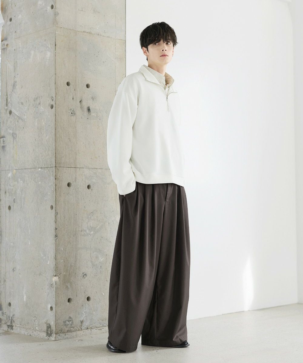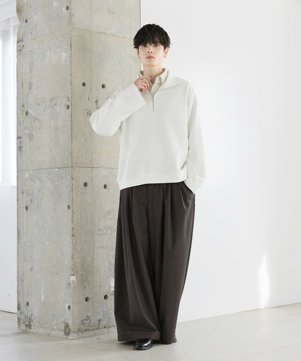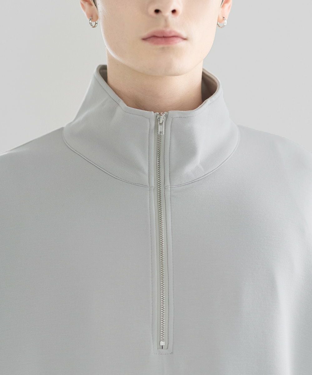 シンプルながらもトレンド感のあるデザインが魅力のハーフジッププルオーバー。ジップの開け閉めで印象の変化を楽しめるハーフジップ仕様で、アレンジが広がる一枚。ゆとりのある身幅とドロップショルダーでリラックス感のある雰囲気に仕上げました。生地は、程よく厚みのあるポンチ素材を使用。空気を含んだようなふくらみと適度なハリが、立体的なシルエットをキープします。伸縮性にも優れストレスフリーな着心地。ほんのりと光沢感があり、シンプルなアイテムながら1枚で上品でキレイめな印象を与えてくれます。