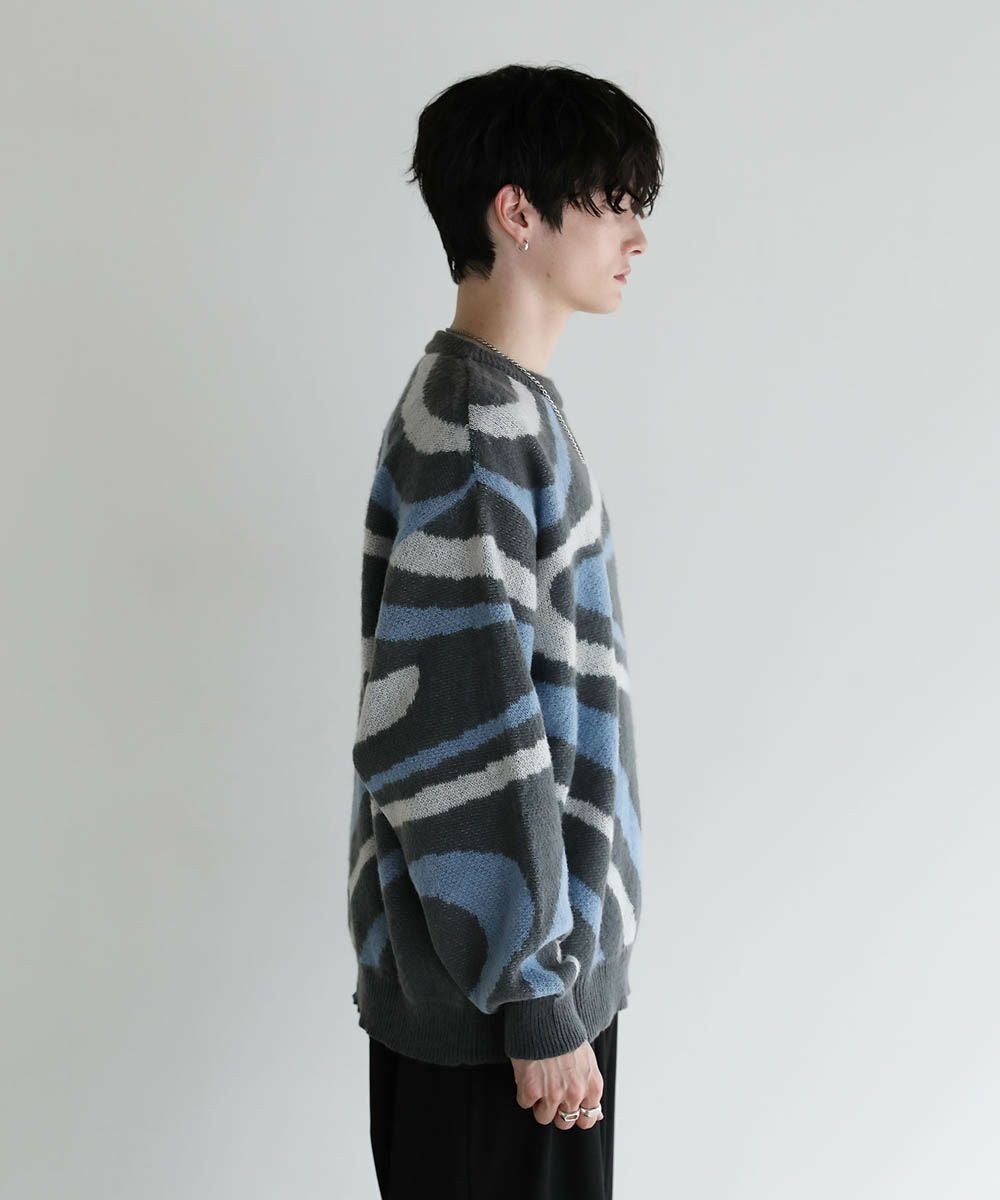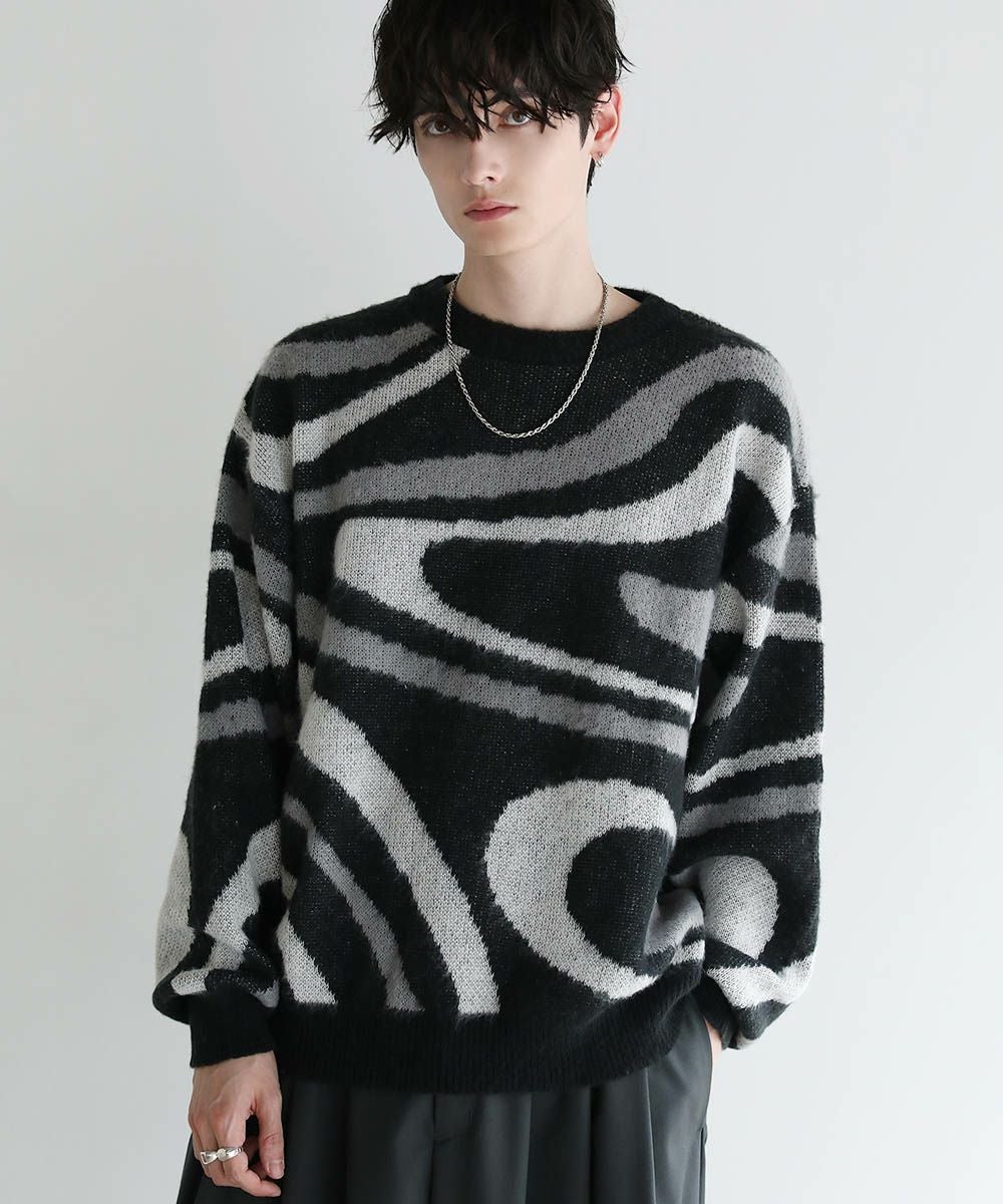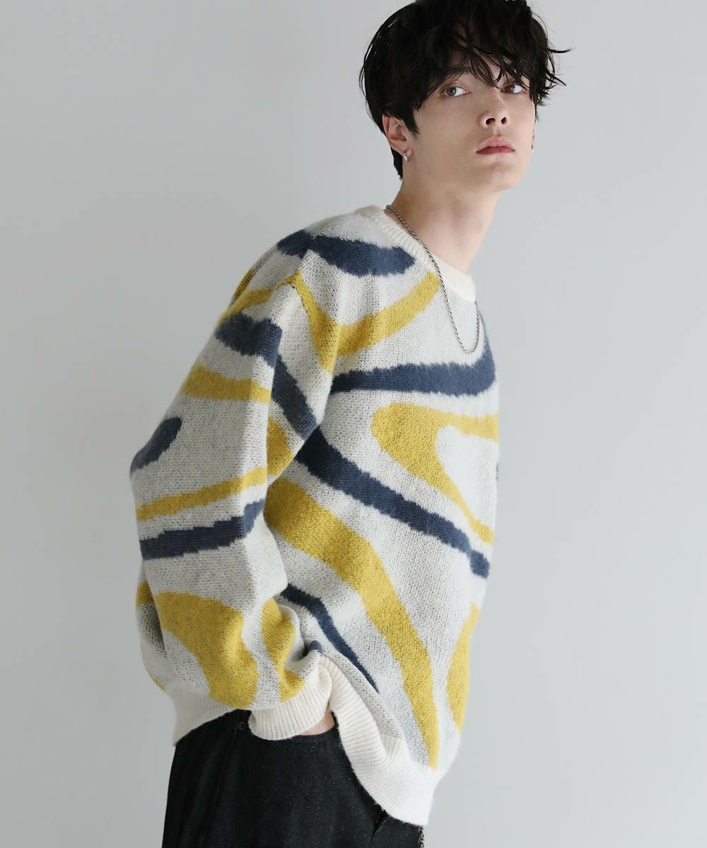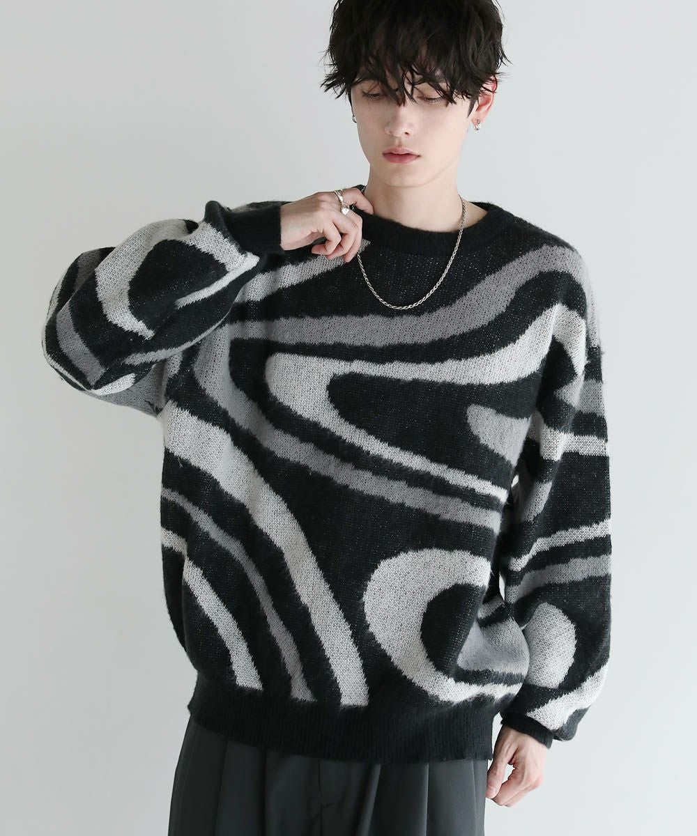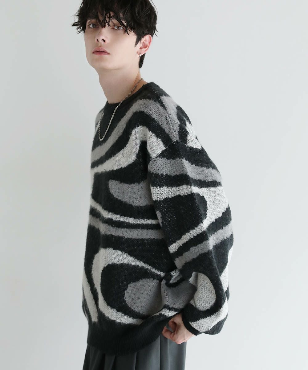 コーディネートのアクセントになるマーブル柄に、ふんわりとしたタッチが魅力のモヘアライクニット。程よい肉感のある柔らかいニットに、起毛感を出すことで表情のある生地に仕上げました。肩の落ちたドロップショルダーやワイドな身幅など、ゆとりを持たせたサイジングでリラックス感のある雰囲気。袖口や裾はリブを施し、だらしない印象にならないようメリハリを持たせました。寒くなるこれからの季節、目を惹くマーブル柄はアウターを羽織っても映えるアイテムです。