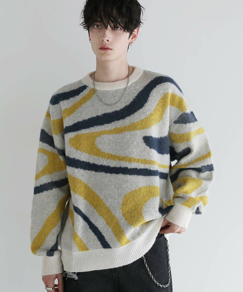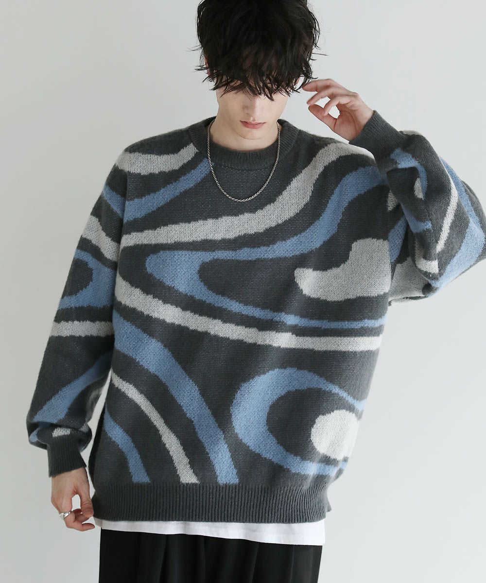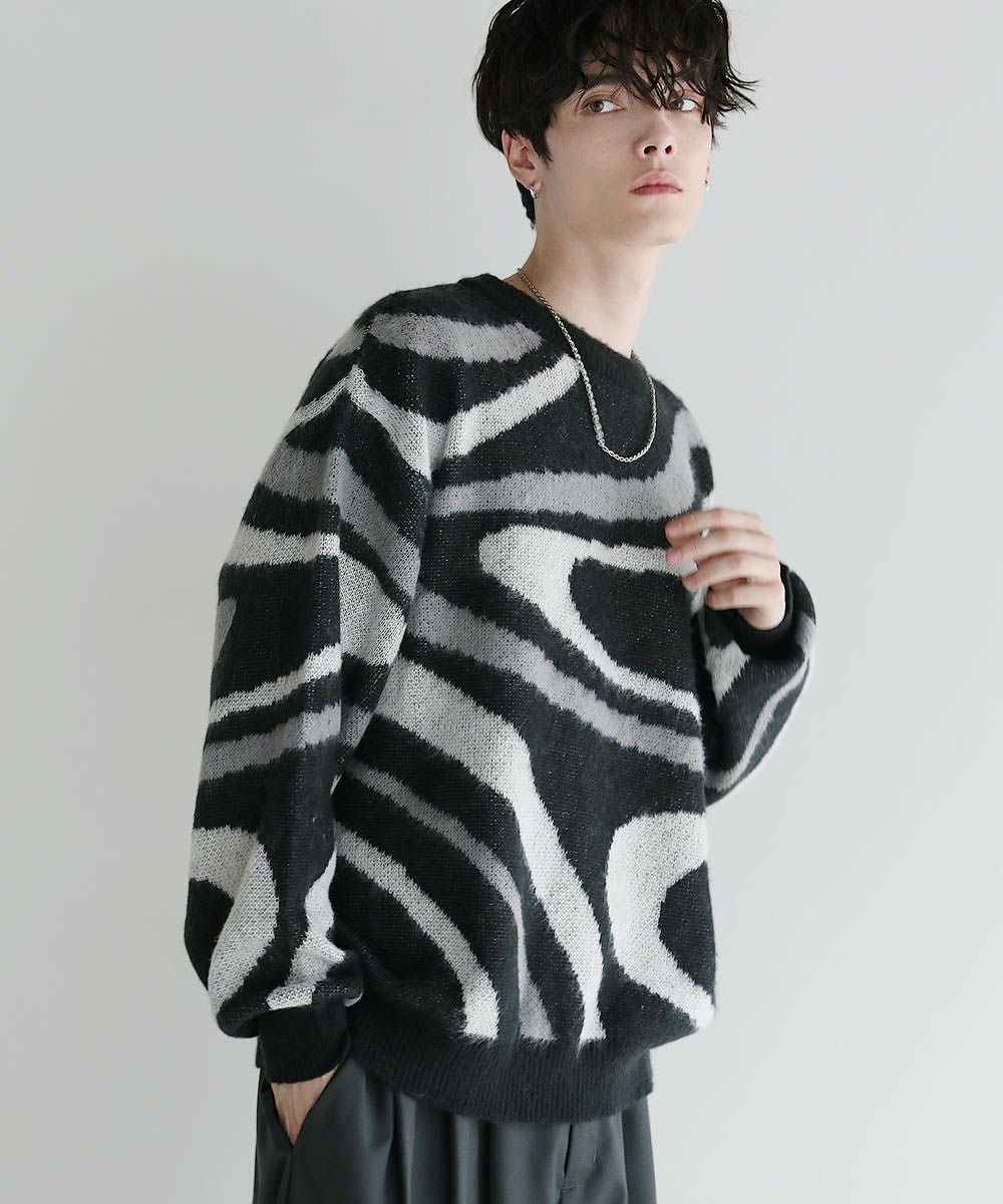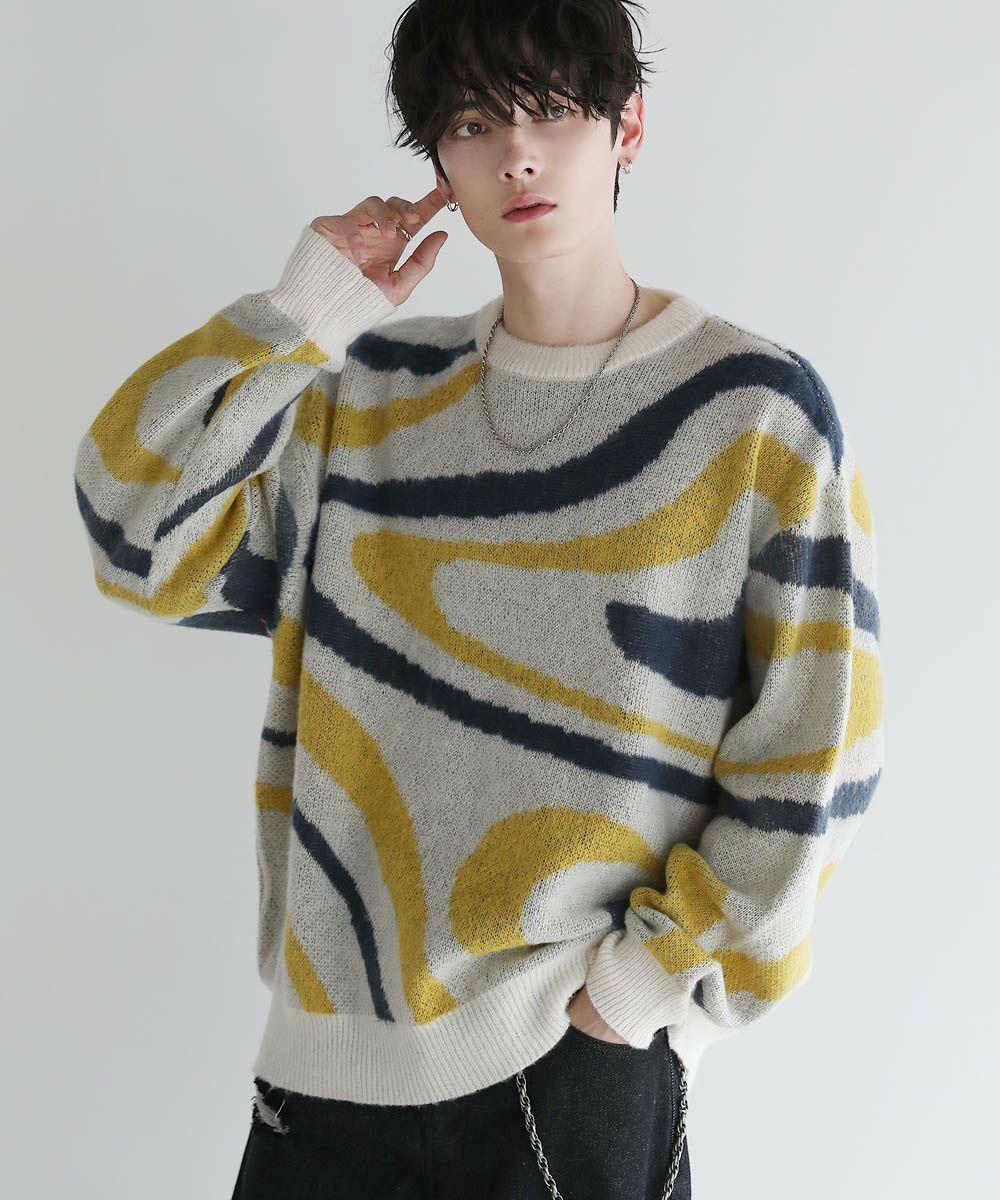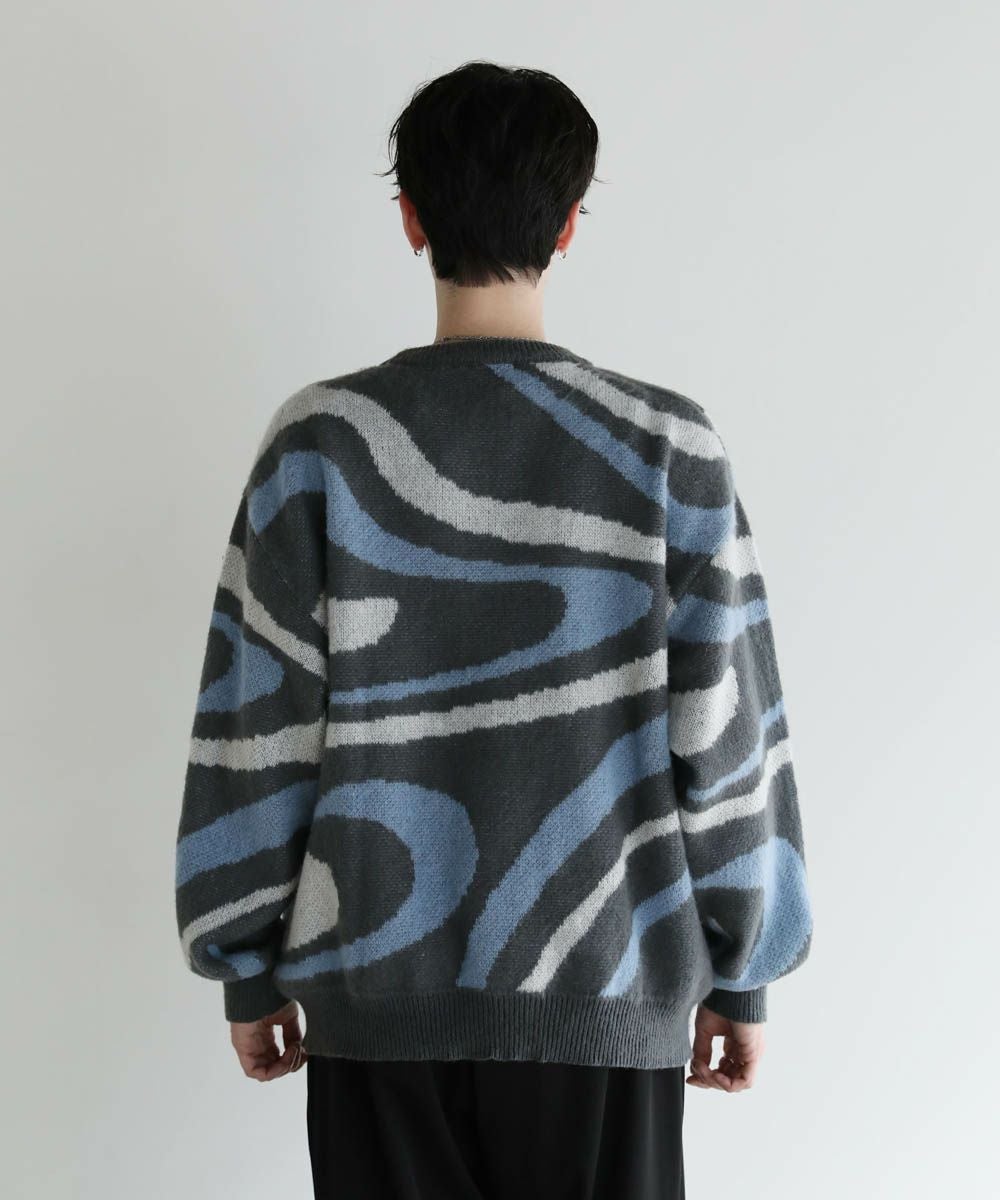 コーディネートのアクセントになるマーブル柄に、ふんわりとしたタッチが魅力のモヘアライクニット。程よい肉感のある柔らかいニットに、起毛感を出すことで表情のある生地に仕上げました。肩の落ちたドロップショルダーやワイドな身幅など、ゆとりを持たせたサイジングでリラックス感のある雰囲気。袖口や裾はリブを施し、だらしない印象にならないようメリハリを持たせました。寒くなるこれからの季節、目を惹くマーブル柄はアウターを羽織っても映えるアイテムです。