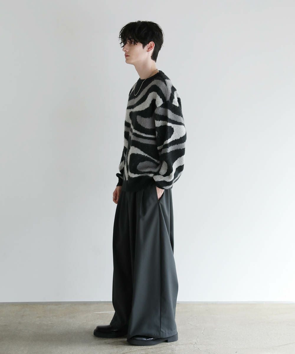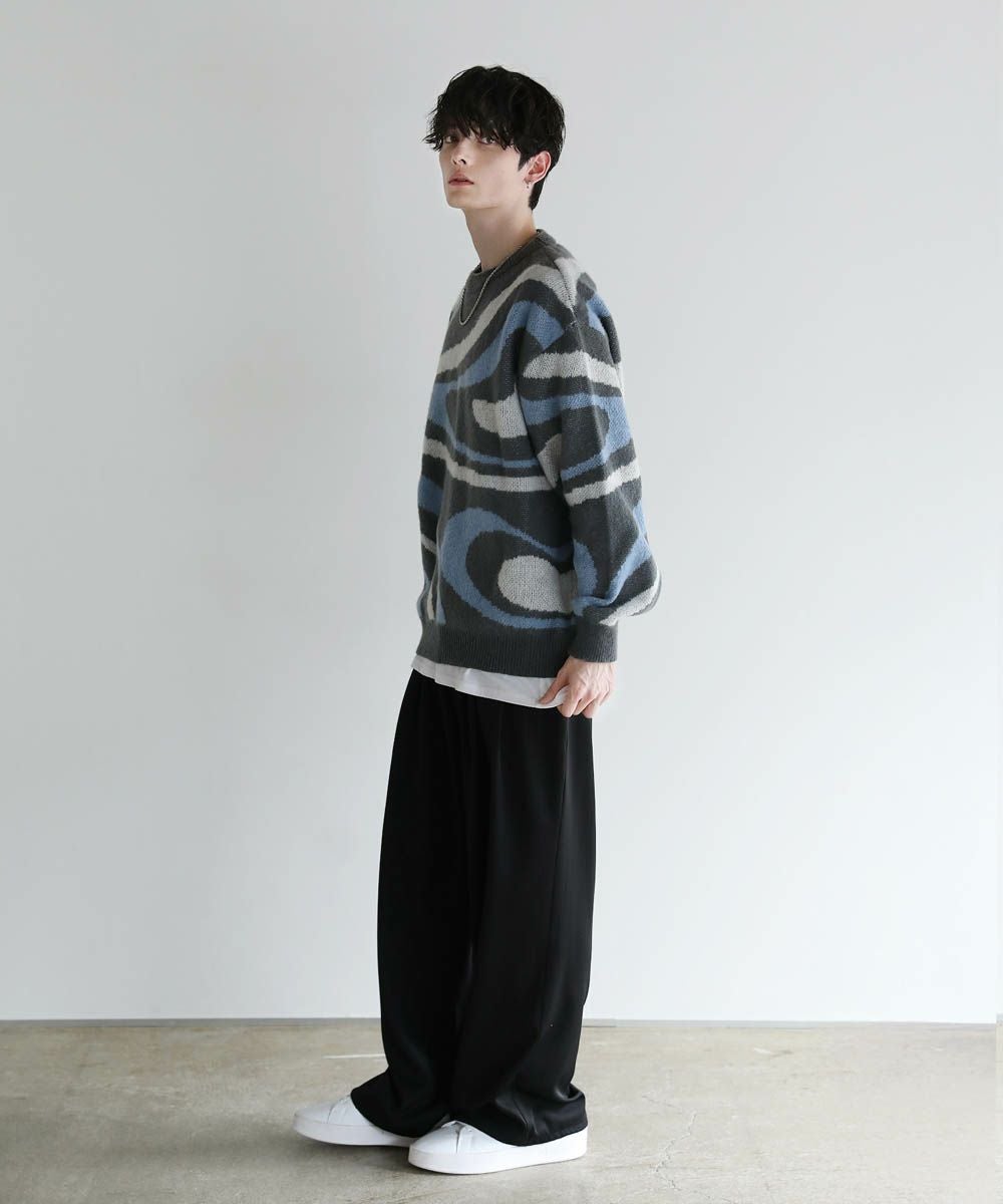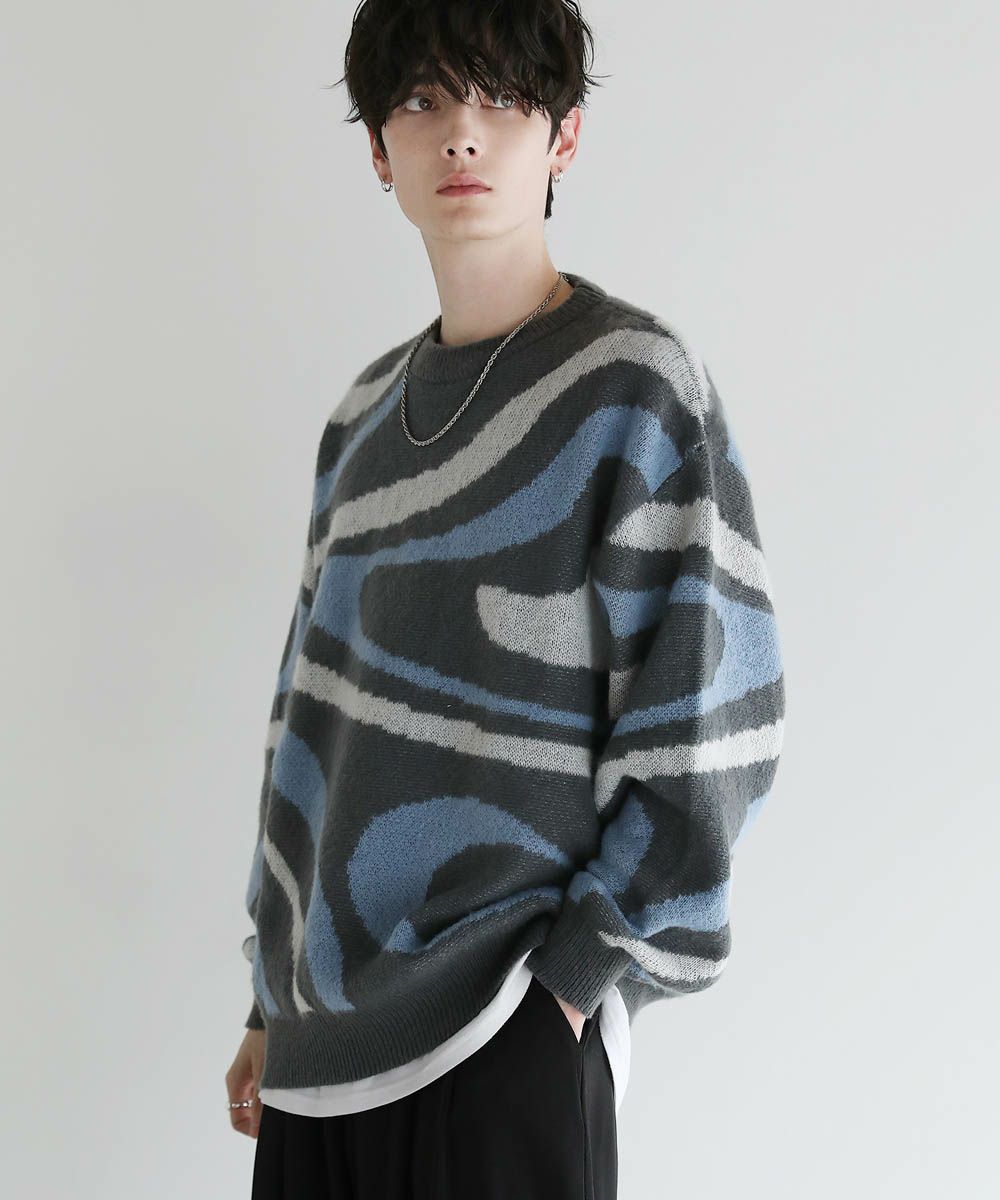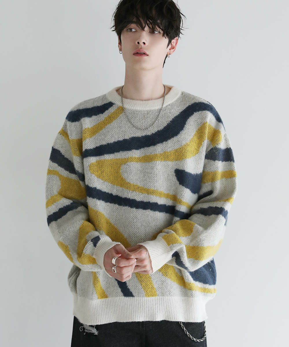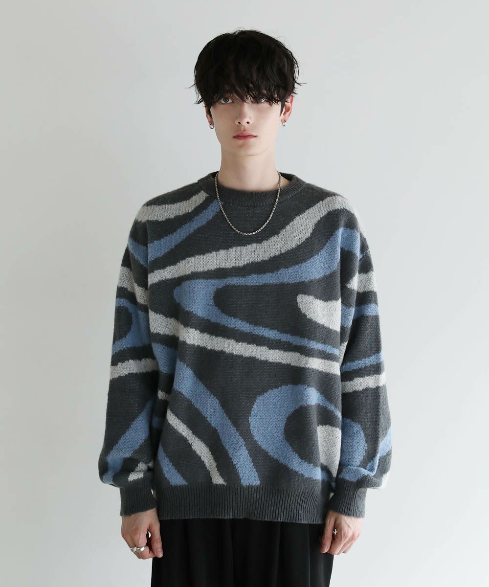 コーディネートのアクセントになるマーブル柄に、ふんわりとしたタッチが魅力のモヘアライクニット。程よい肉感のある柔らかいニットに、起毛感を出すことで表情のある生地に仕上げました。肩の落ちたドロップショルダーやワイドな身幅など、ゆとりを持たせたサイジングでリラックス感のある雰囲気。袖口や裾はリブを施し、だらしない印象にならないようメリハリを持たせました。寒くなるこれからの季節、目を惹くマーブル柄はアウターを羽織っても映えるアイテムです。