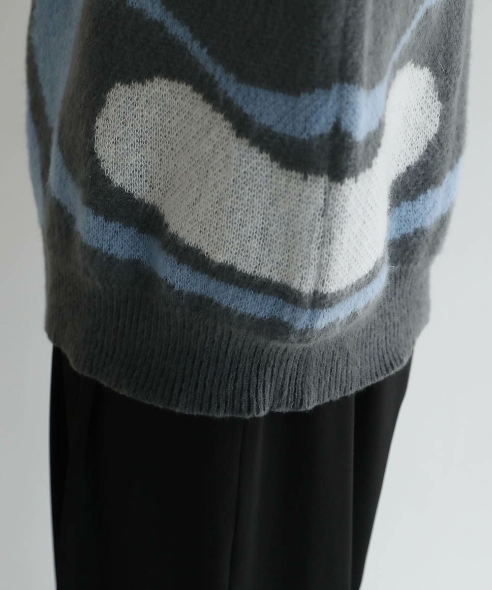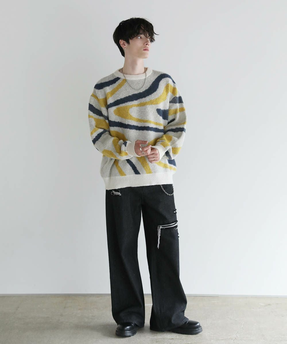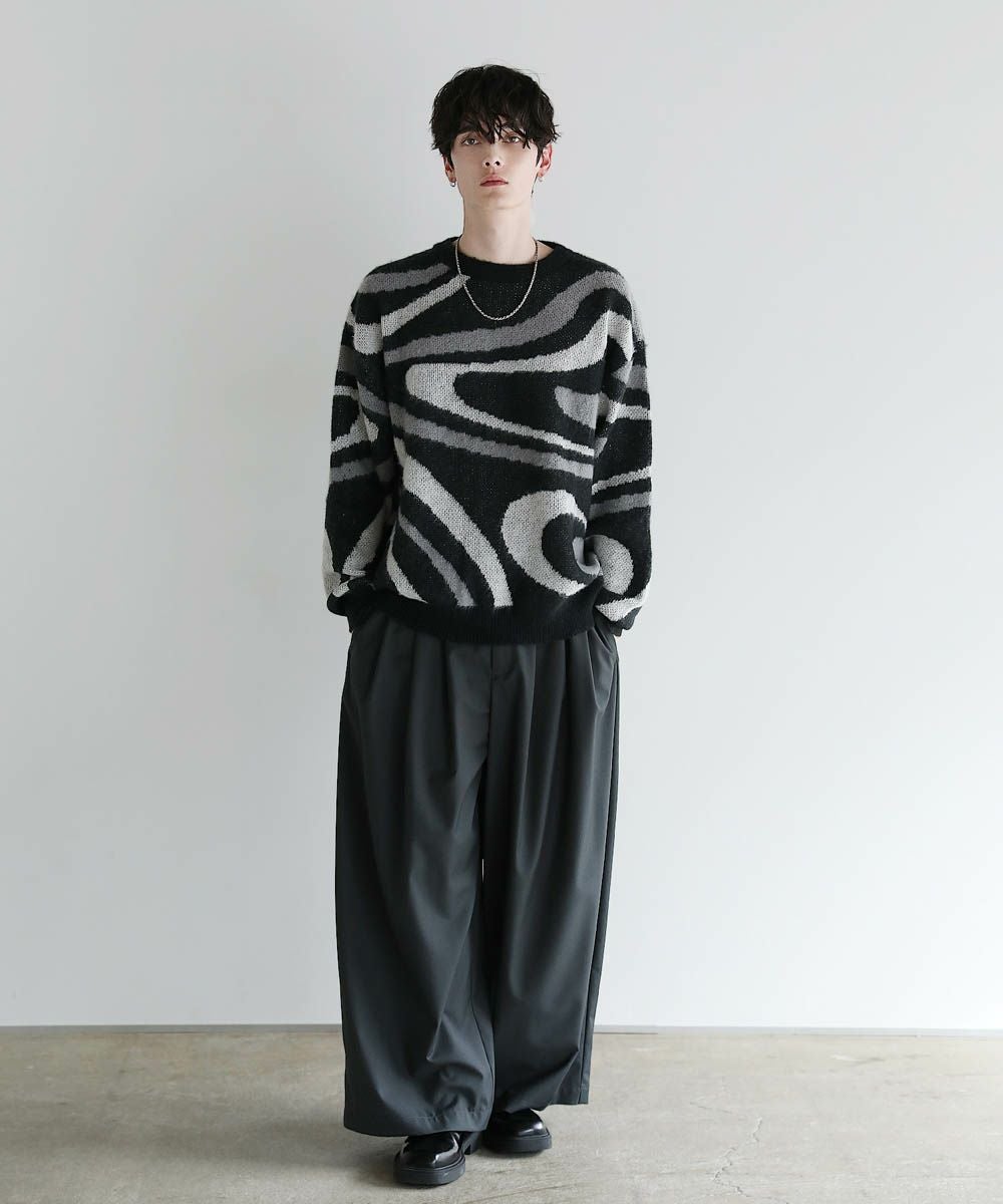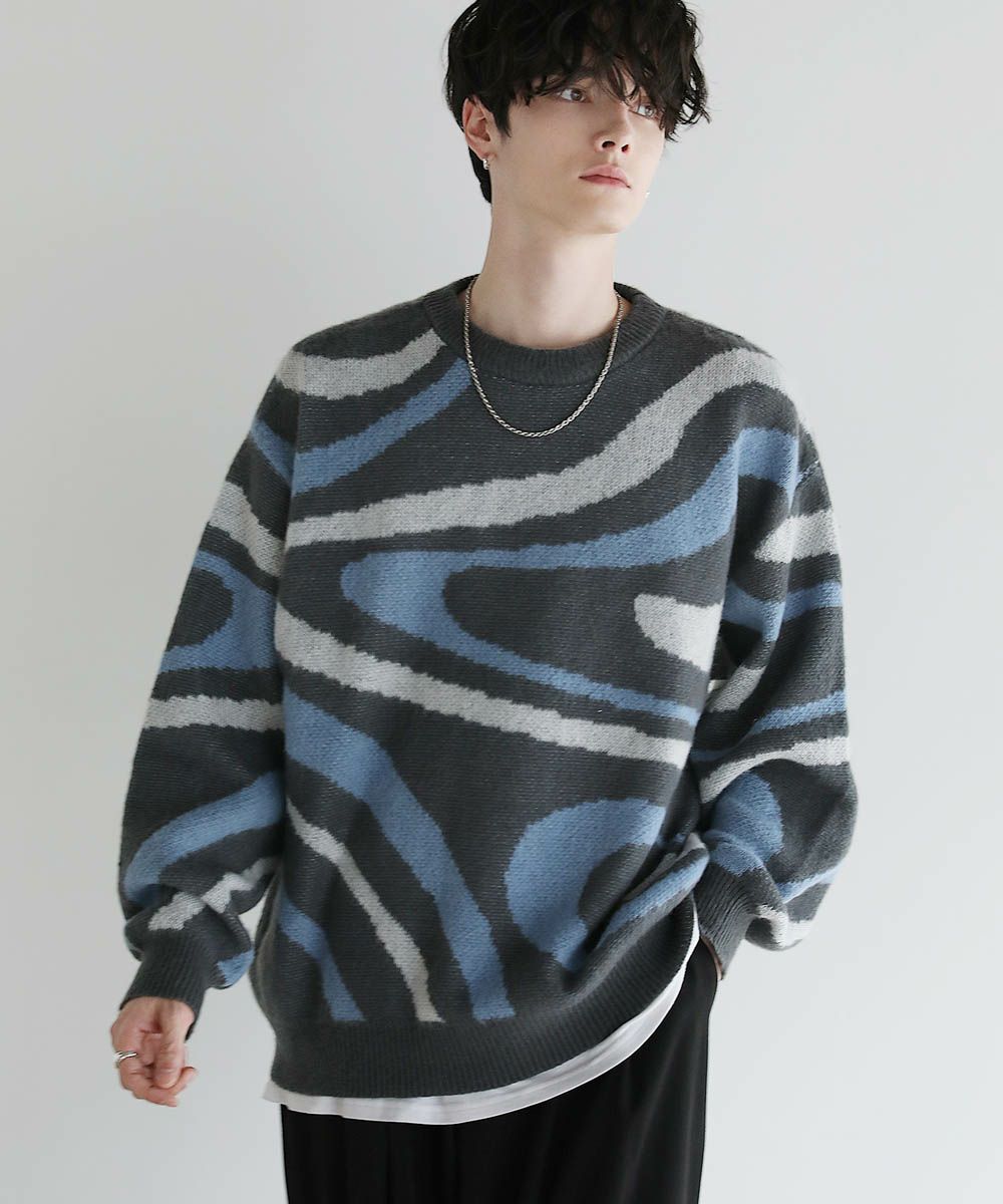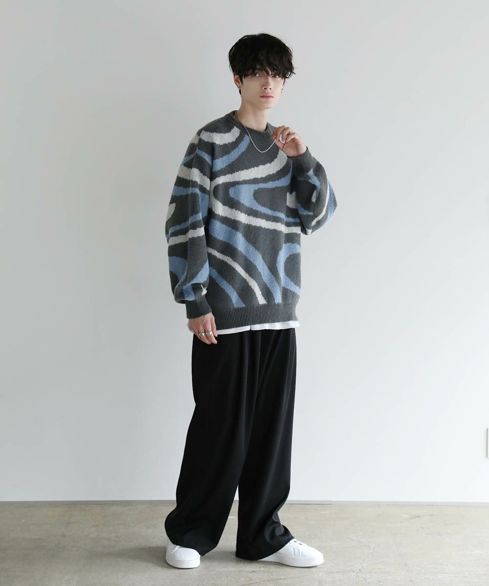 コーディネートのアクセントになるマーブル柄に、ふんわりとしたタッチが魅力のモヘアライクニット。程よい肉感のある柔らかいニットに、起毛感を出すことで表情のある生地に仕上げました。肩の落ちたドロップショルダーやワイドな身幅など、ゆとりを持たせたサイジングでリラックス感のある雰囲気。袖口や裾はリブを施し、だらしない印象にならないようメリハリを持たせました。寒くなるこれからの季節、目を惹くマーブル柄はアウターを羽織っても映えるアイテムです。