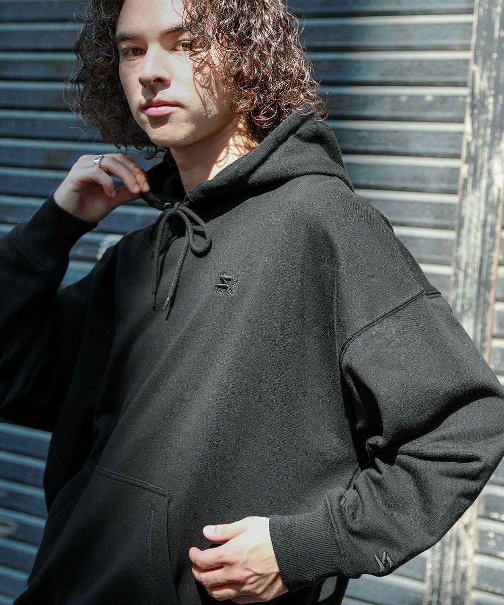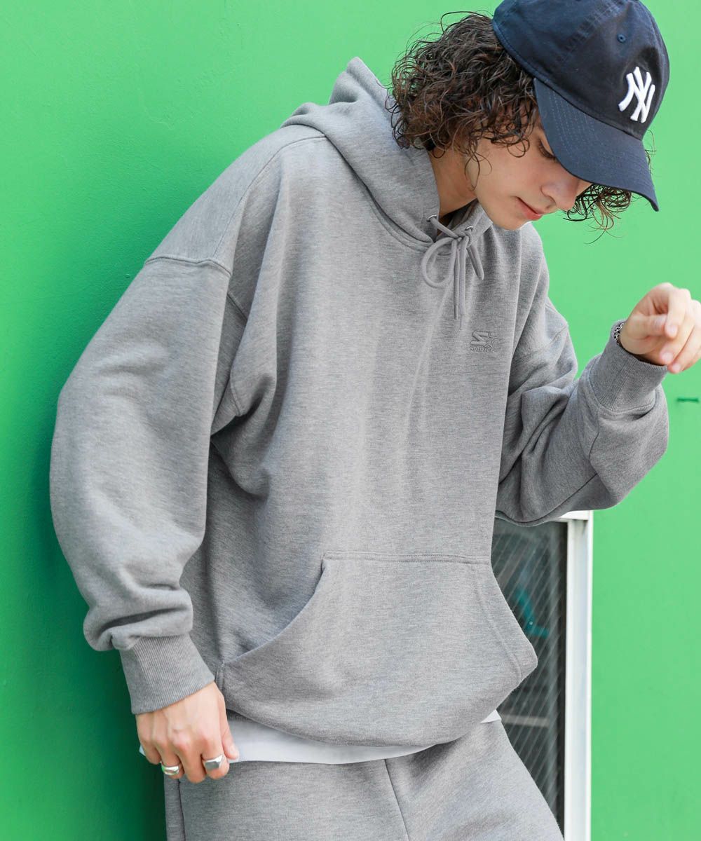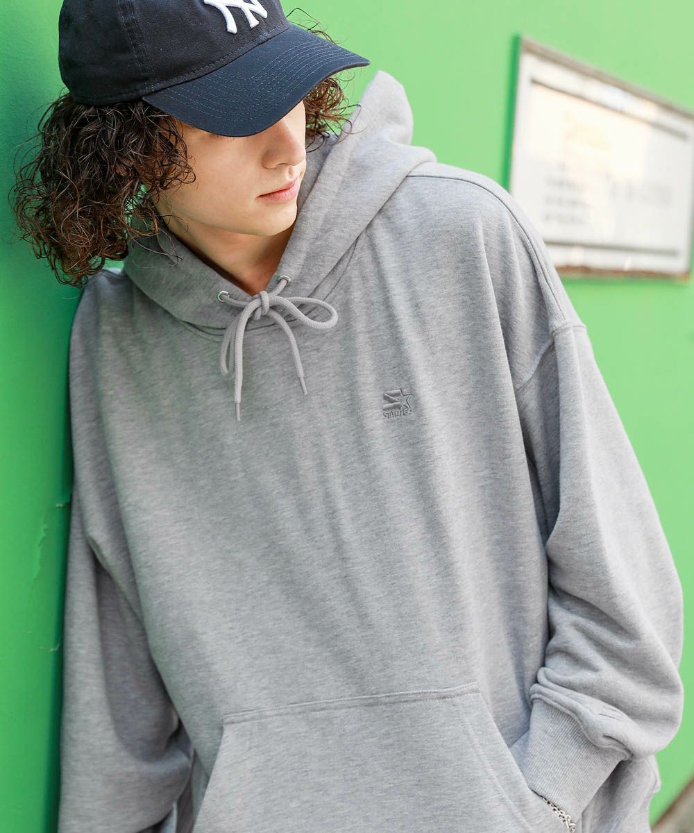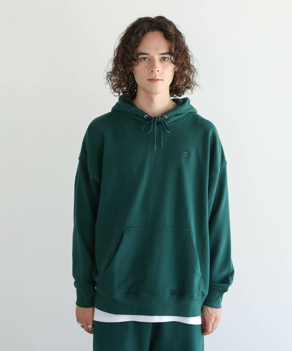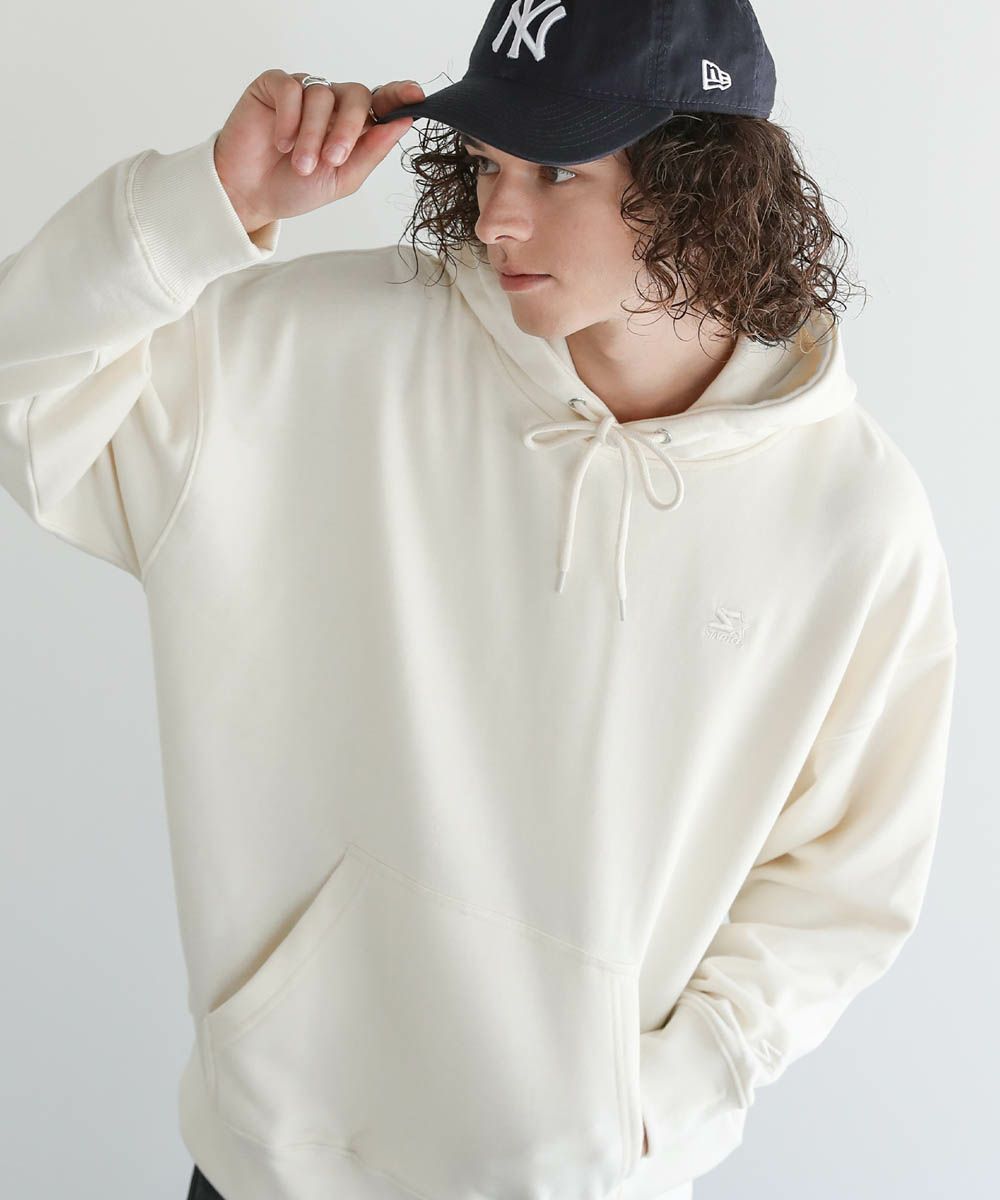 STARTERの刺繍ロゴがポイントのプルパーカー。柔らかな素材とビッグシルエットで、ストレスフリーな着心地にこだわった1着です。胸元と左袖のSTARTERの刺繍ロゴは生地と同色になっており、さりげないアクセントに。シンプルで着回しのしやすい、着回しに重宝するアイテムです。