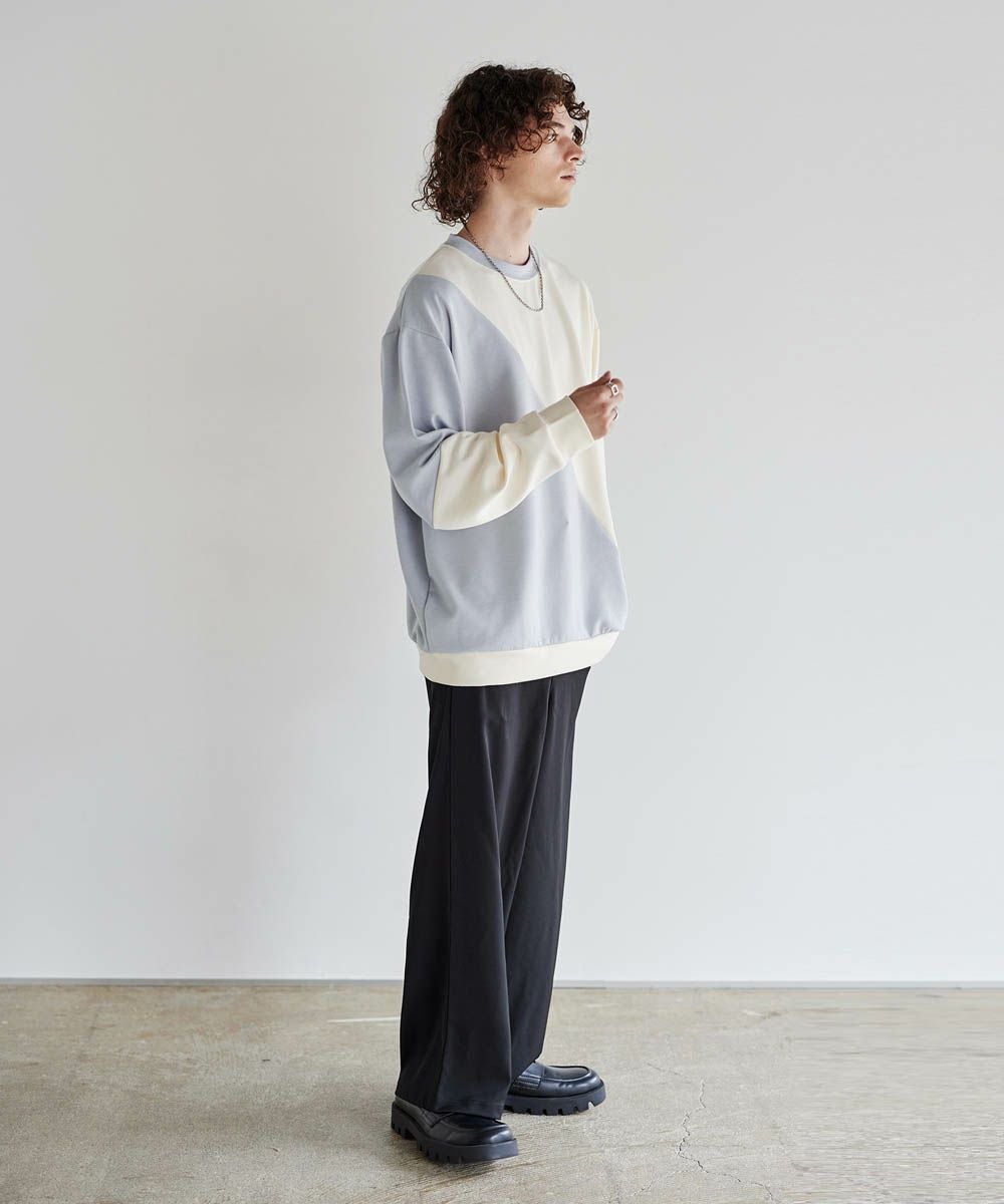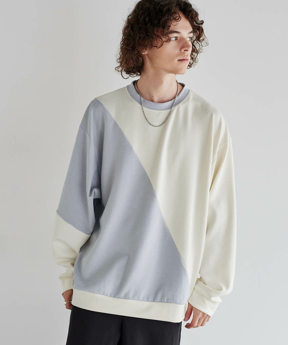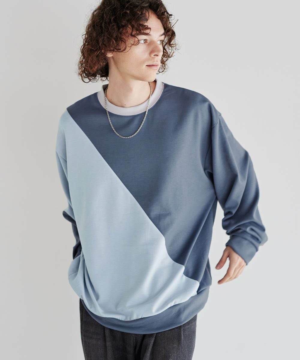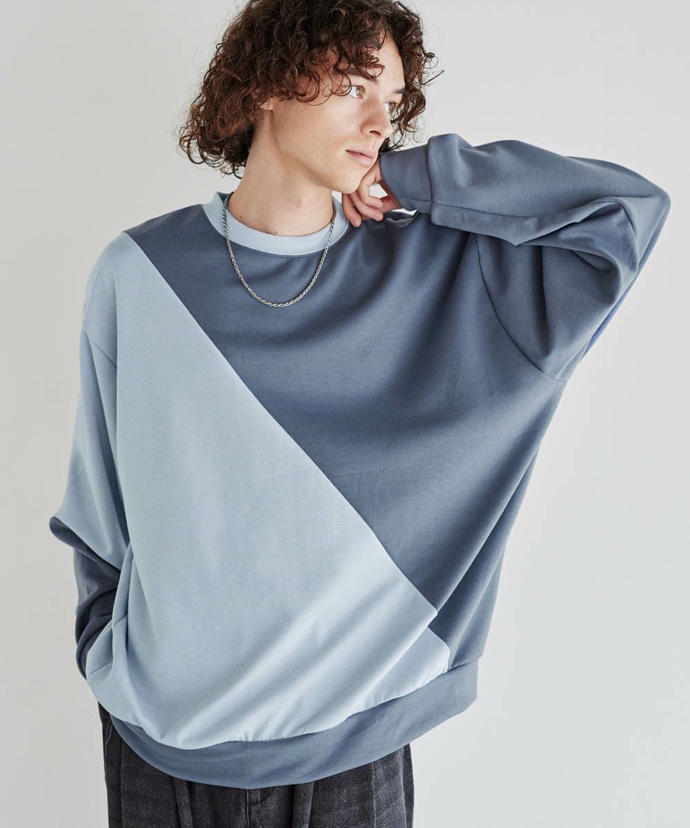 バイカラーの大胆な切替デザインが印象的で、コーディネートのアクセントになります。インパクトのあるデザインですが、柔らかな色合いのため、大人のカジュアルコーデにぴったりのアイテム。首元は緩すぎず詰まりすぎていない、着心地の良いクルーネックに。ゆったりとしたオーバーサイズシルエットで、窮屈感なくラフに着られる一着となっています。