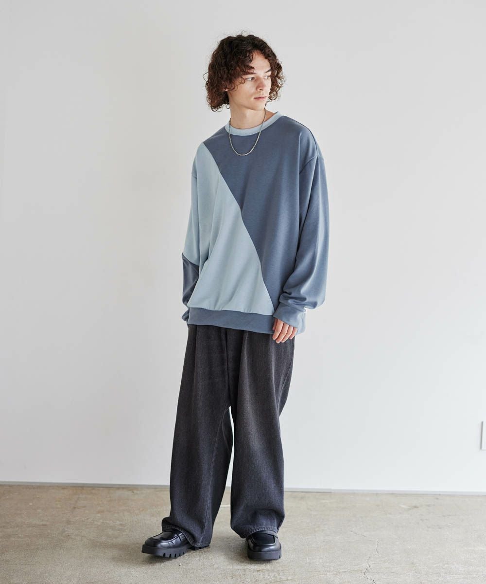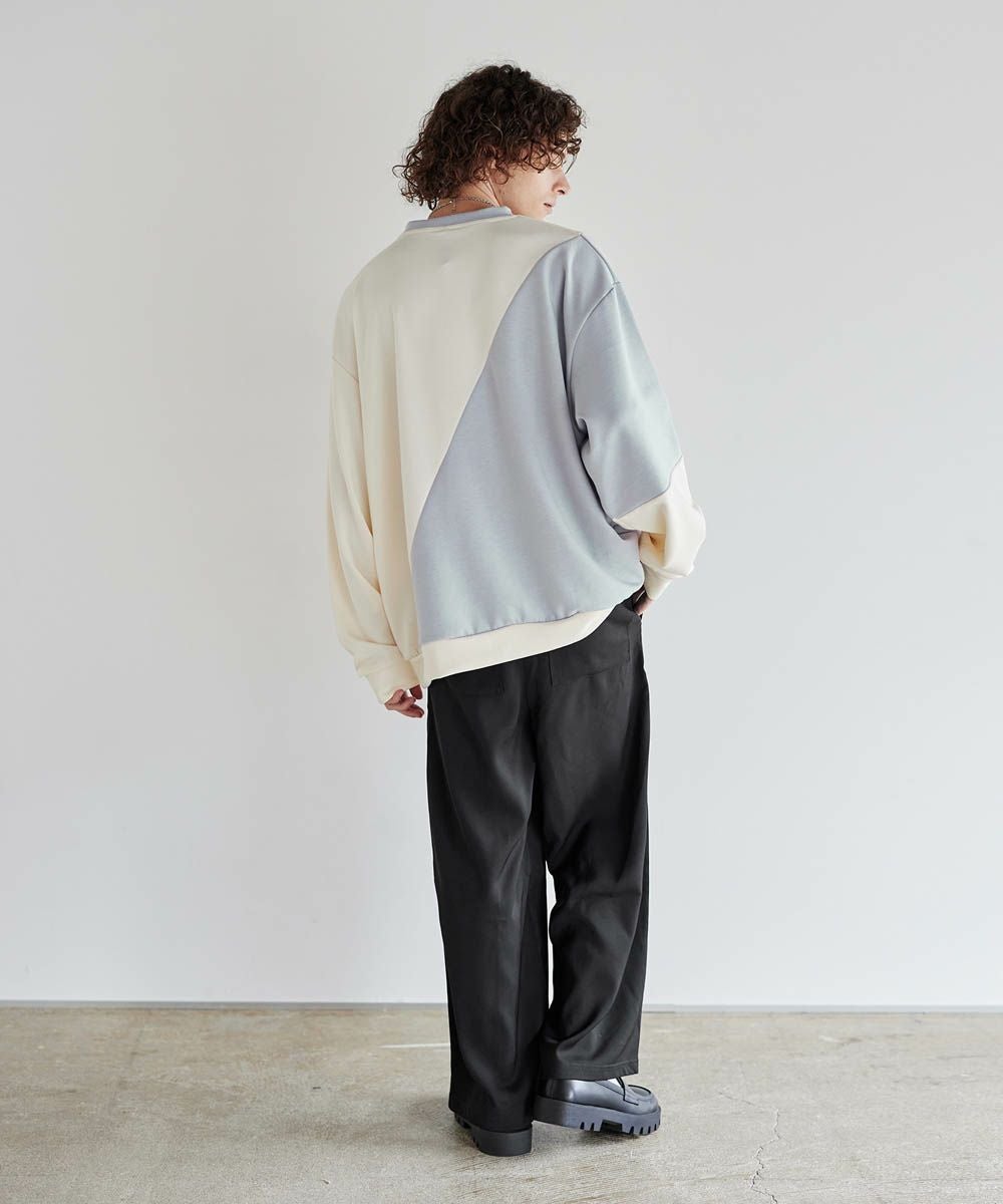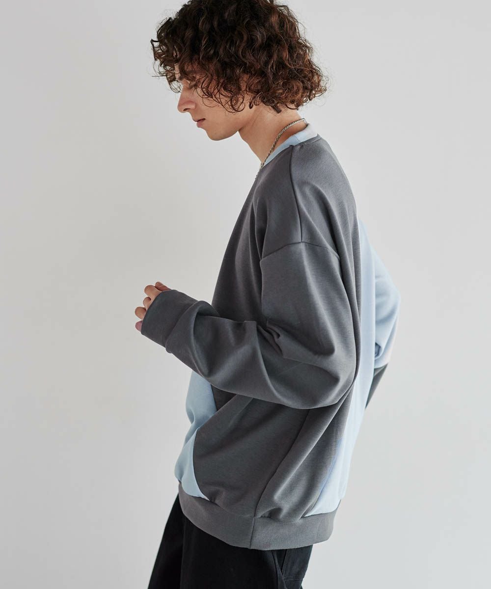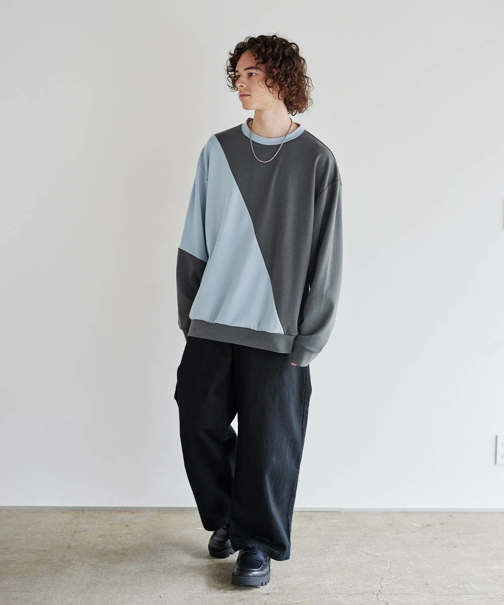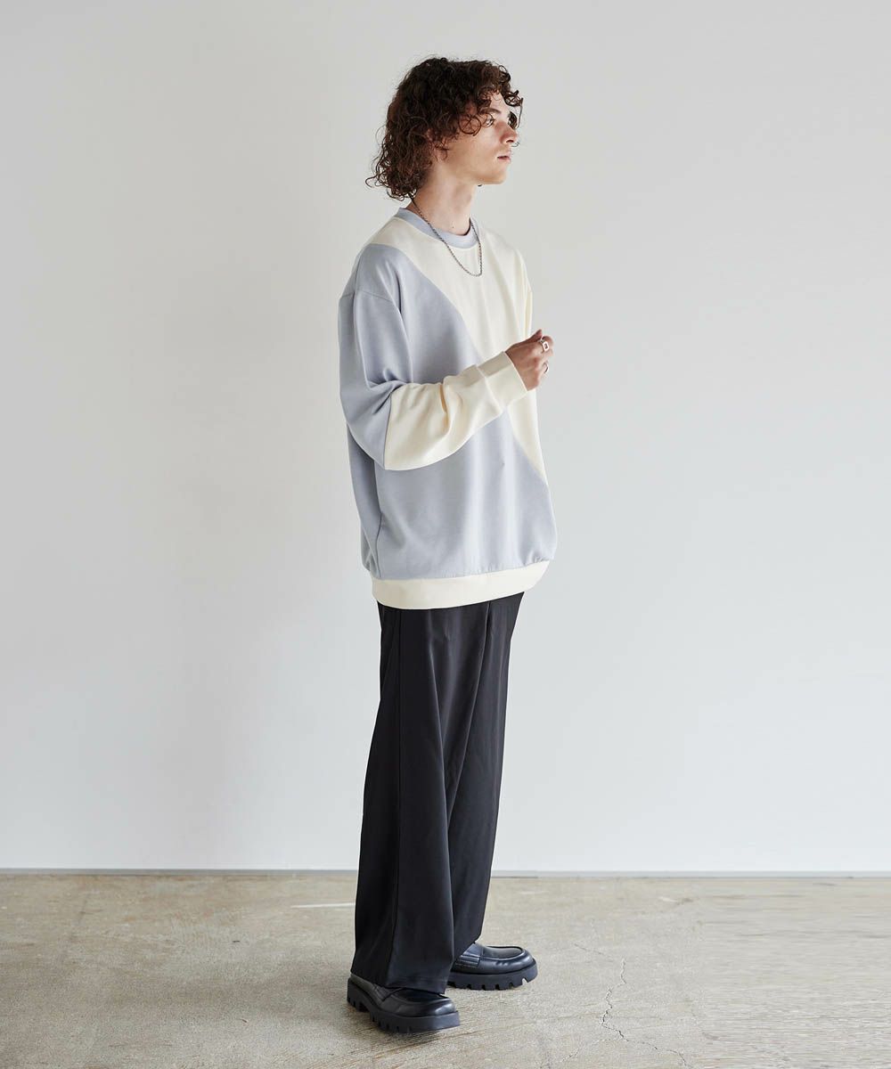 バイカラーの大胆な切替デザインが印象的で、コーディネートのアクセントになります。インパクトのあるデザインですが、柔らかな色合いのため、大人のカジュアルコーデにぴったりのアイテム。首元は緩すぎず詰まりすぎていない、着心地の良いクルーネックに。ゆったりとしたオーバーサイズシルエットで、窮屈感なくラフに着られる一着となっています。