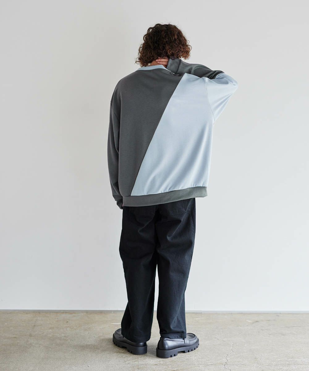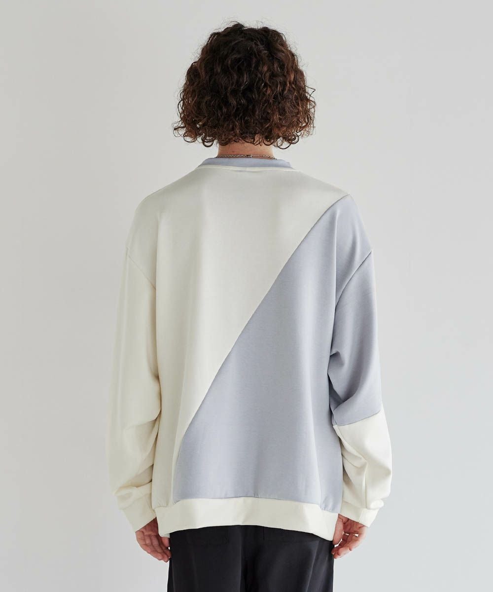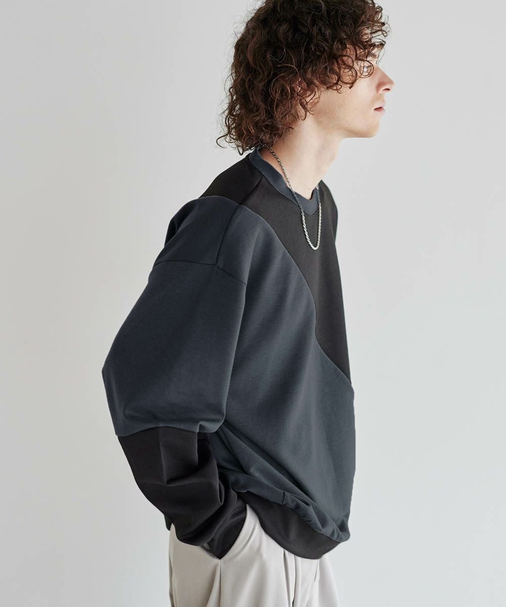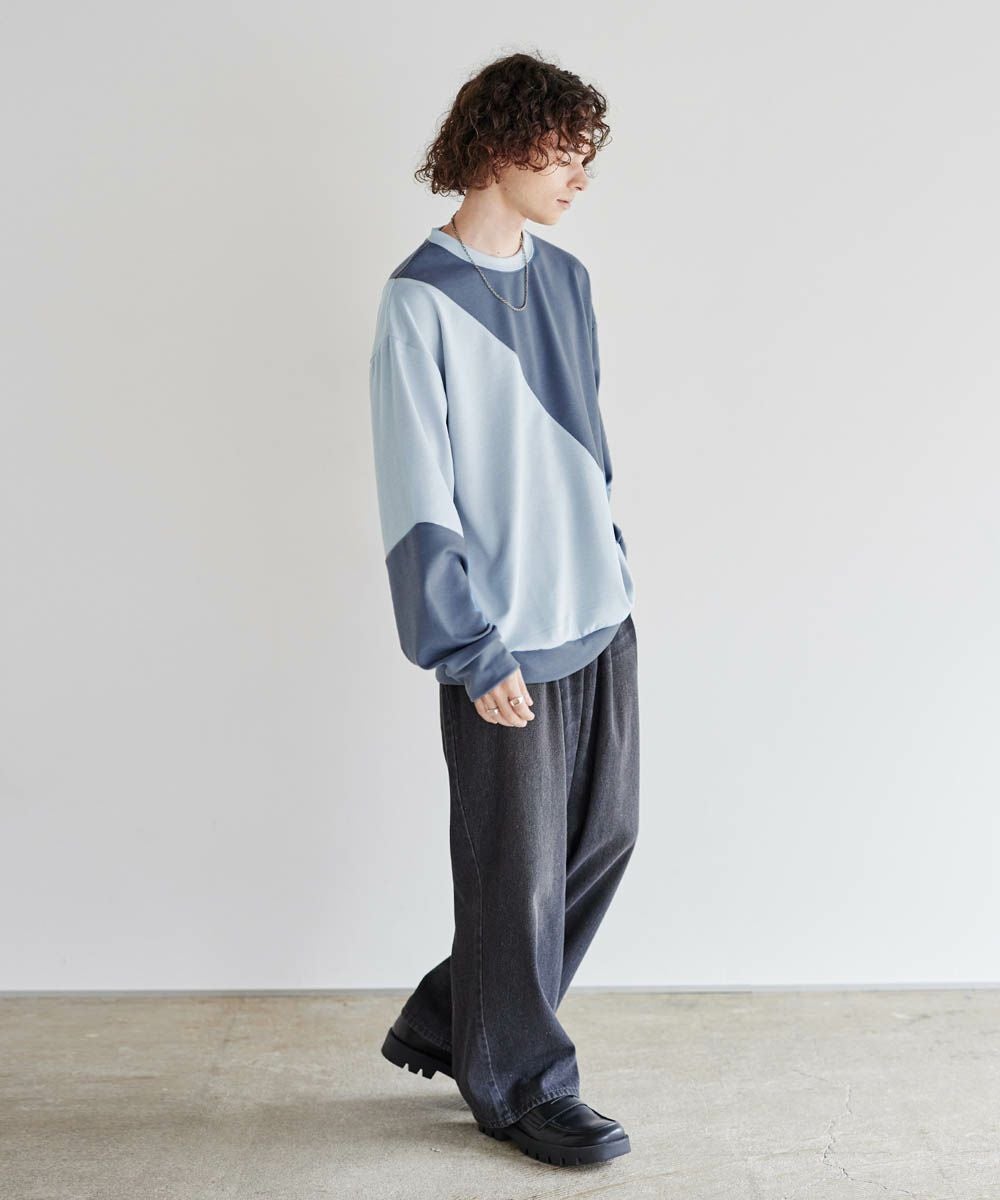 バイカラーの大胆な切替デザインが印象的で、コーディネートのアクセントになります。インパクトのあるデザインですが、柔らかな色合いのため、大人のカジュアルコーデにぴったりのアイテム。首元は緩すぎず詰まりすぎていない、着心地の良いクルーネックに。ゆったりとしたオーバーサイズシルエットで、窮屈感なくラフに着られる一着となっています。