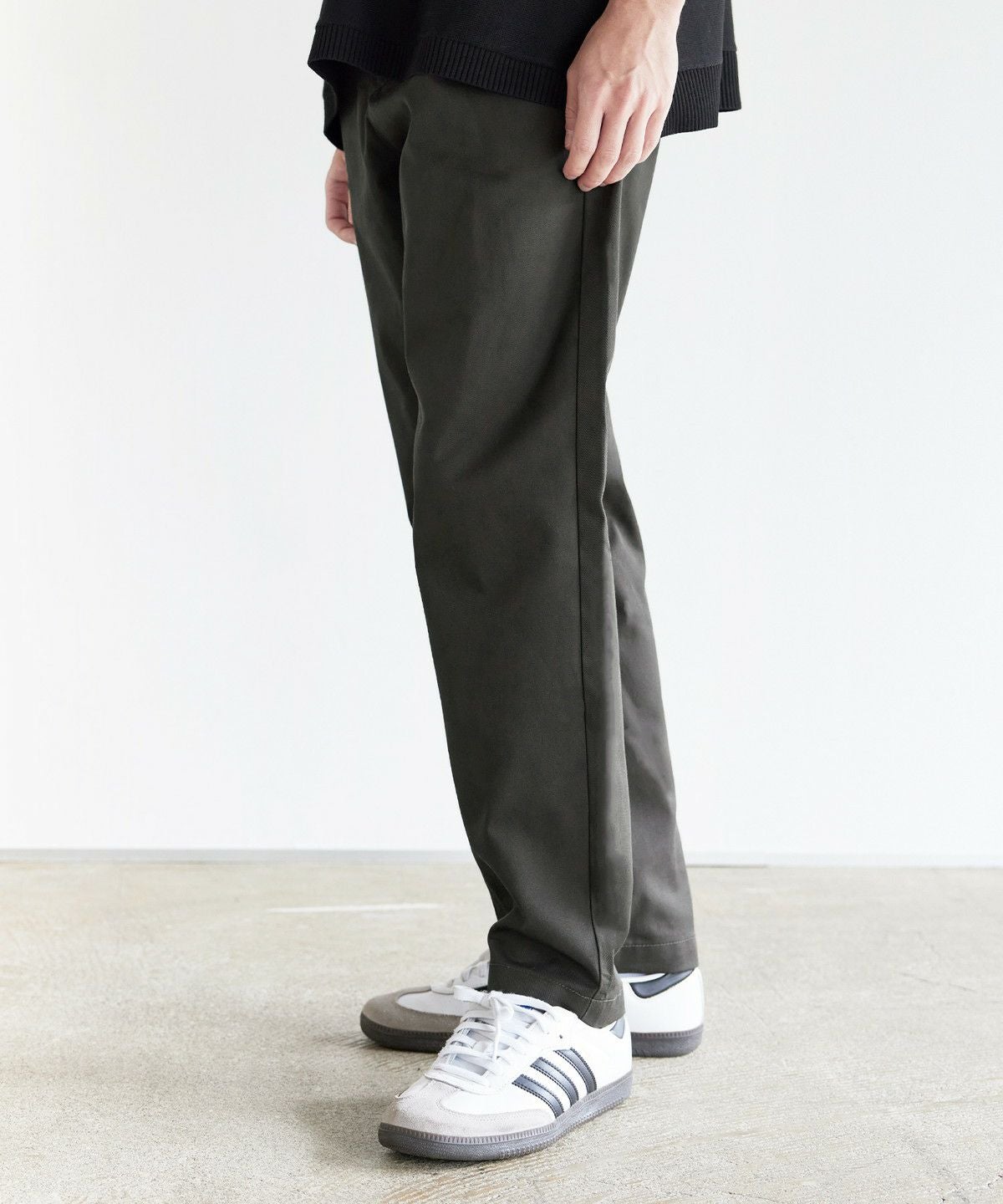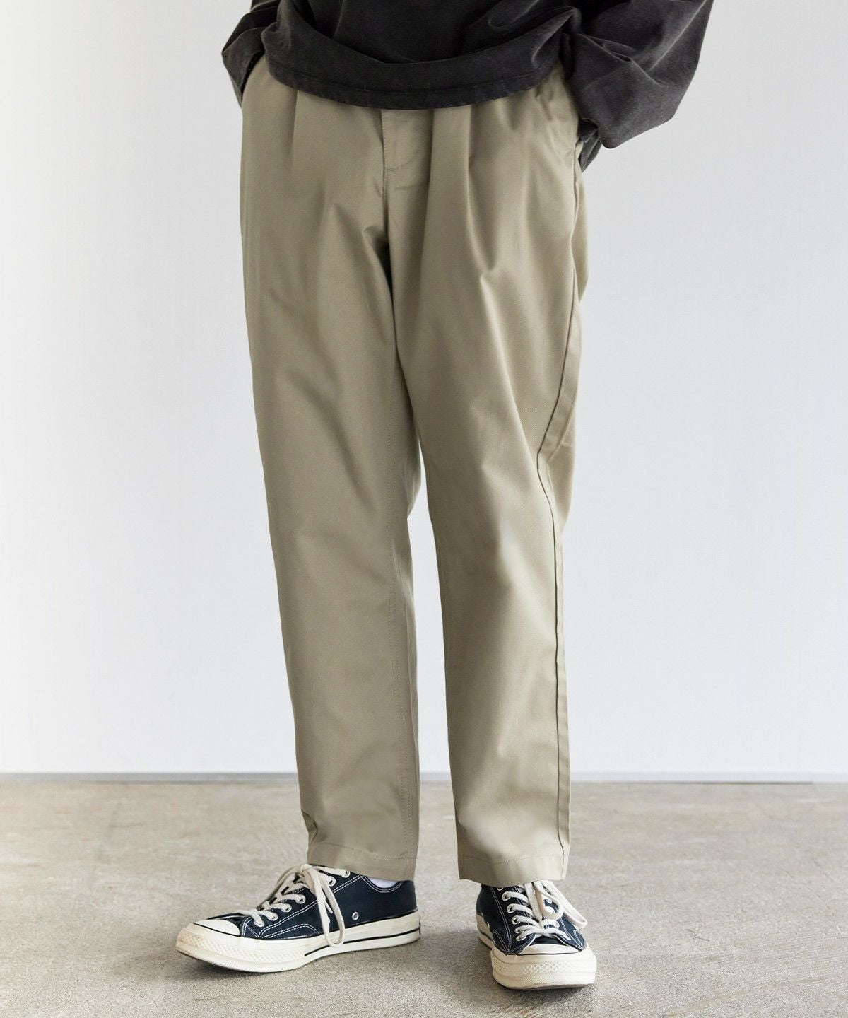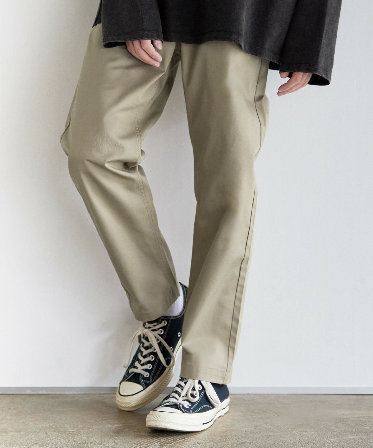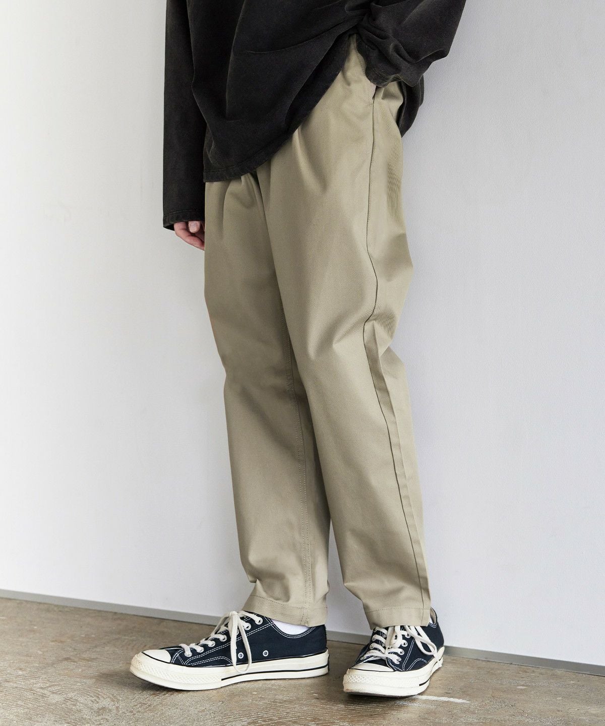 ツイル生地と、デニム生地の2種類をご用意しました。ツイル生地ののブラック、チャコール、ベージュ、カーキは、ナチュラルな風合いの綿と摩擦に強いポリエステル糸を混紡したT/Cツイル素材を使用。型崩れが少なく、耐久性に優れたタフな生地でデイリーに穿きこなせます。デニム生地のブラック系、ブルー系は、適度な厚みを持たせつつも、綿100%で柔らかな生地感です。肌なじみの良い素材で、穿き込むほどに風合いが増すのも魅力。程よい厚みのためロングシーズンご着用いただけます。