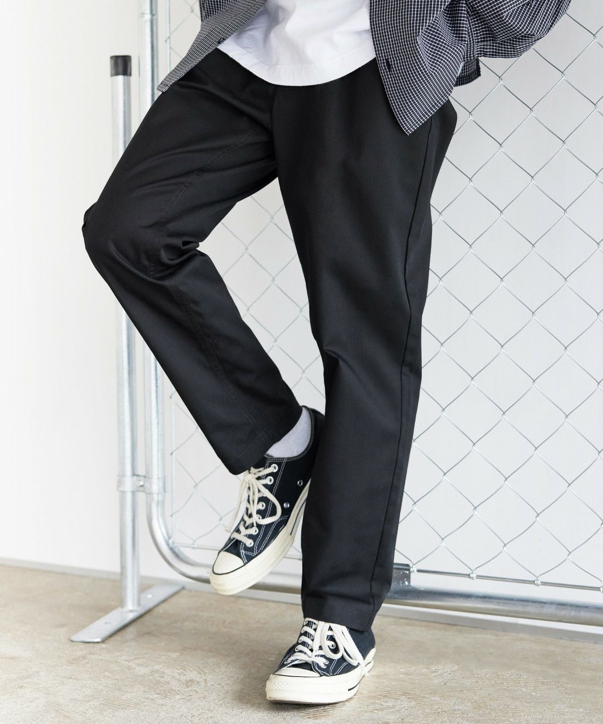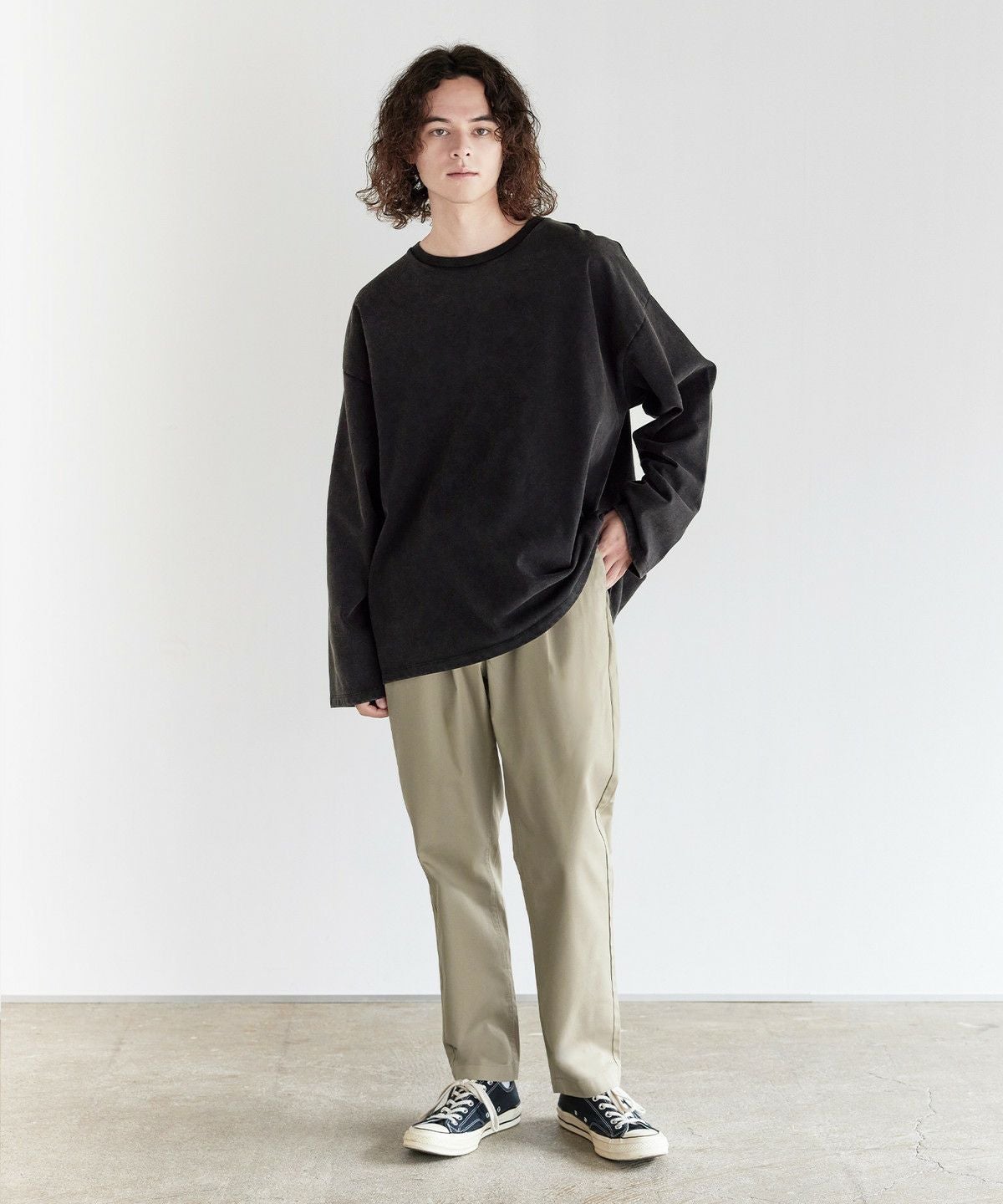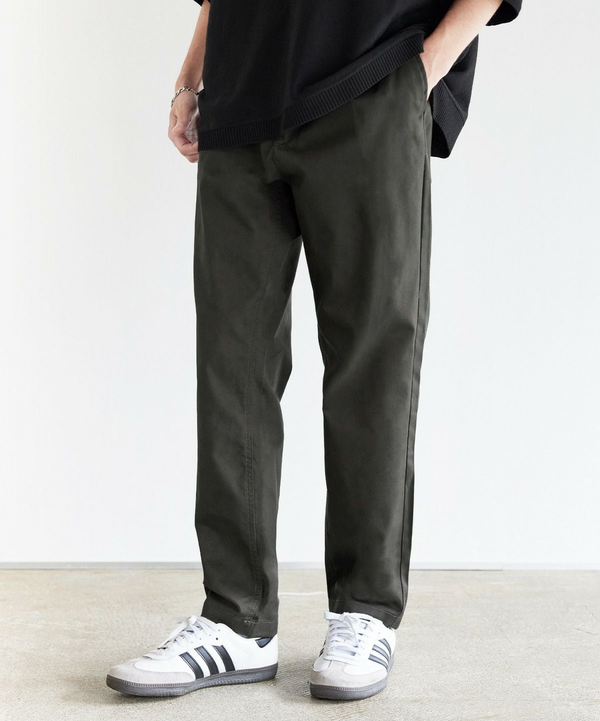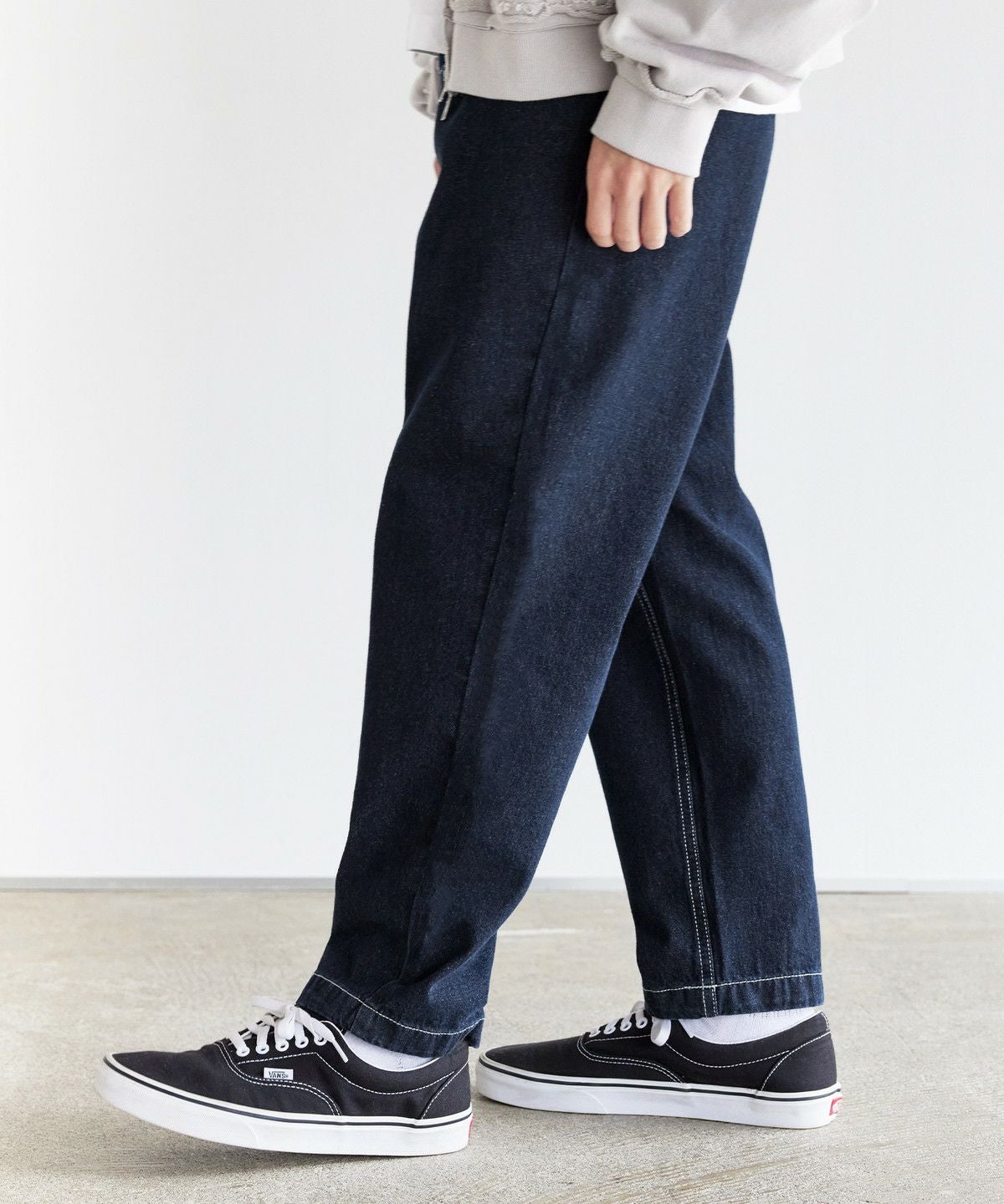 ツイル生地と、デニム生地の2種類をご用意しました。ツイル生地ののブラック、チャコール、ベージュ、カーキは、ナチュラルな風合いの綿と摩擦に強いポリエステル糸を混紡したT/Cツイル素材を使用。型崩れが少なく、耐久性に優れたタフな生地でデイリーに穿きこなせます。デニム生地のブラック系、ブルー系は、適度な厚みを持たせつつも、綿100%で柔らかな生地感です。肌なじみの良い素材で、穿き込むほどに風合いが増すのも魅力。程よい厚みのためロングシーズンご着用いただけます。