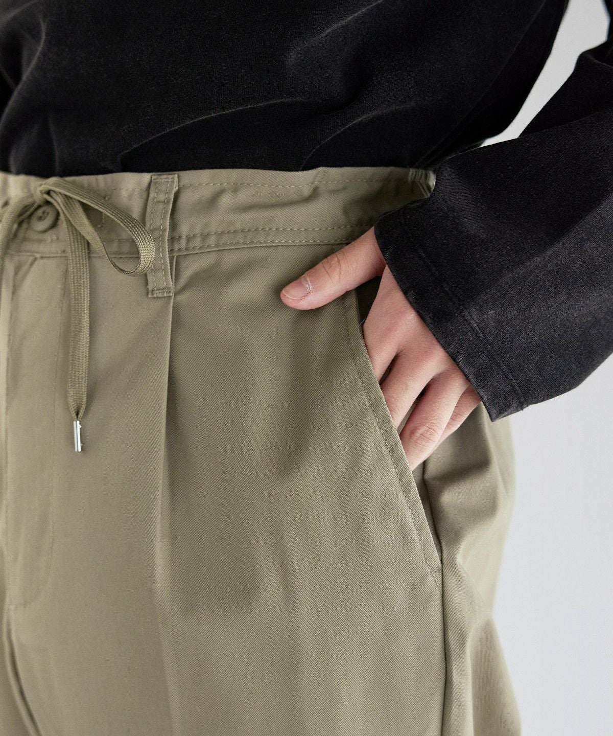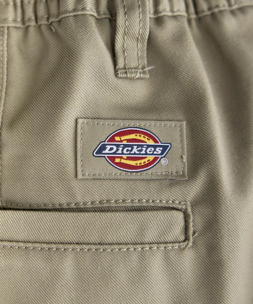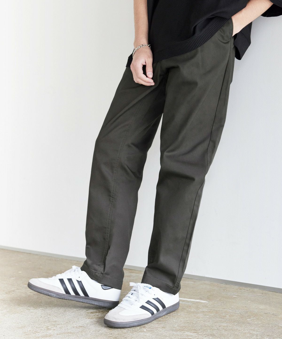 ゆとりを持たせたシルエットと、ストレスフリーな穿き心地が魅力のテーパードパンツ。フロントには深めのタックを入れることにより、立体感をプラスしました。腰周りにゆとりを持たせつつ、裾にかけてやや細くなるテーパードシルエットですっきりとした印象で穿きこなせます。ウエストは後ろ側にゴム、内側に調節紐を施したイージー仕様になっており、紐は内側にしまっても外に出してもサマになる2WAYの着こなしが可能。さらに、ベルトループを備えているため、タックインスタイルもかっこよくキマります。無駄を省いたシンプルなデザインながら、バックに施したブランドロゴがさりげないアクセントに。ディッキーズならではのタフな生地感とベーシックなデザインでヘビロテ必至のアイテムです。