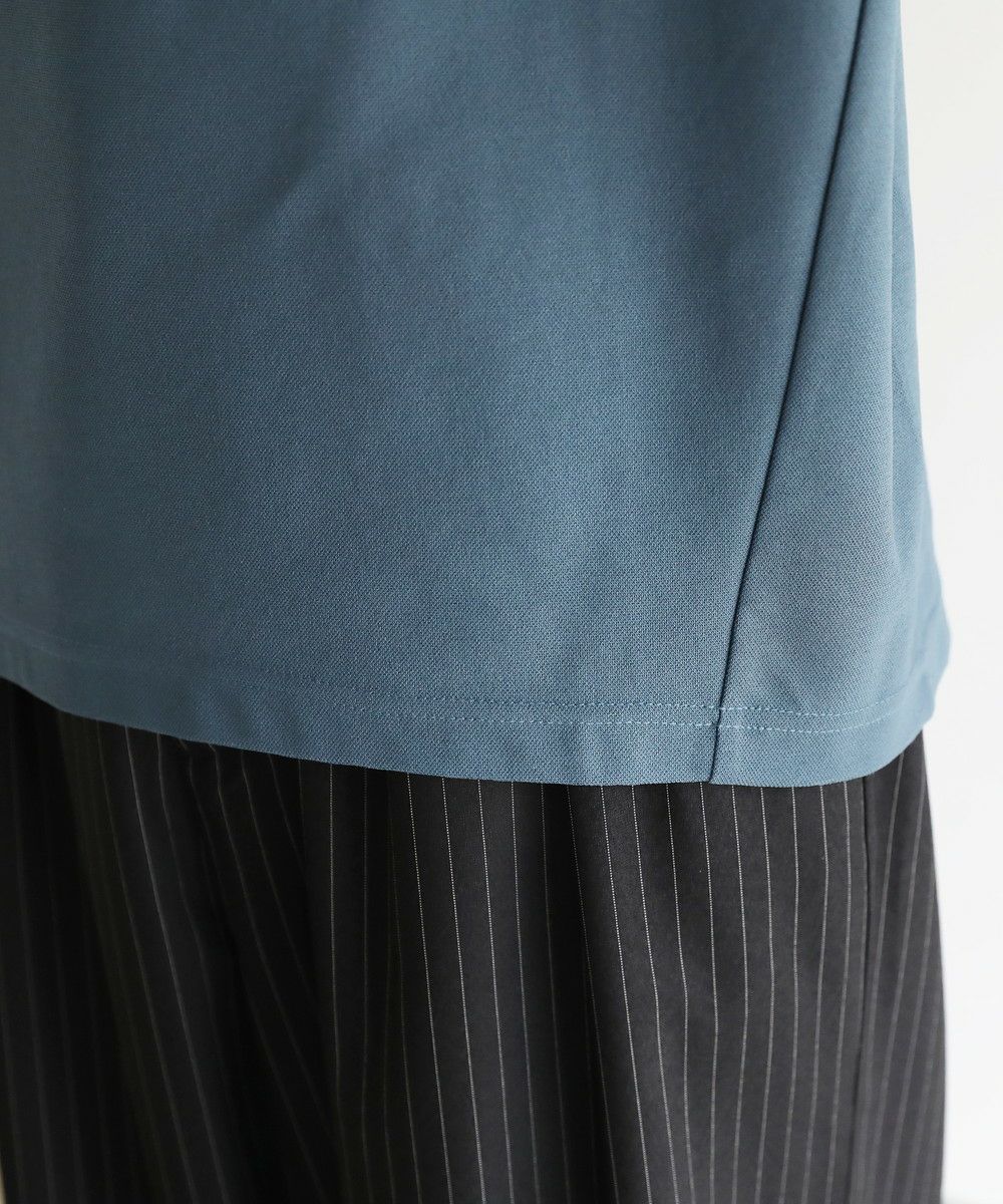 生地は通常よりも糸の撚りを強めた「強撚糸(きょうねんし)」というハイツイスト糸で編み立てたカノコニット地。細かい凹凸があり、汗で肌に張り付くのを防いでくれます。夏でも快適に過ごせるひんやりとした接触冷感、ドライな着心地が続く吸水速乾、強い日差しから肌を守るUV機能付き。さらに洗濯機洗いが可能なイージーケア素材のため、汗ばむ夏のデイリーウェアとして気兼ねなくご着用いただけます。