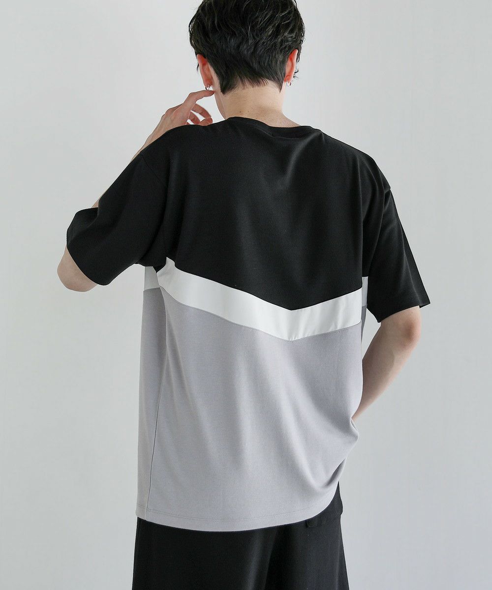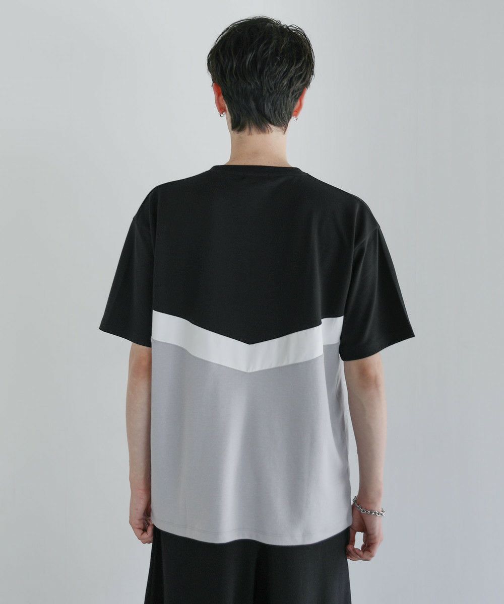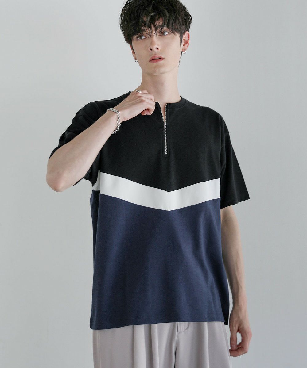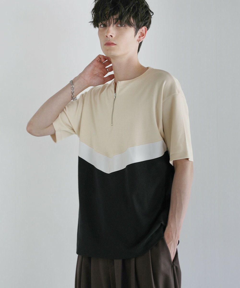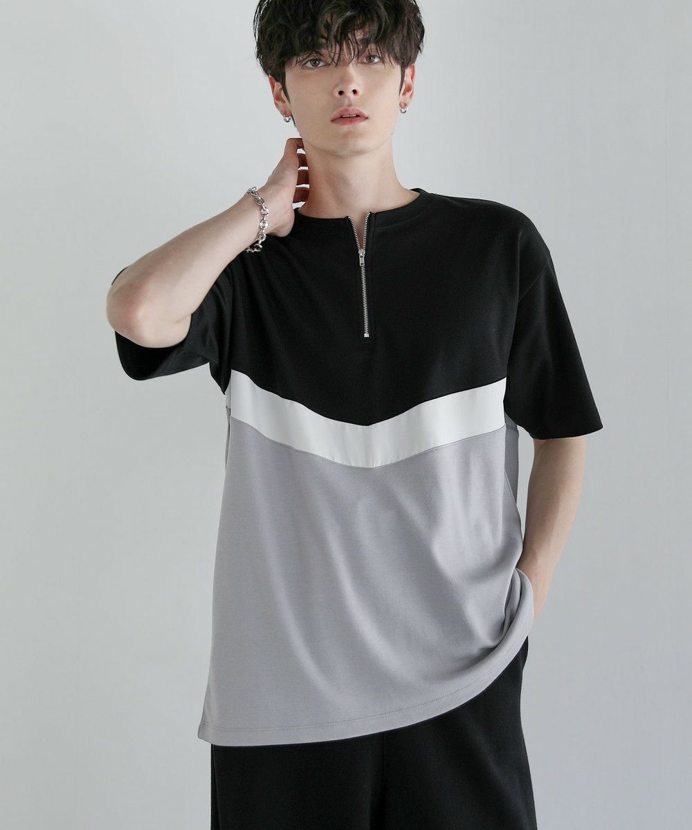 異素材のV字デザインで上下を貼り合わせたハーフジップTシャツ。