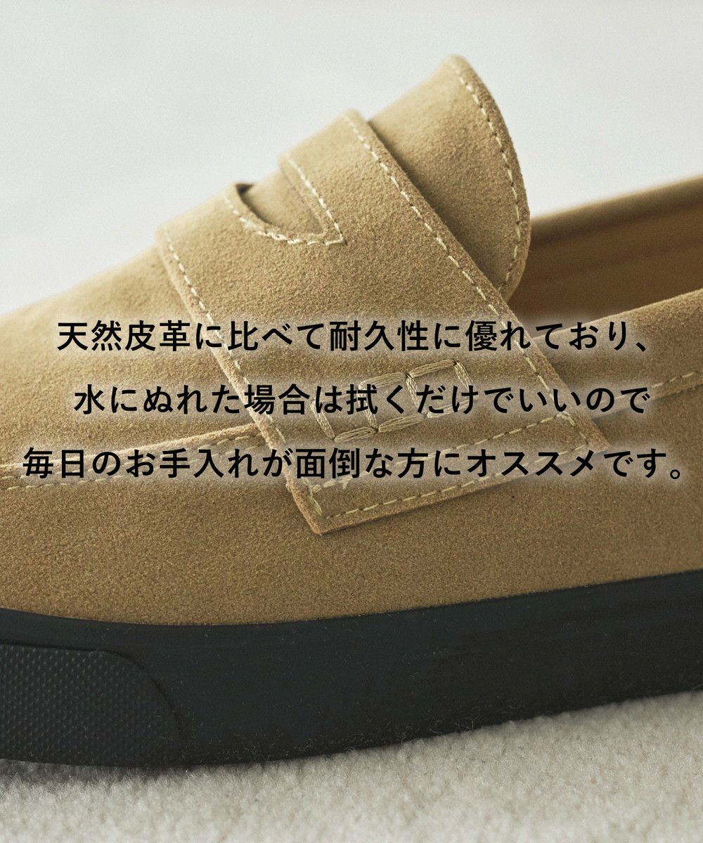 雨や水、キズに強い起毛感のある合成皮革を使用。天然皮革に比べて耐久性に優れており、水にぬれた場合は拭くだけでいいので、毎日のお手入れが面倒な方にオススメです。ソール部分は軽量でクッション性とグリップ力を兼ね備え、長時間履いても疲れにく仕様になっています。