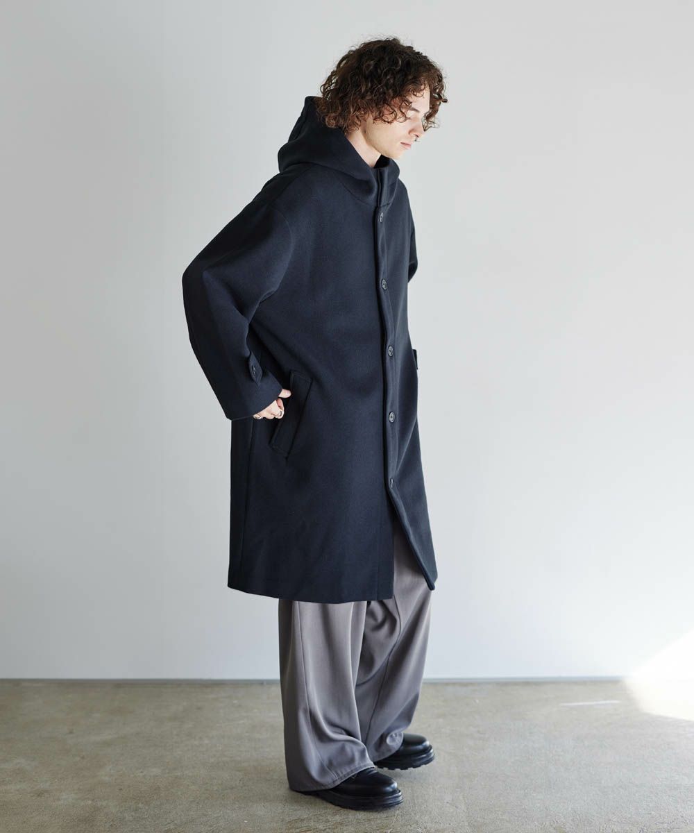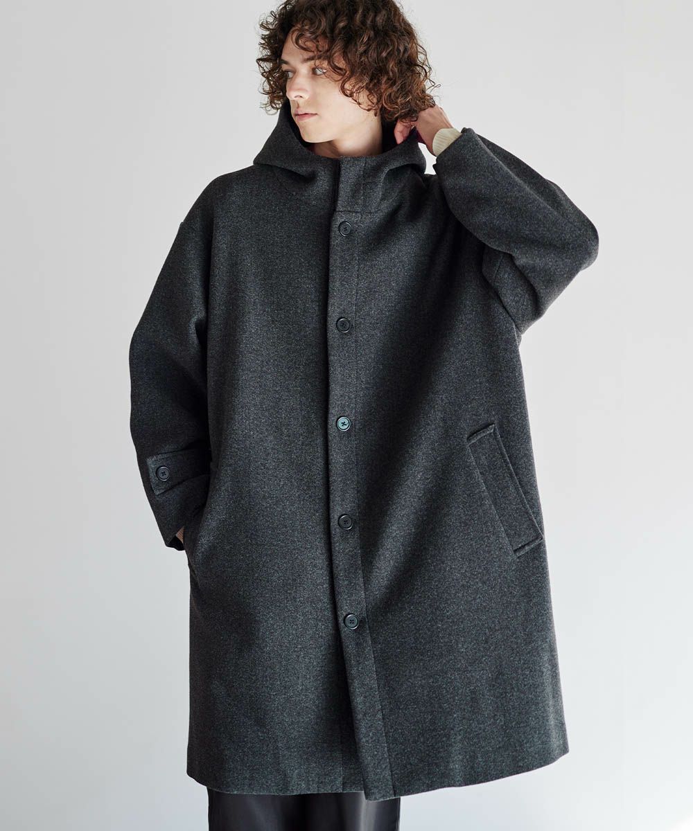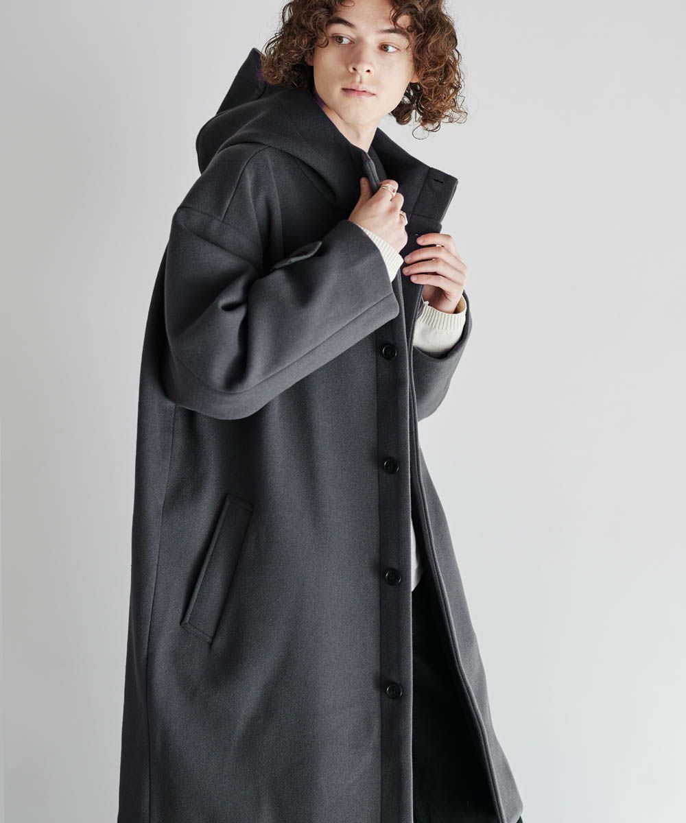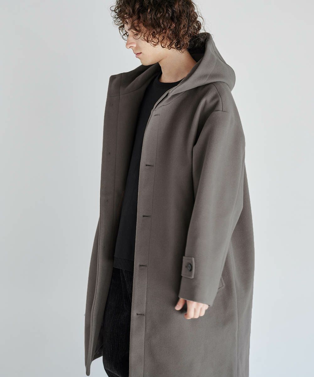 メルトン生地で仕立てた、キレイめカジュアルに着回しが楽しめるフーデッドコート。