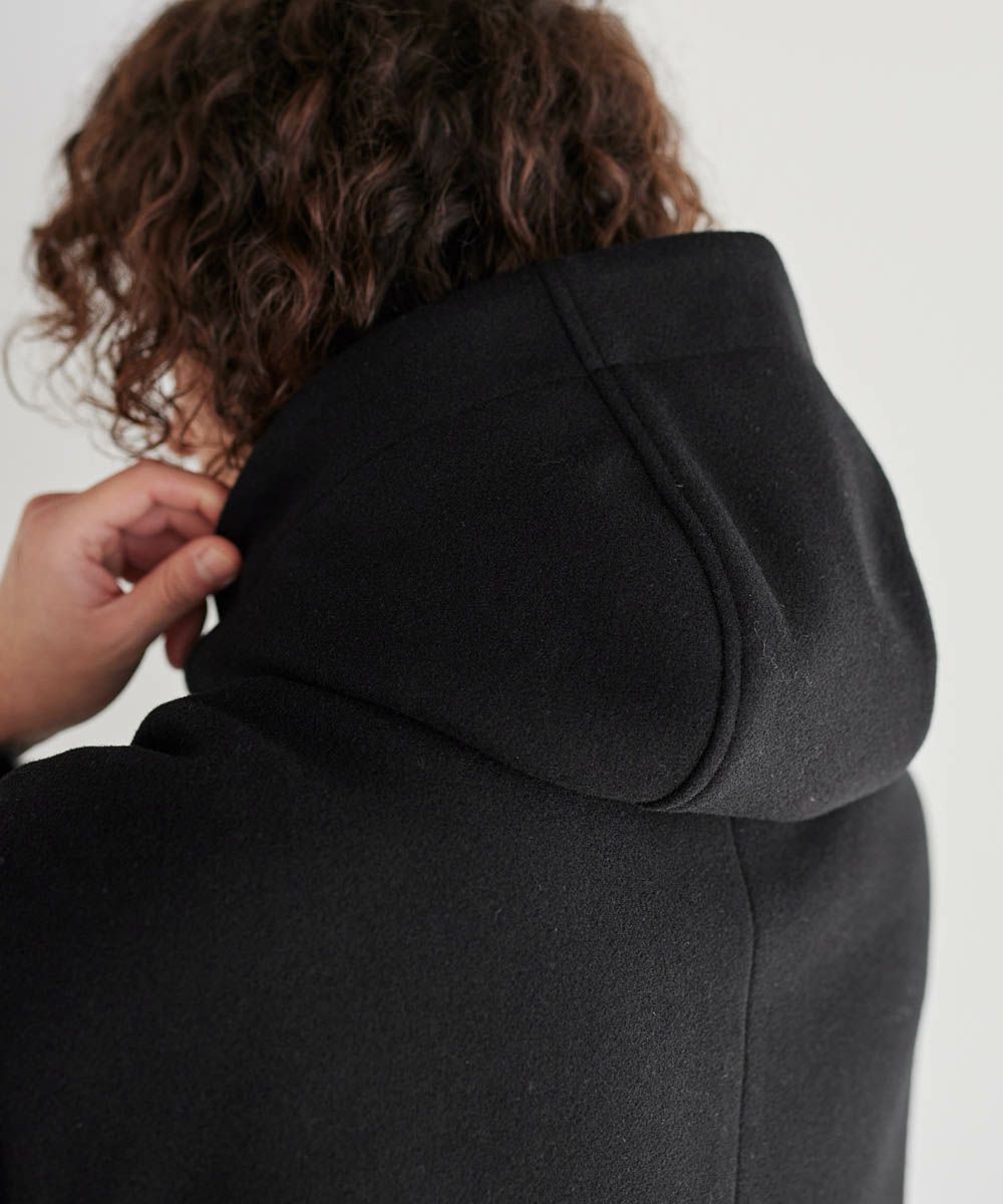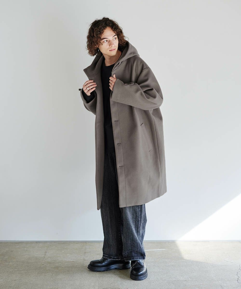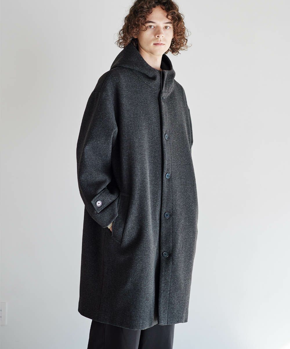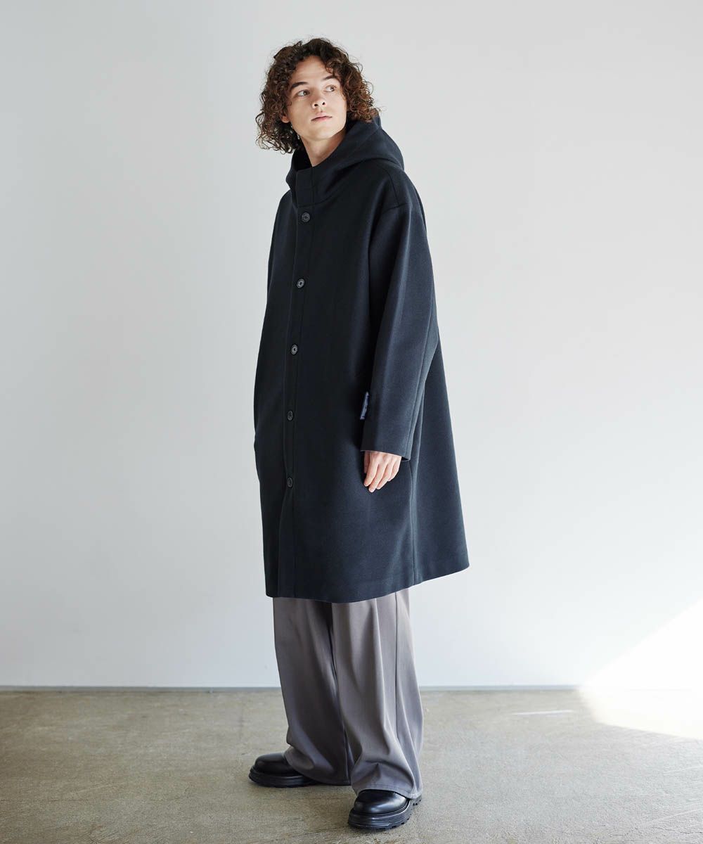 メルトン生地で仕立てた、キレイめカジュアルに着回しが楽しめるフーデッドコート。