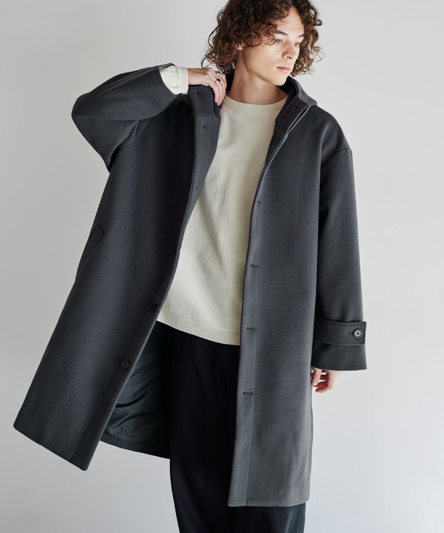 中にパーカーやニットのアイテムも着込めるようにシルエットはルーズめに設計。裏地付きなので、ニットを着ていても摩擦なくスムーズに脱ぎ着が可能です。長めの着丈で体をすっぽりと包んでくれる安心感があり、キレイめにもカジュアルにも相性の良い着回し力の高いフーデッドコートです。