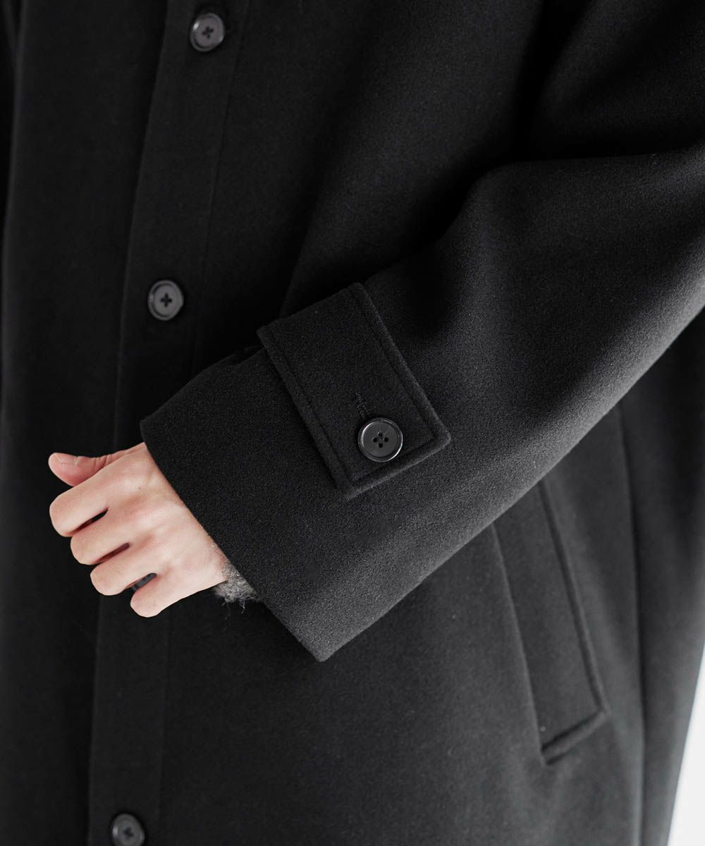 上品なメルトン生地のコートに、フードを付けて程よい抜け感をプラスしました。首元のスナップボタンを留めるとスタンドネックになり、暖かく着用いただけます。