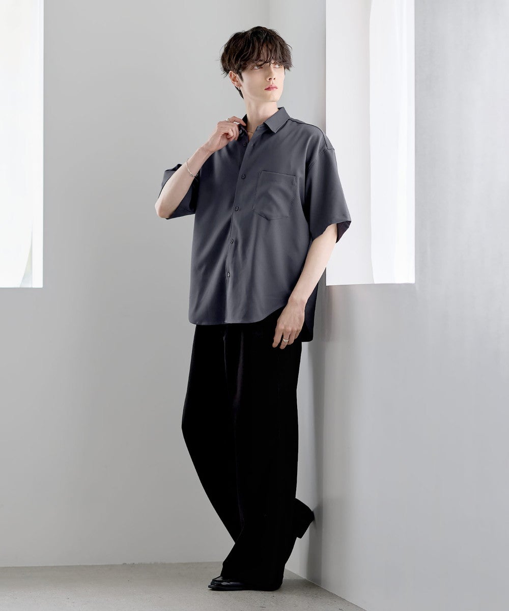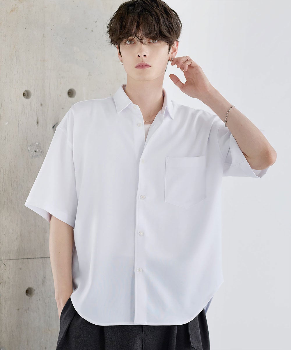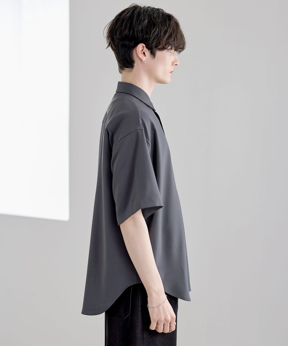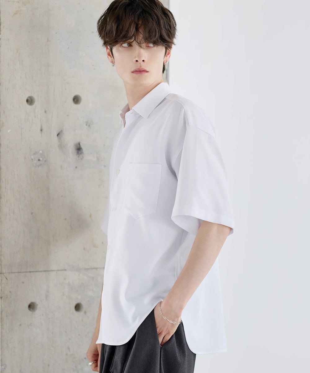 ポリエステルをベースにした軽やかなシャツ生地を使用。さらっとした肌触りと程よい落ち感が特徴で、上品な印象に仕上がっています。接触冷感機能により、肌に触れた際にひんやりとした着心地を実感でき、暑い季節でも快適に着用可能。さらに防シワ性にも優れており、お手入れがしやすく、きれいな見た目をキープしやすいのもポイントです。