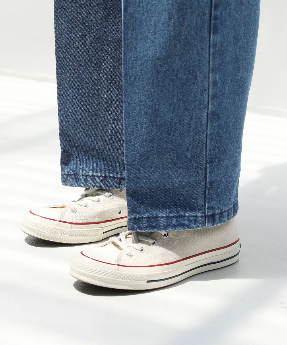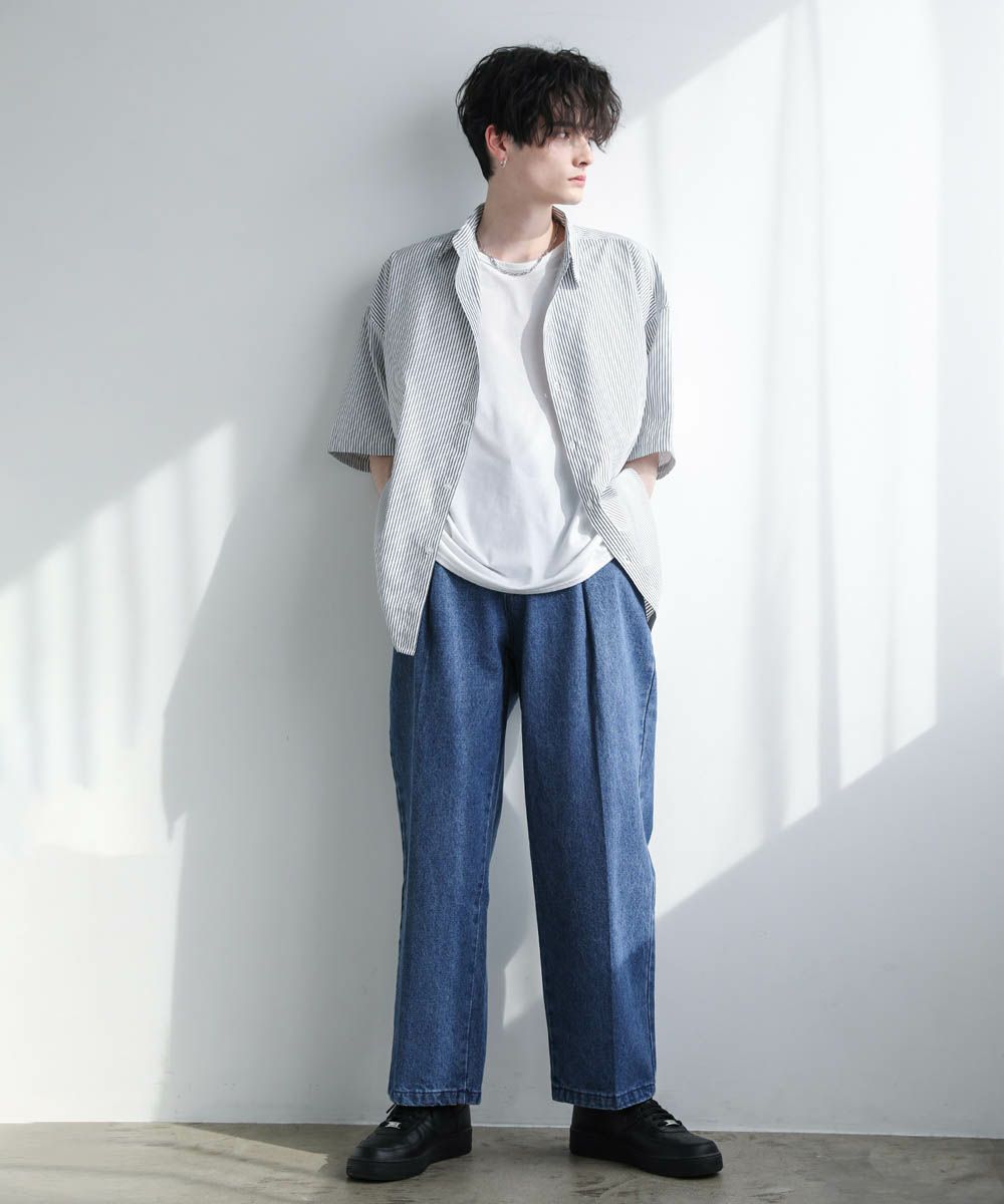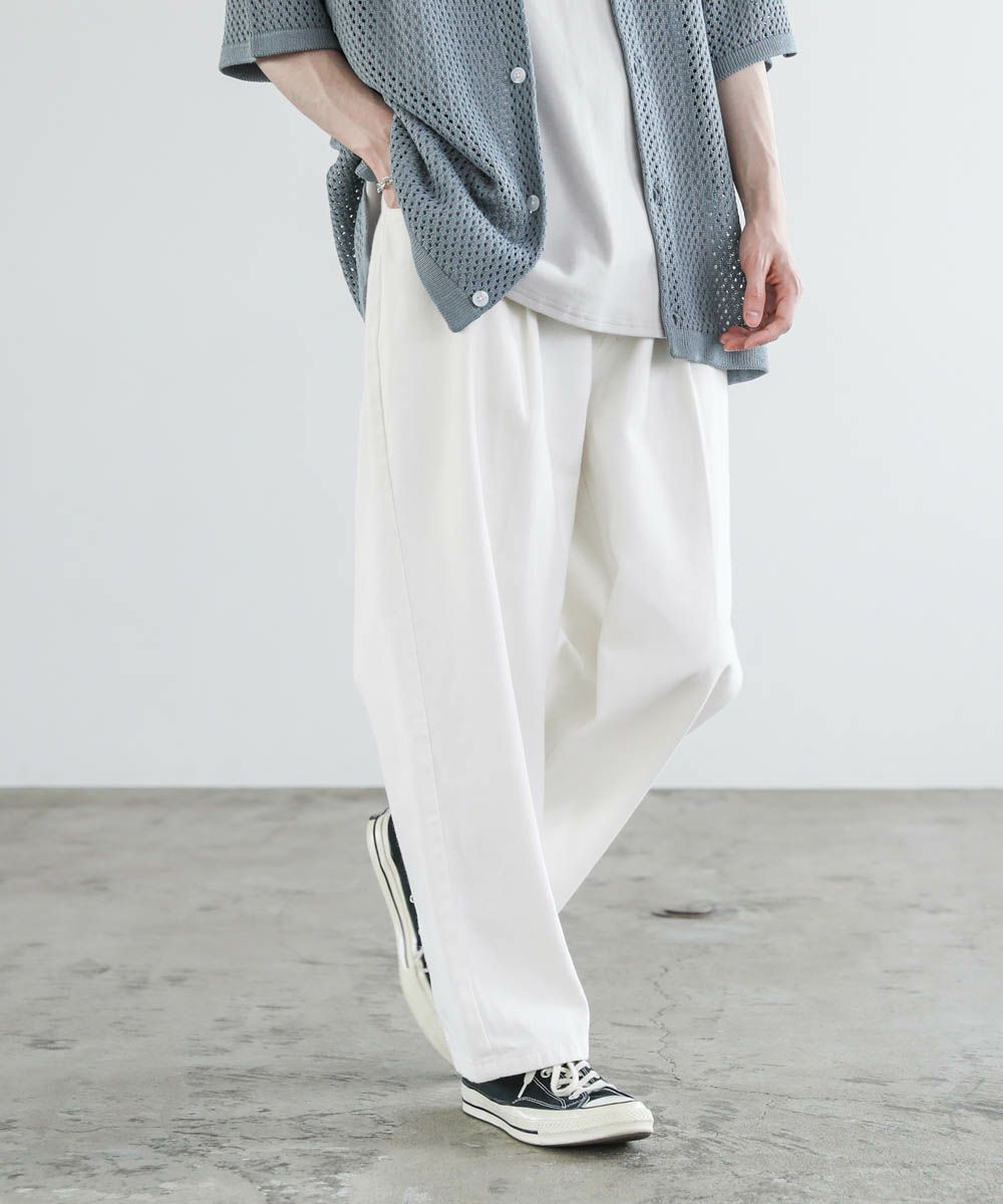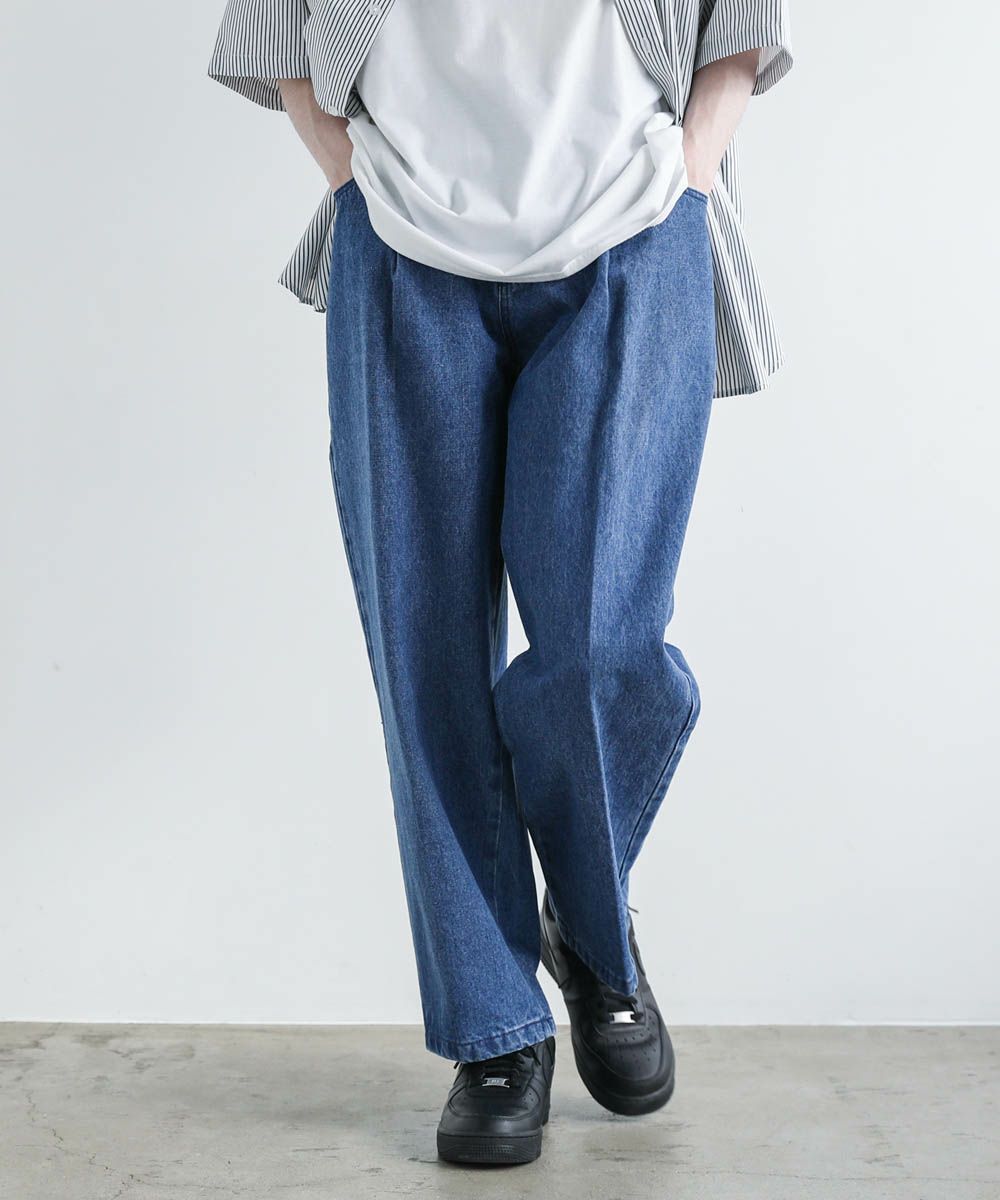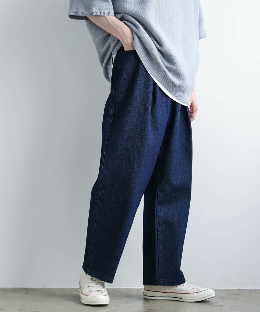 12oz(オンス)のほどよい厚みのあるデニム素材のスラックスパンツ。ウエストから裾にかけて緩やかに広がるワイドシルエットで、立体感を出すためにフロントには深めのタックを施しています。またセンタープレスを入れることでカジュアルになりすぎず、カットソー1枚とサラッと合わせても上品な雰囲気にまとめてくれます。
