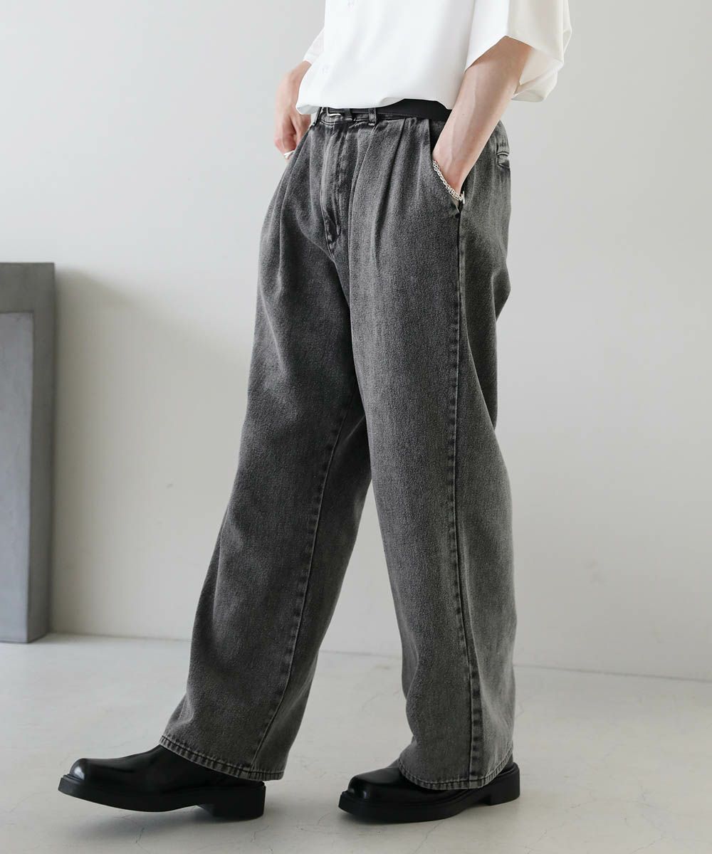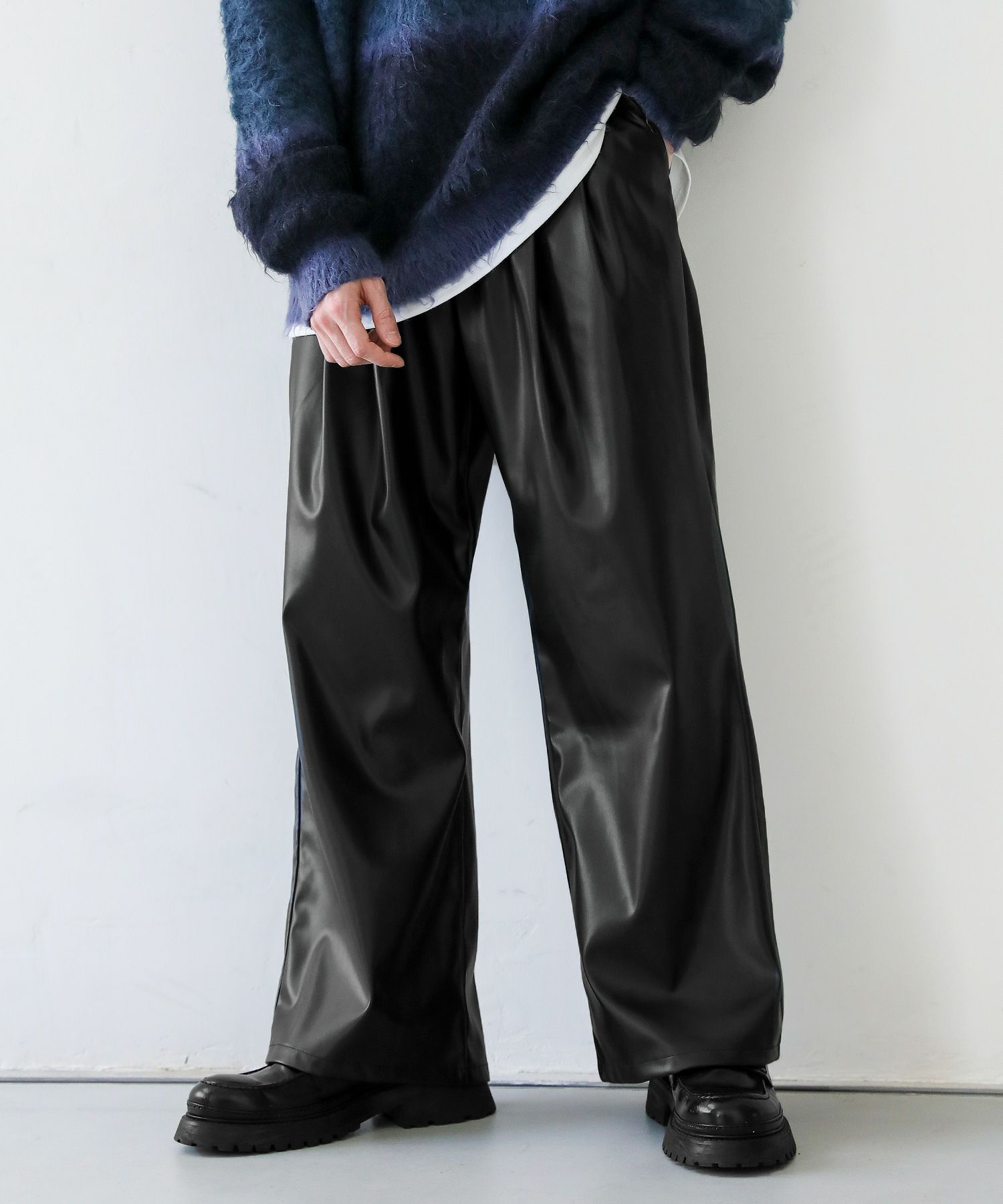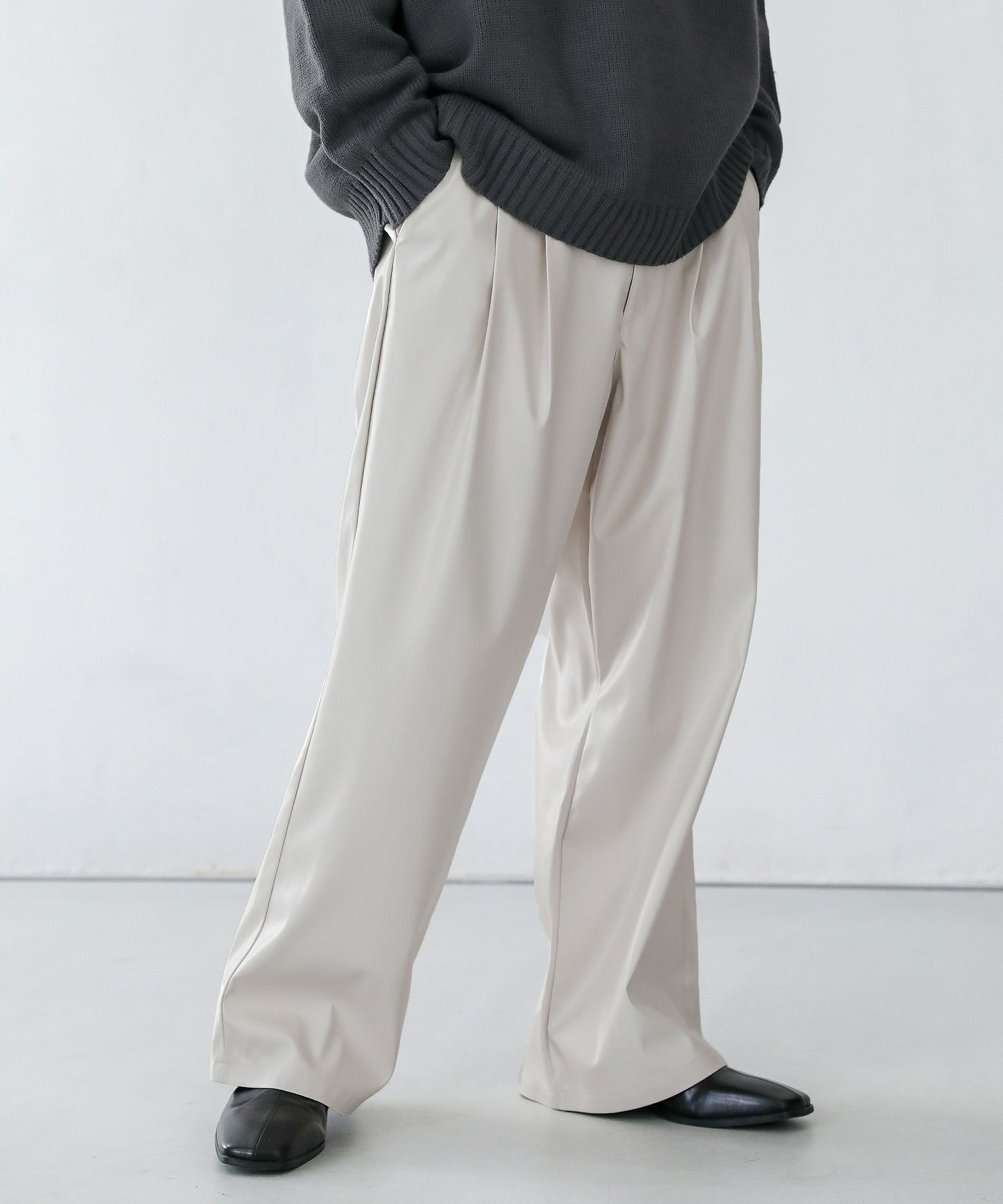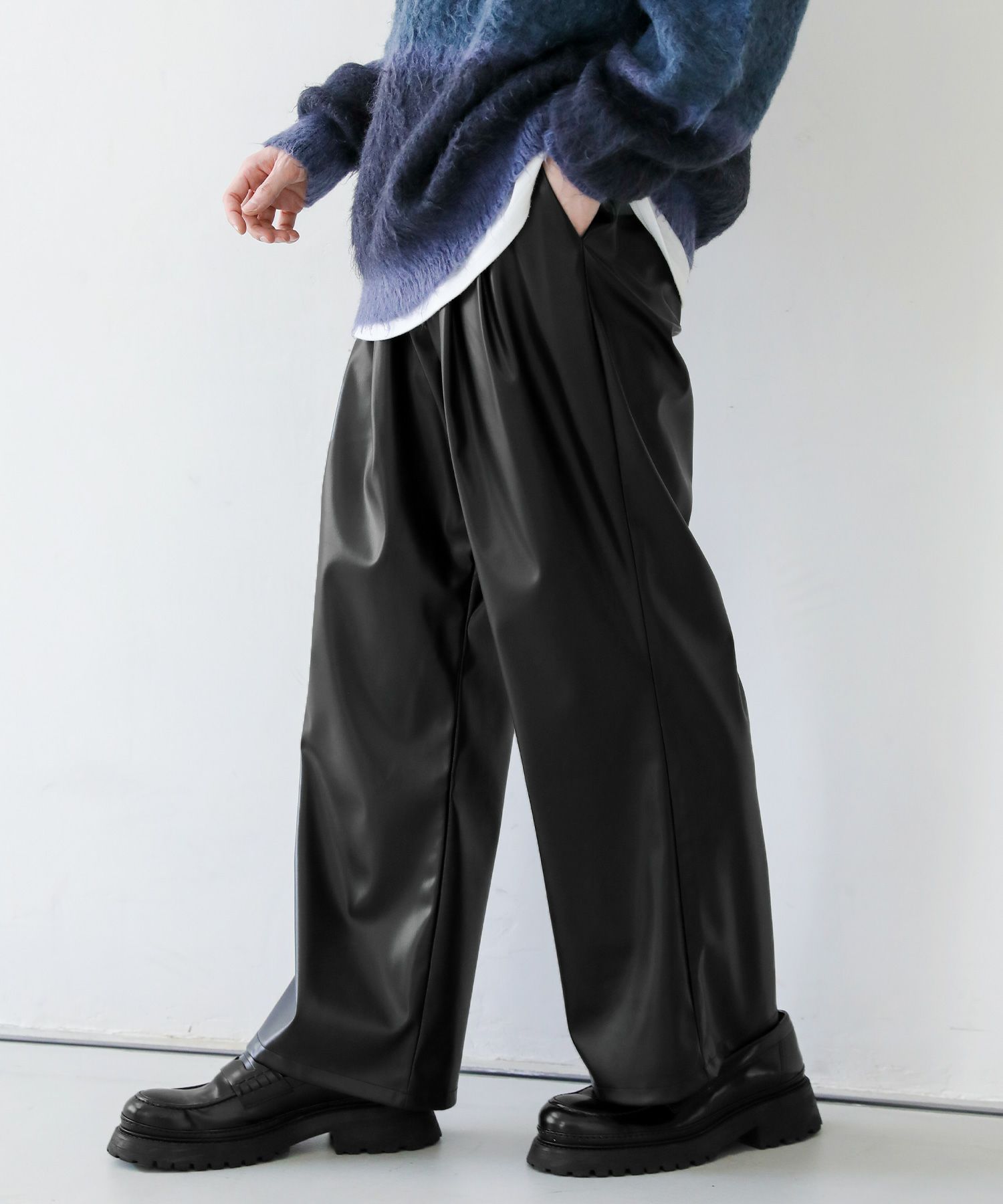 2タックワイドバギーデニム/シンセティックレザーパンツ