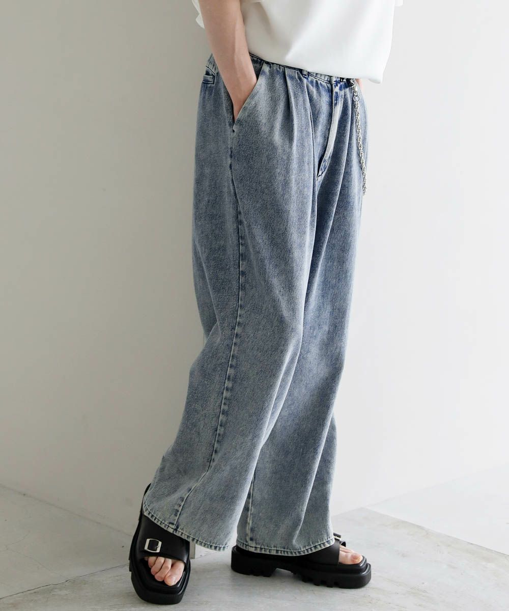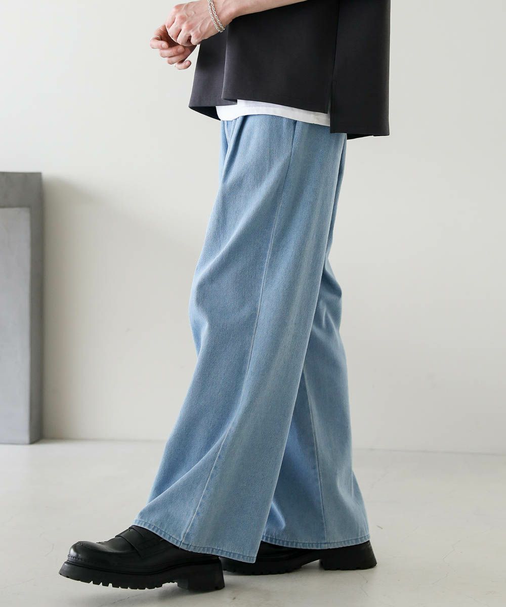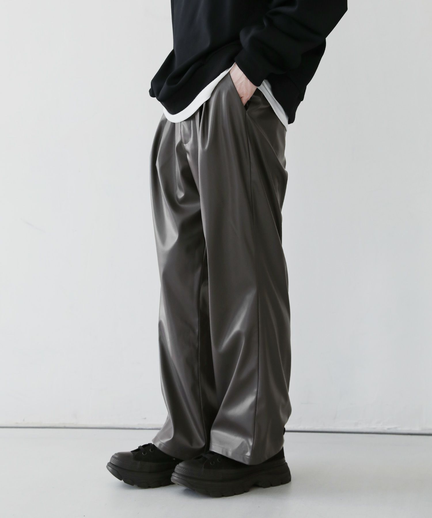 2タックワイドバギーデニム/シンセティックレザーパンツ