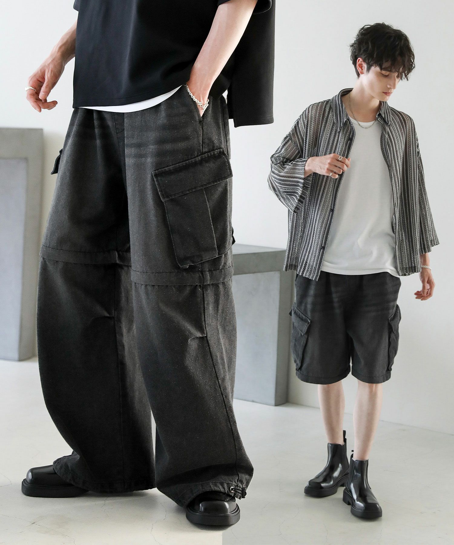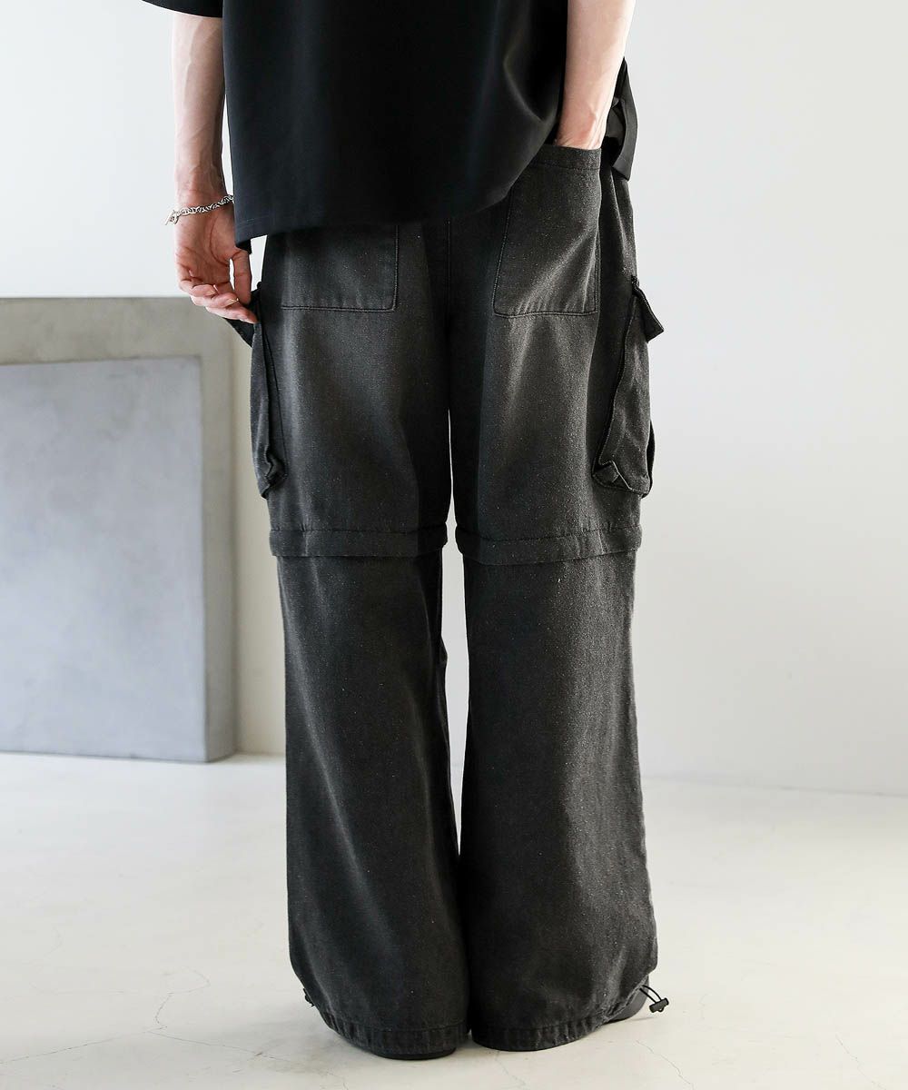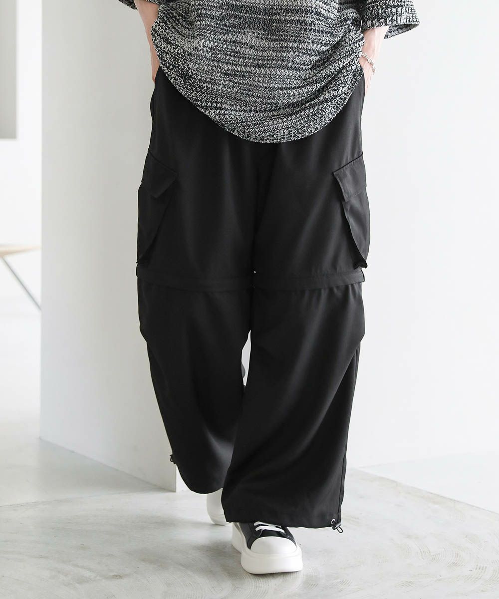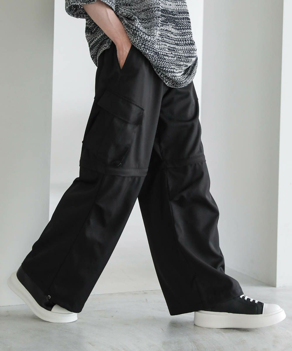 膝がファスナーで着脱可能な2WAY仕様のカーゴパンツ。カーゴパンツとして、また膝下部分を取り外してショートパンツとしても着用でき、着こなしの幅が広がるアイテム。ワイドストレートのボリューム感のあるシルエット。サイドの立体的なフラップポケットが存在感のあるアクセントを加えています。ウエストは紐で調節できるのでベルト要らずで着用が可能。また、裾はドローコード入りなのでシルエットの変化をお楽しみいただけます。