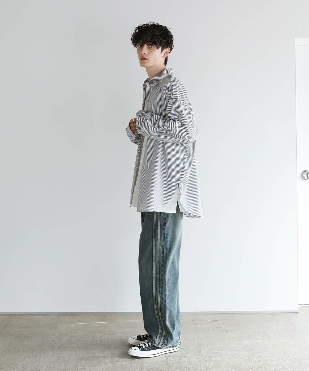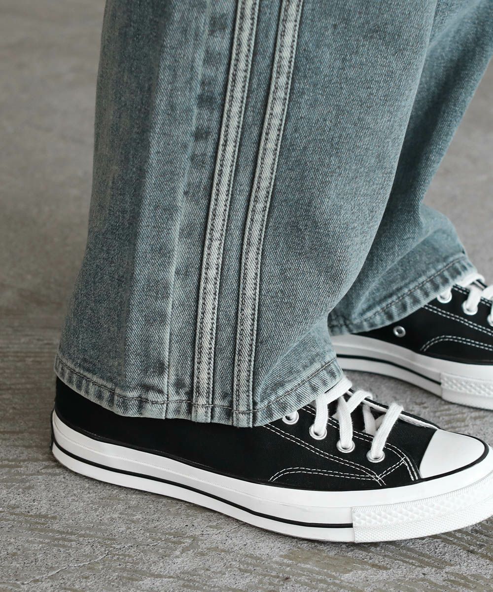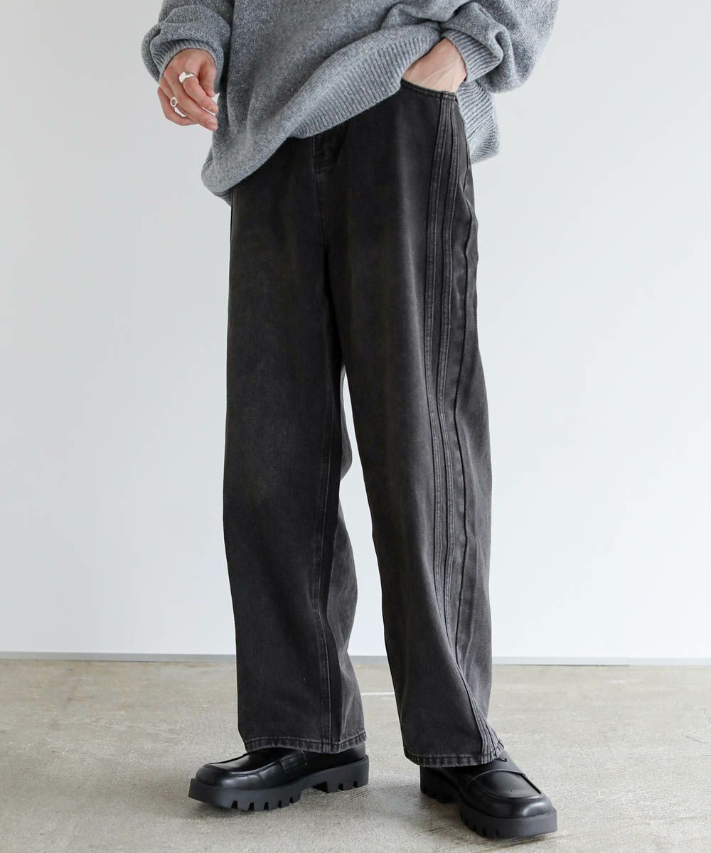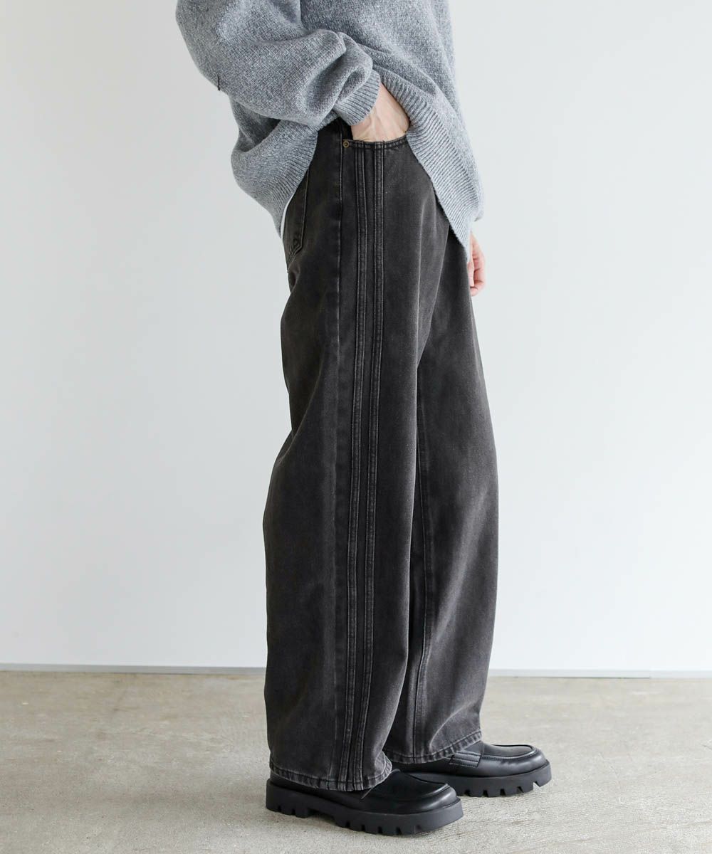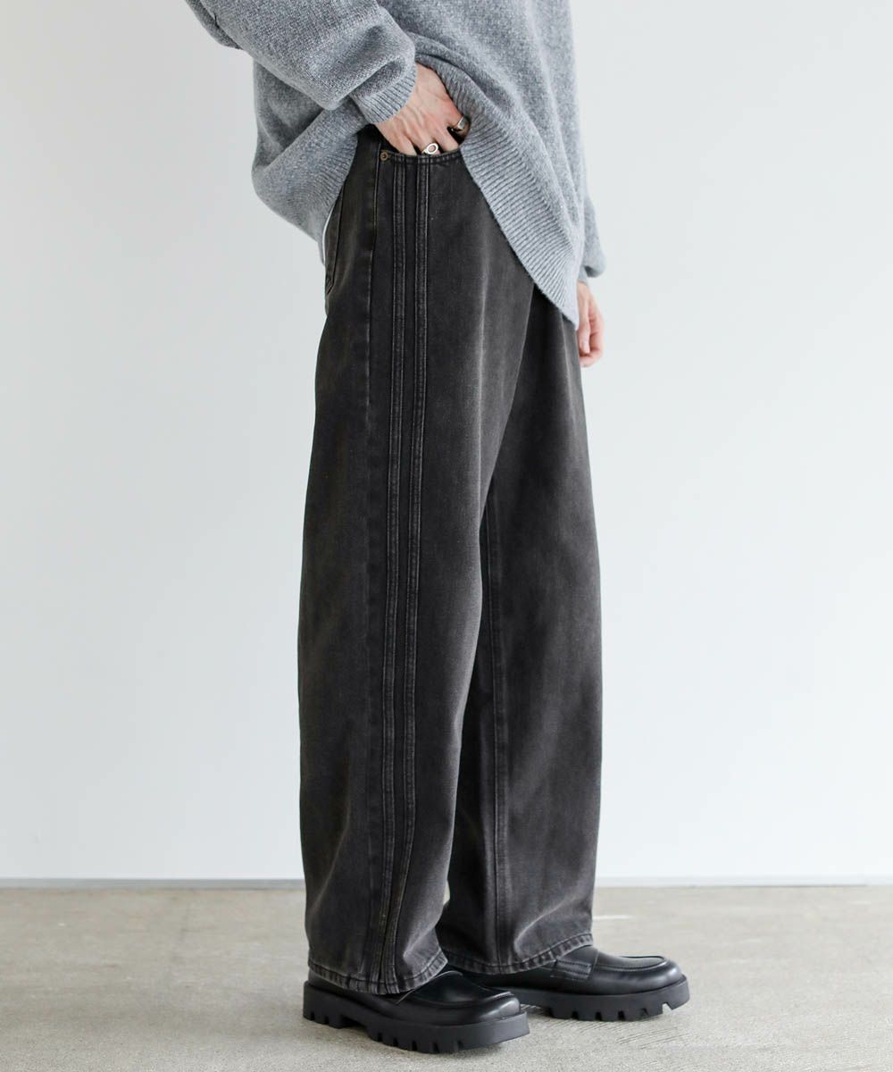 サイドの切り替えデザインがポイントのデニムパンツ。長年穿き込まれたようなビンテージ感漂う表情が魅力的な1本です。シルエットはストンと落ちるワイドストレートを採用。すっきりとした印象で穿きこなせ、脚をすらっと見せてくれます。生地は程よい厚みのヘビーウェイトで、シーズン問わず着用が可能。着こなしの定番アイテムとして活躍する、着回し力抜群のアイテムです。