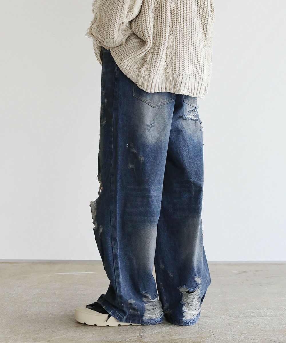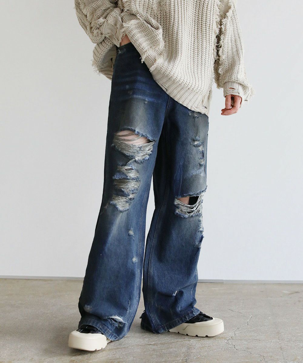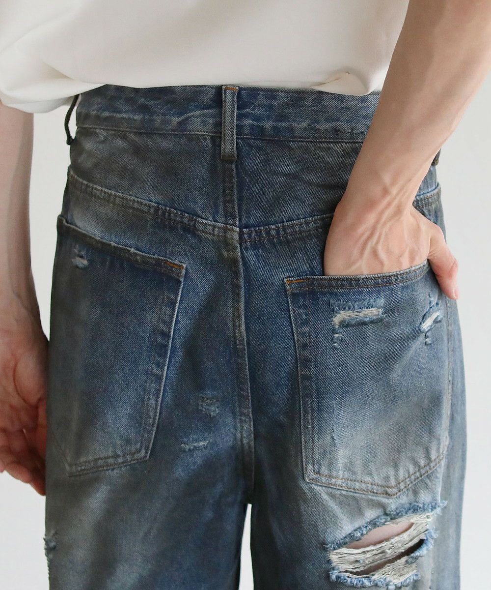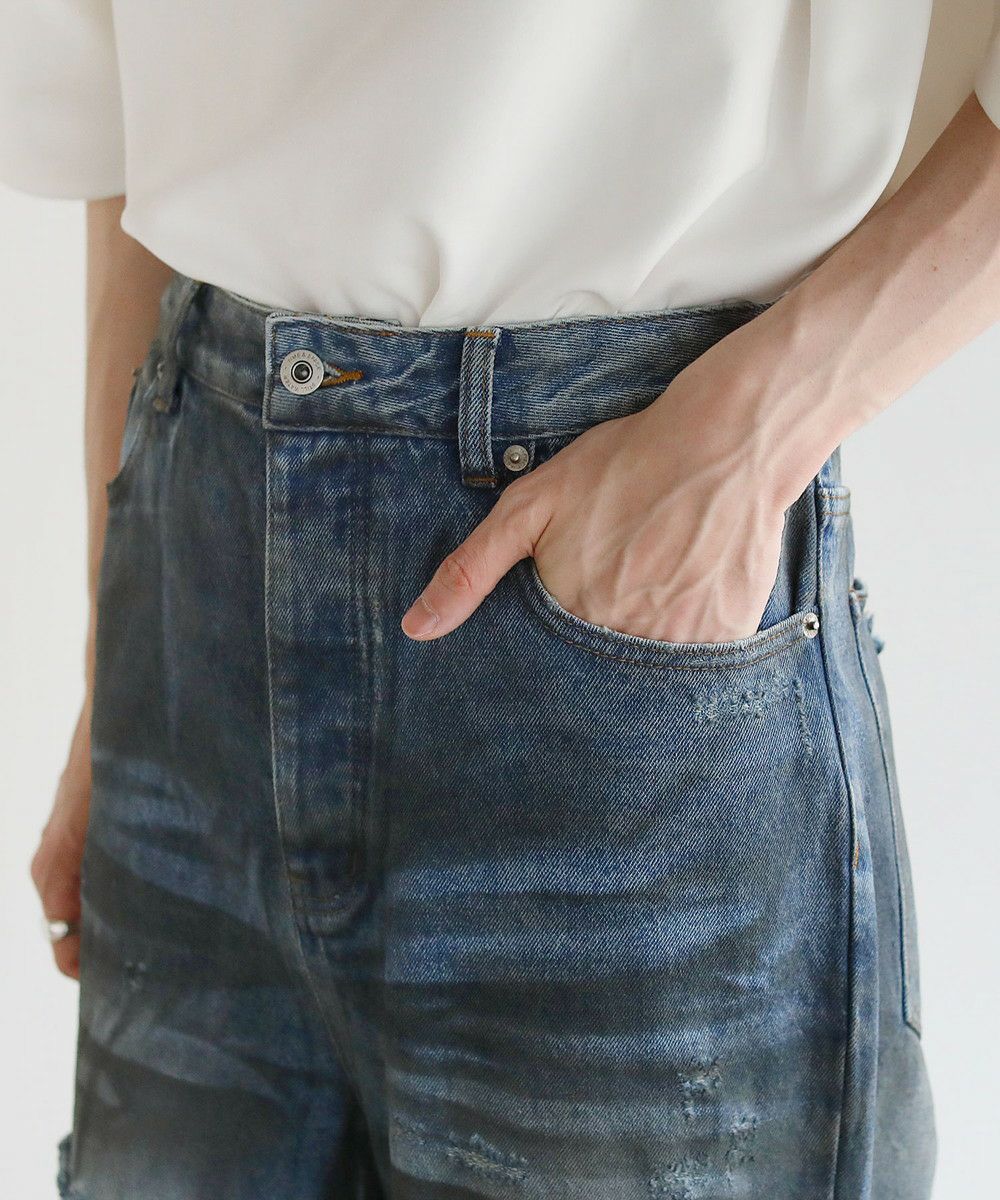 大胆なクラッシュ加工が印象的な一本。トレンドライクなワイドシルエットが今っぽい着こなしを作ります。フロントとバックにはヴィンテージライクな加工を施しており、穿き込んだような味のある表情が魅力です。クラッシュ加工はフロントのもも~膝にかけてと、バックの右ヒップ、裾部分と要所要所に施されおり、360度どこから見ても目を引くアイテムとなっております。着こなしのメインとして活躍する、存在感抜群の1本です。