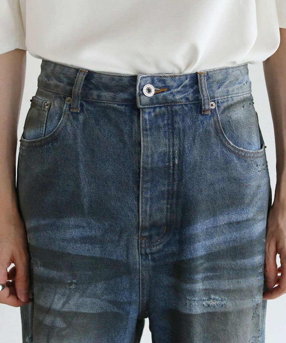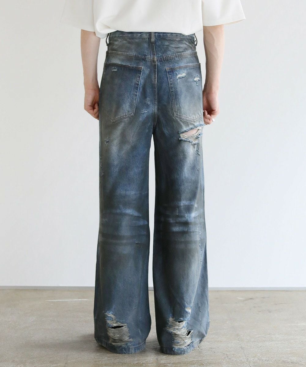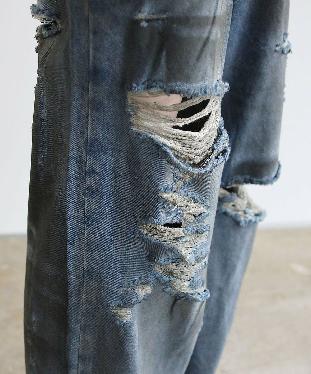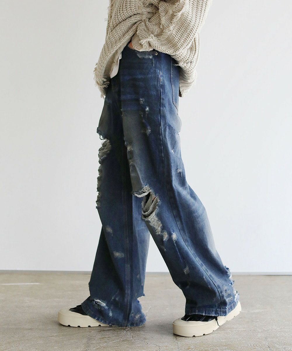 大胆なクラッシュ加工が印象的な一本。トレンドライクなワイドシルエットが今っぽい着こなしを作ります。フロントとバックにはヴィンテージライクな加工を施しており、穿き込んだような味のある表情が魅力です。クラッシュ加工はフロントのもも~膝にかけてと、バックの右ヒップ、裾部分と要所要所に施されおり、360度どこから見ても目を引くアイテムとなっております。着こなしのメインとして活躍する、存在感抜群の1本です。