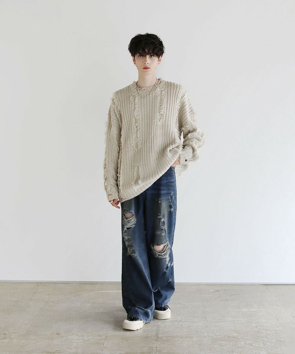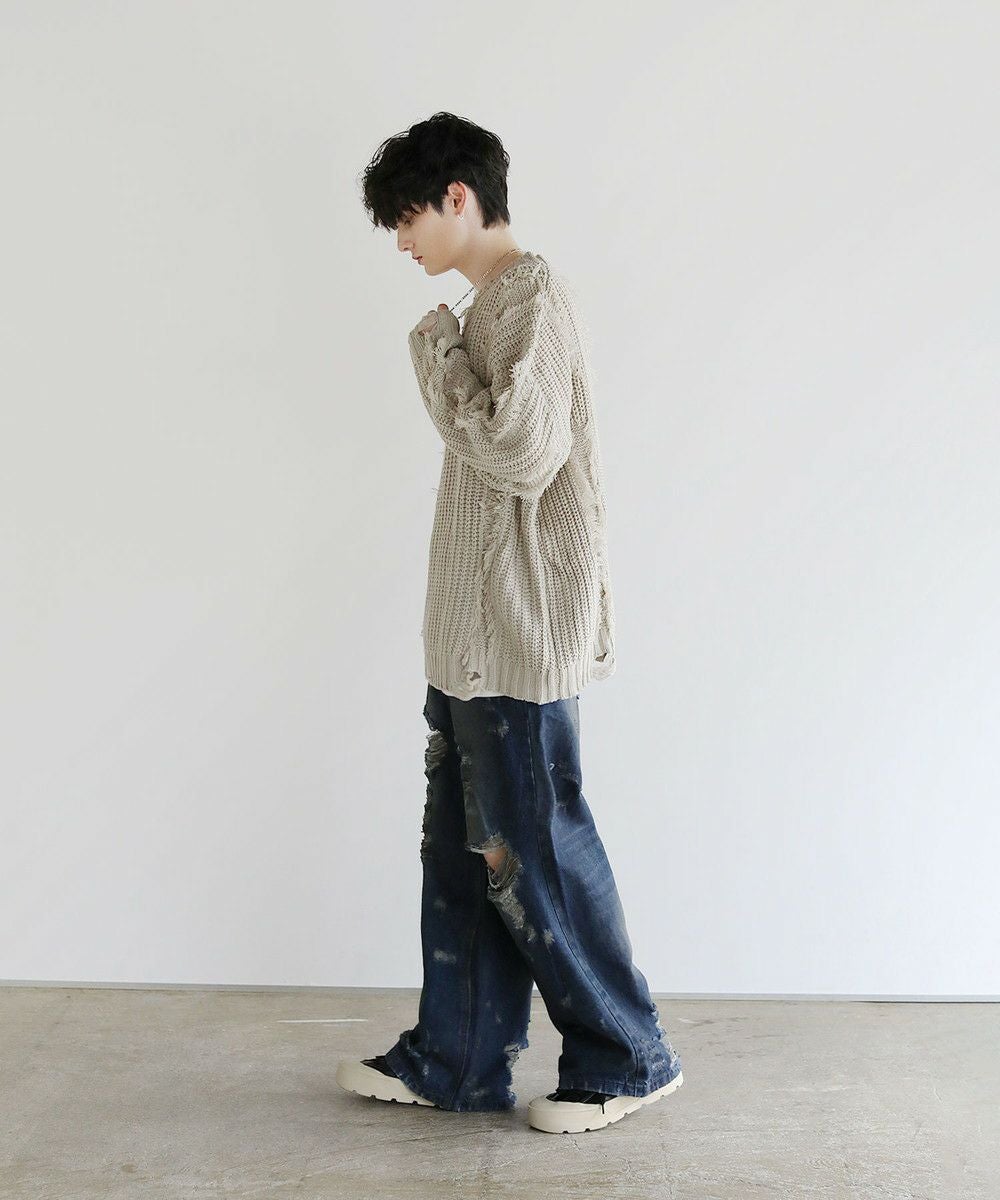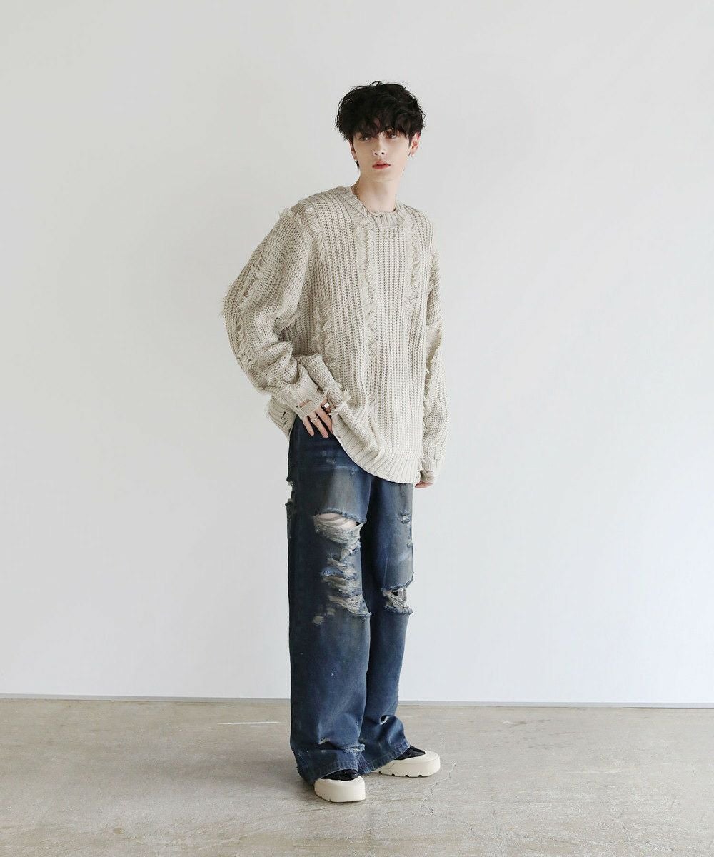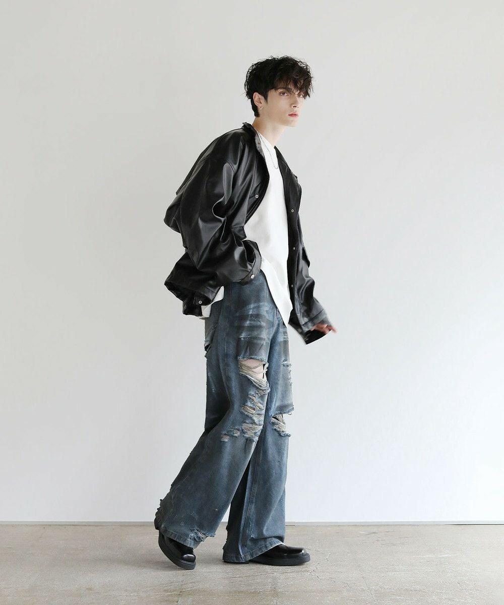 大胆なクラッシュ加工が印象的な一本。トレンドライクなワイドシルエットが今っぽい着こなしを作ります。フロントとバックにはヴィンテージライクな加工を施しており、穿き込んだような味のある表情が魅力です。クラッシュ加工はフロントのもも~膝にかけてと、バックの右ヒップ、裾部分と要所要所に施されおり、360度どこから見ても目を引くアイテムとなっております。着こなしのメインとして活躍する、存在感抜群の1本です。