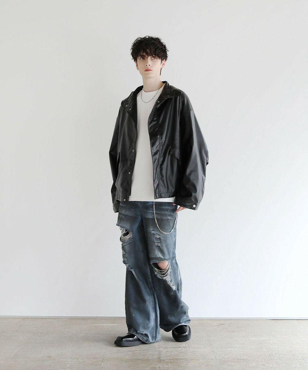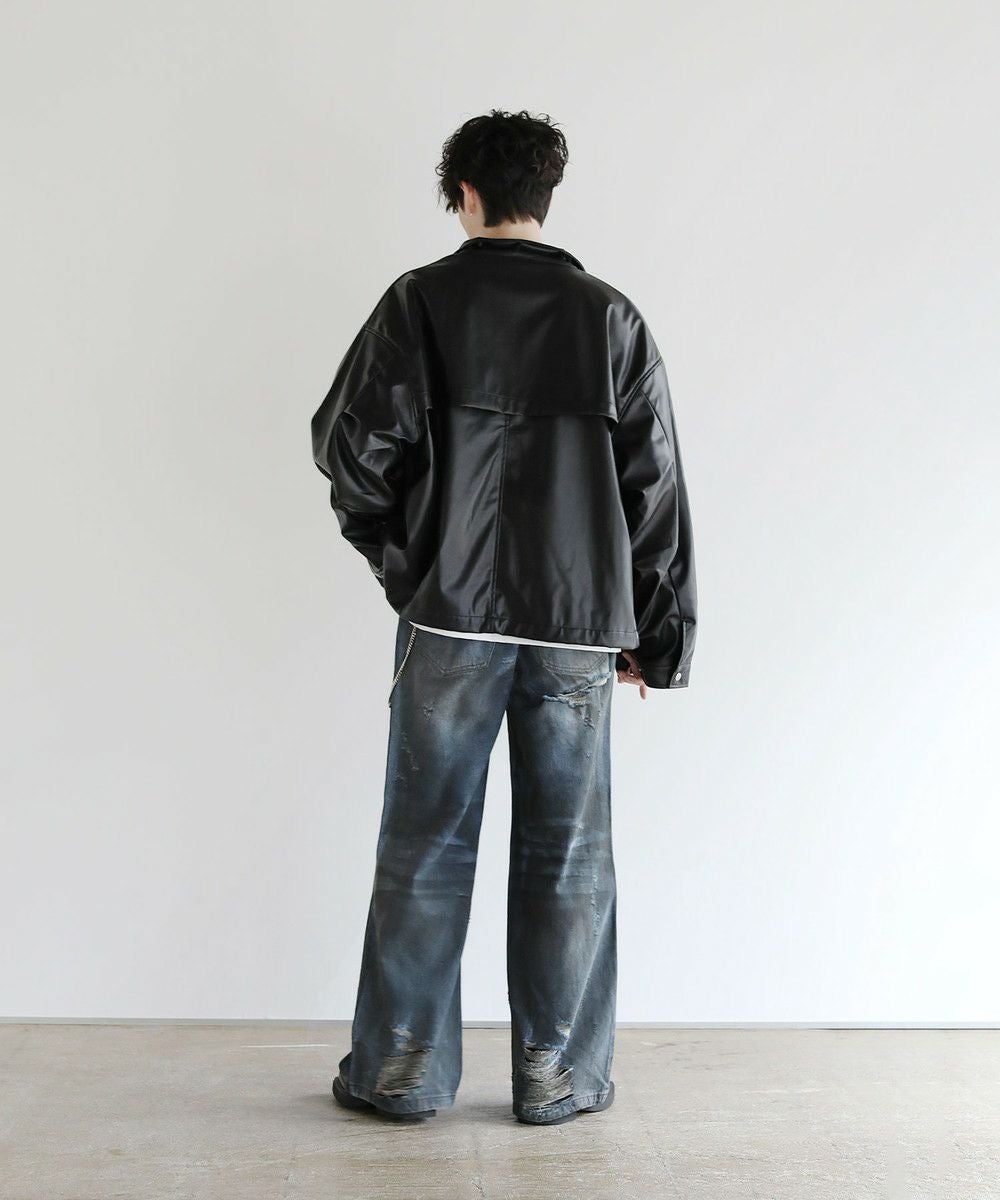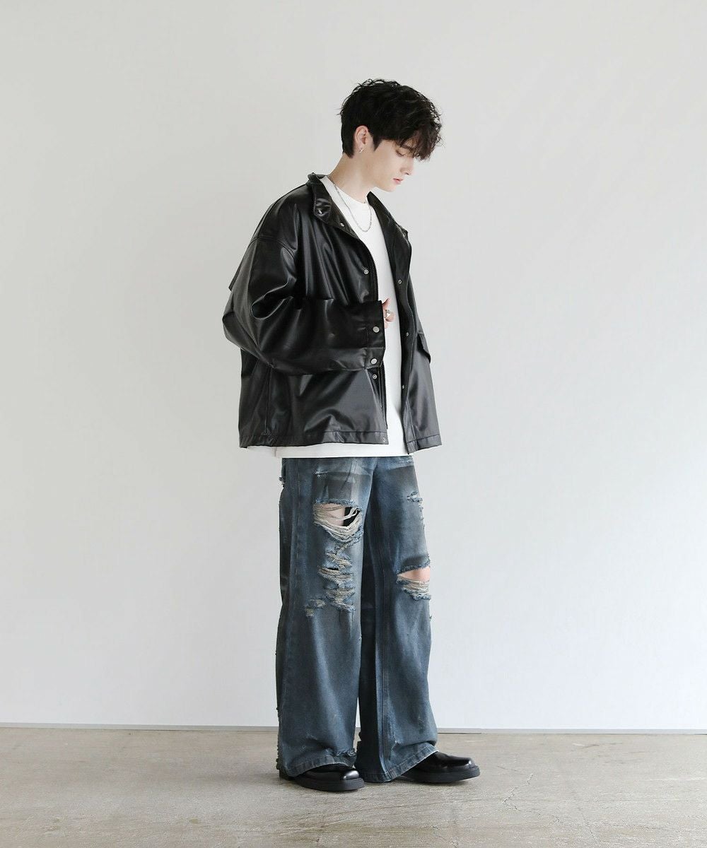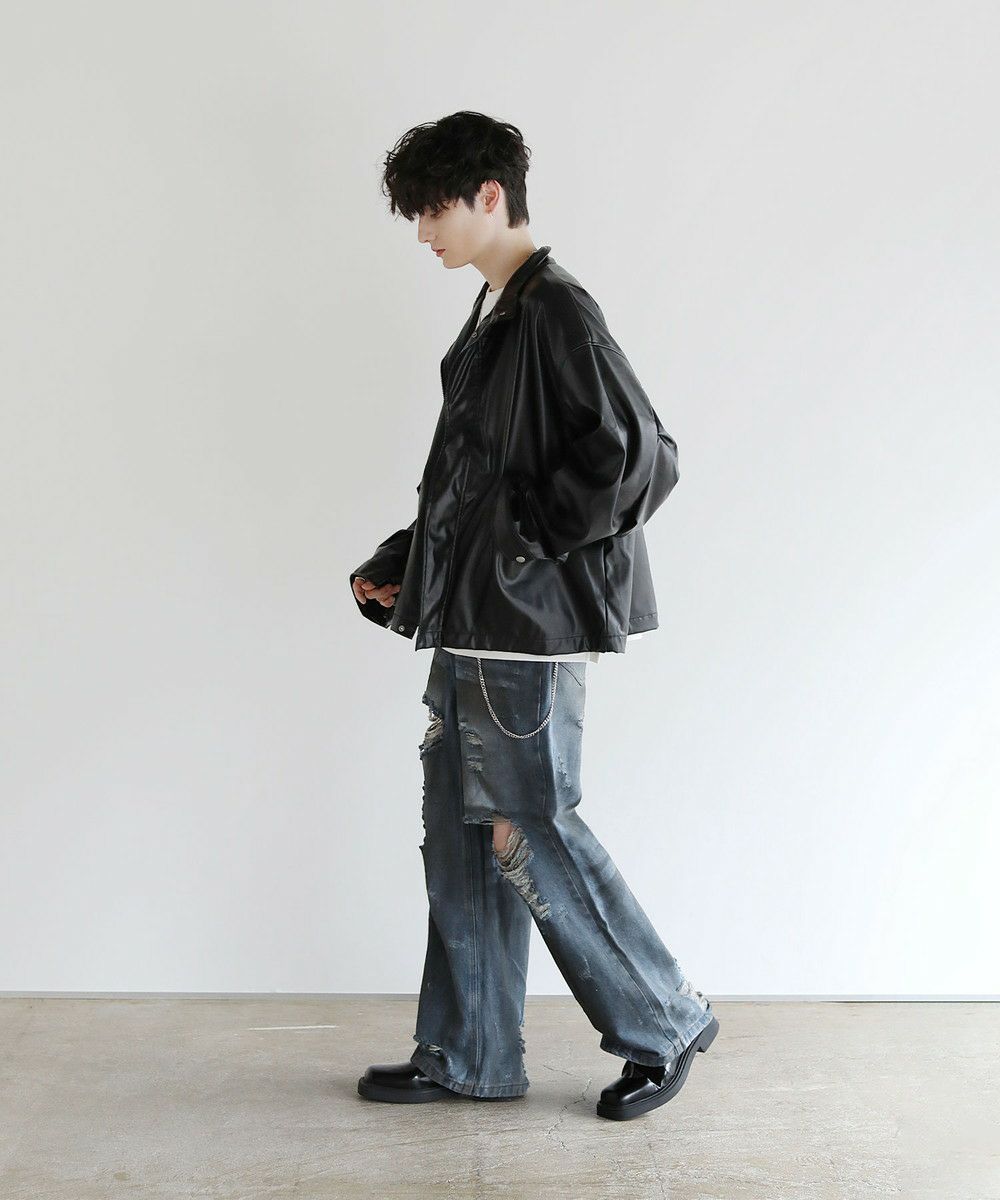 大胆なクラッシュ加工が印象的な一本。トレンドライクなワイドシルエットが今っぽい着こなしを作ります。フロントとバックにはヴィンテージライクな加工を施しており、穿き込んだような味のある表情が魅力です。クラッシュ加工はフロントのもも~膝にかけてと、バックの右ヒップ、裾部分と要所要所に施されおり、360度どこから見ても目を引くアイテムとなっております。着こなしのメインとして活躍する、存在感抜群の1本です。