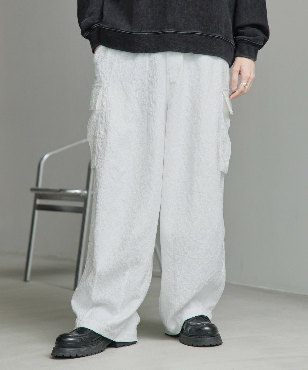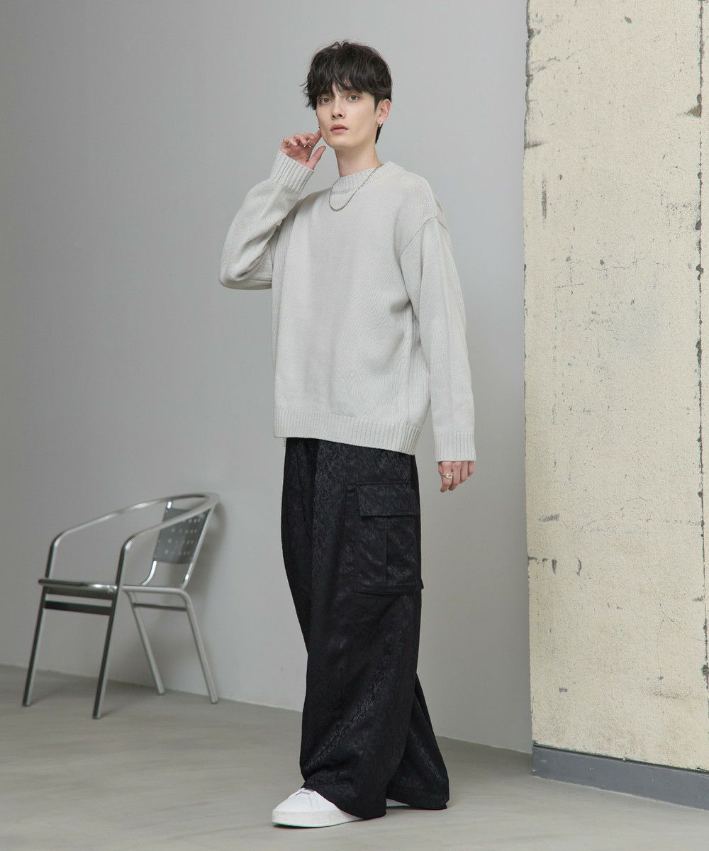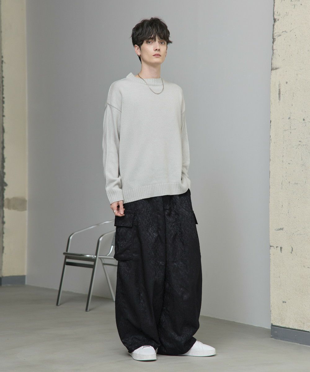 今シーズン注目の総柄ジャガードを使用したカーゴパンツ。立体的なシルエットと大きなカーゴポケットが抜け感をプラスしてくれます。生地の凹凸によって柄を作り出したジャガード柄は派手になりすぎず、さり気ないアクセントに。キレイめなルックスながら、ウエストの後ろはゴム入りで穿きやすさも兼ね備えています。また、ベルトループ付きでウエストまわりのアレンジがしやすいのもポイント。タックインスタイルもかっこよくキマるハイウエスト仕様なので、コーディネートの幅が広がります。