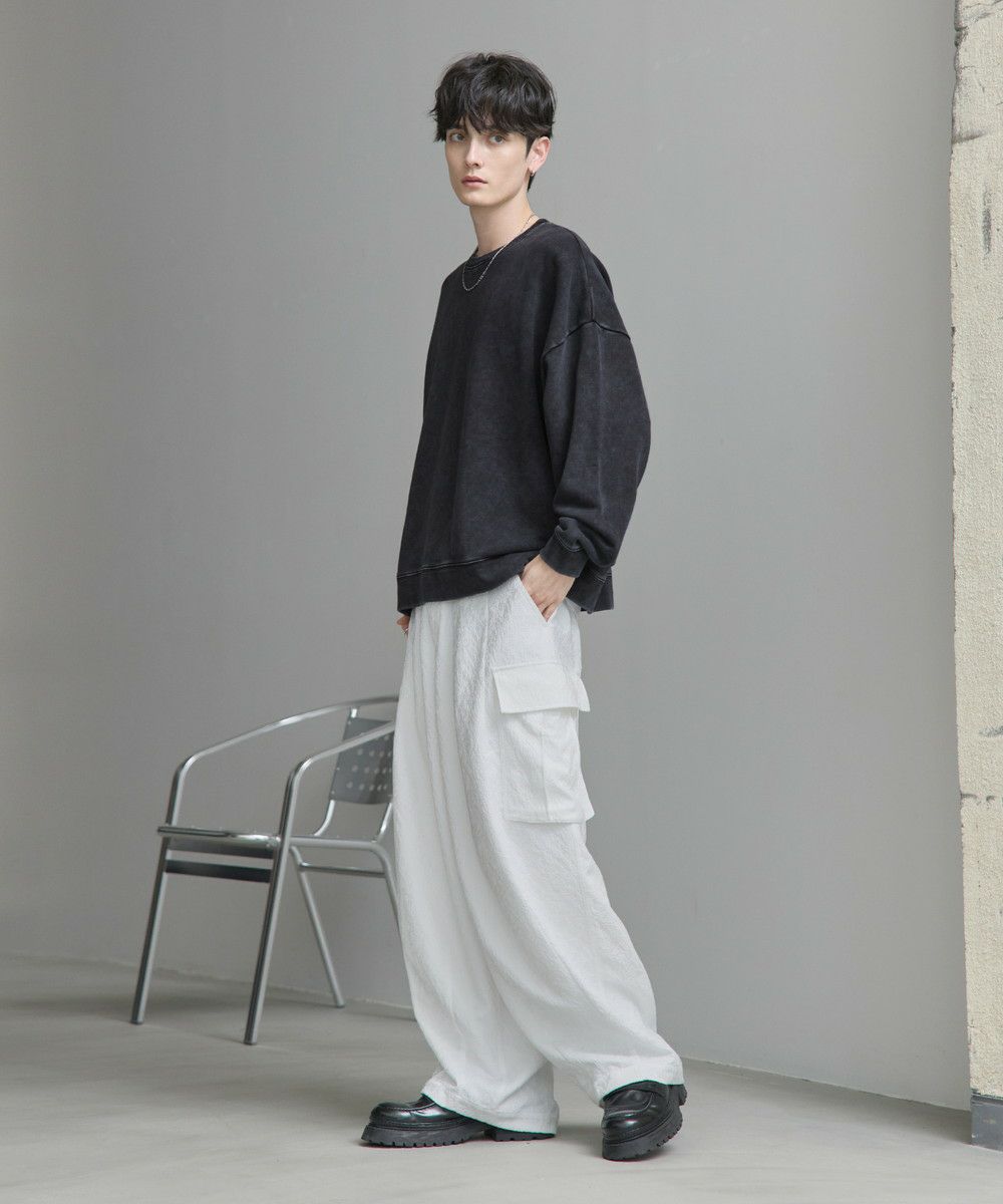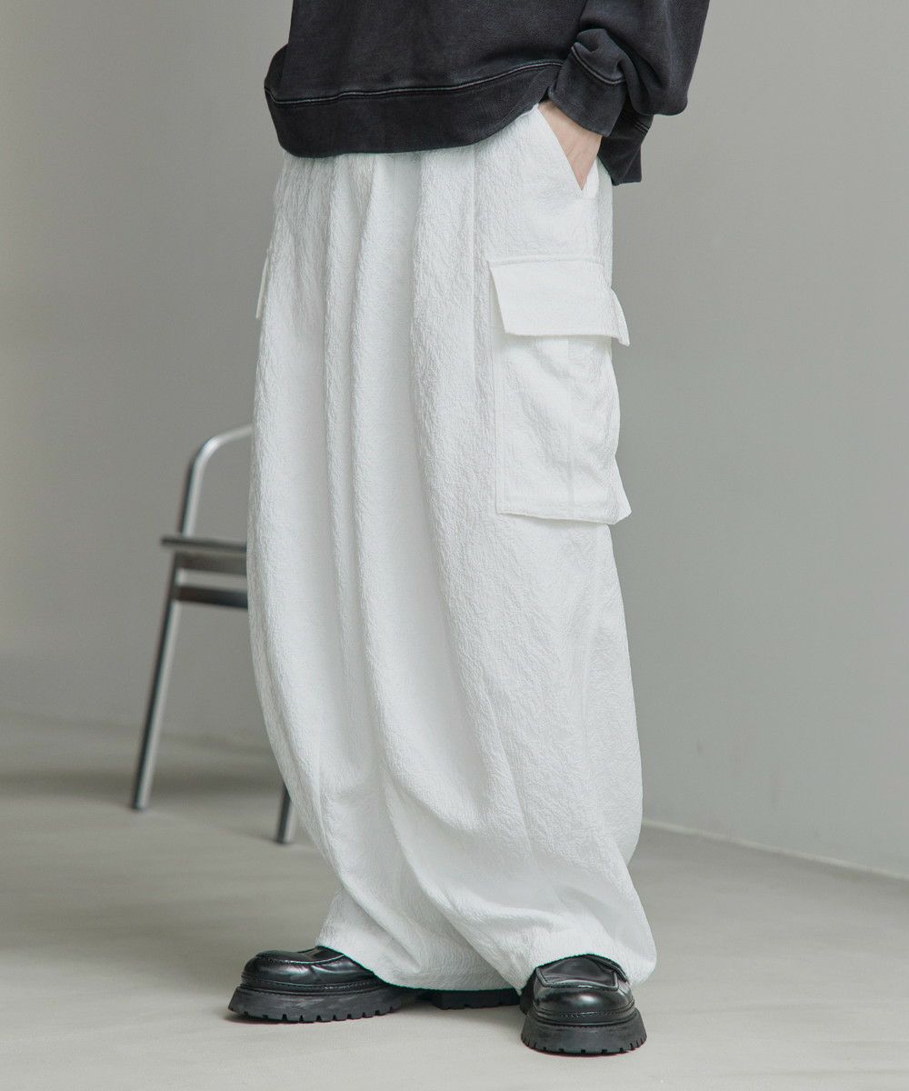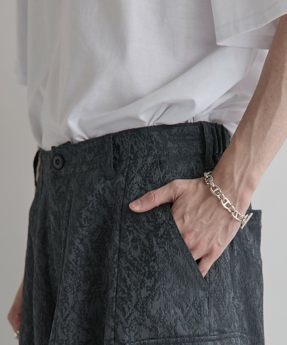 今シーズン注目の総柄ジャガードを使用したカーゴパンツ。立体的なシルエットと大きなカーゴポケットが抜け感をプラスしてくれます。生地の凹凸によって柄を作り出したジャガード柄は派手になりすぎず、さり気ないアクセントに。キレイめなルックスながら、ウエストの後ろはゴム入りで穿きやすさも兼ね備えています。また、ベルトループ付きでウエストまわりのアレンジがしやすいのもポイント。タックインスタイルもかっこよくキマるハイウエスト仕様なので、コーディネートの幅が広がります。