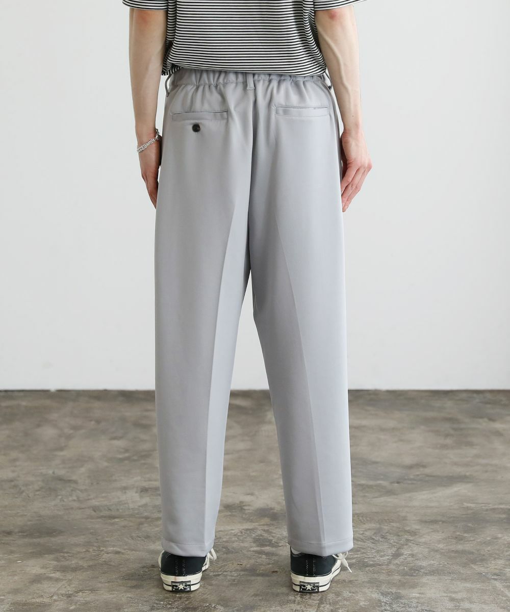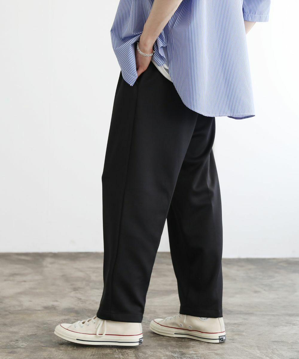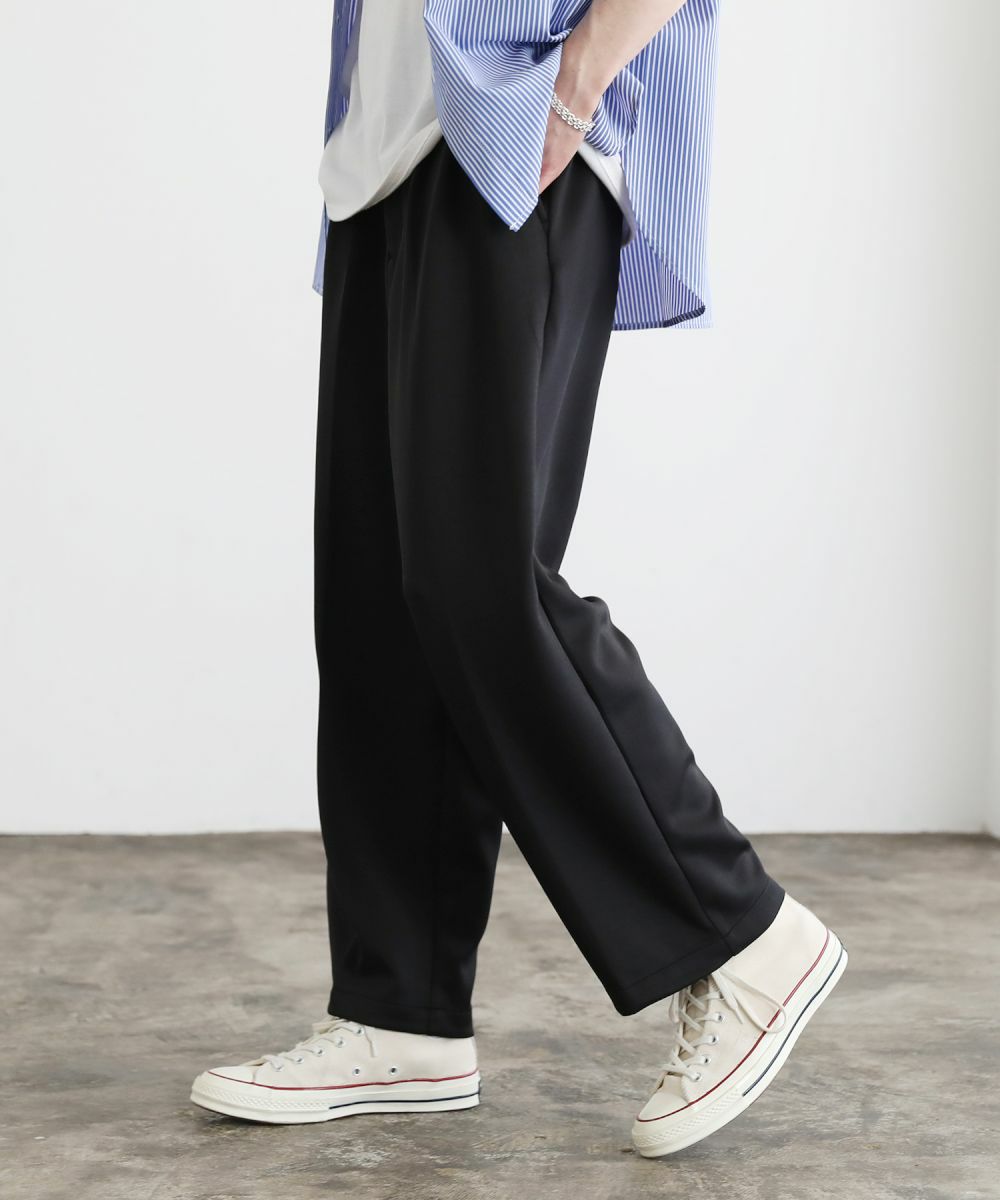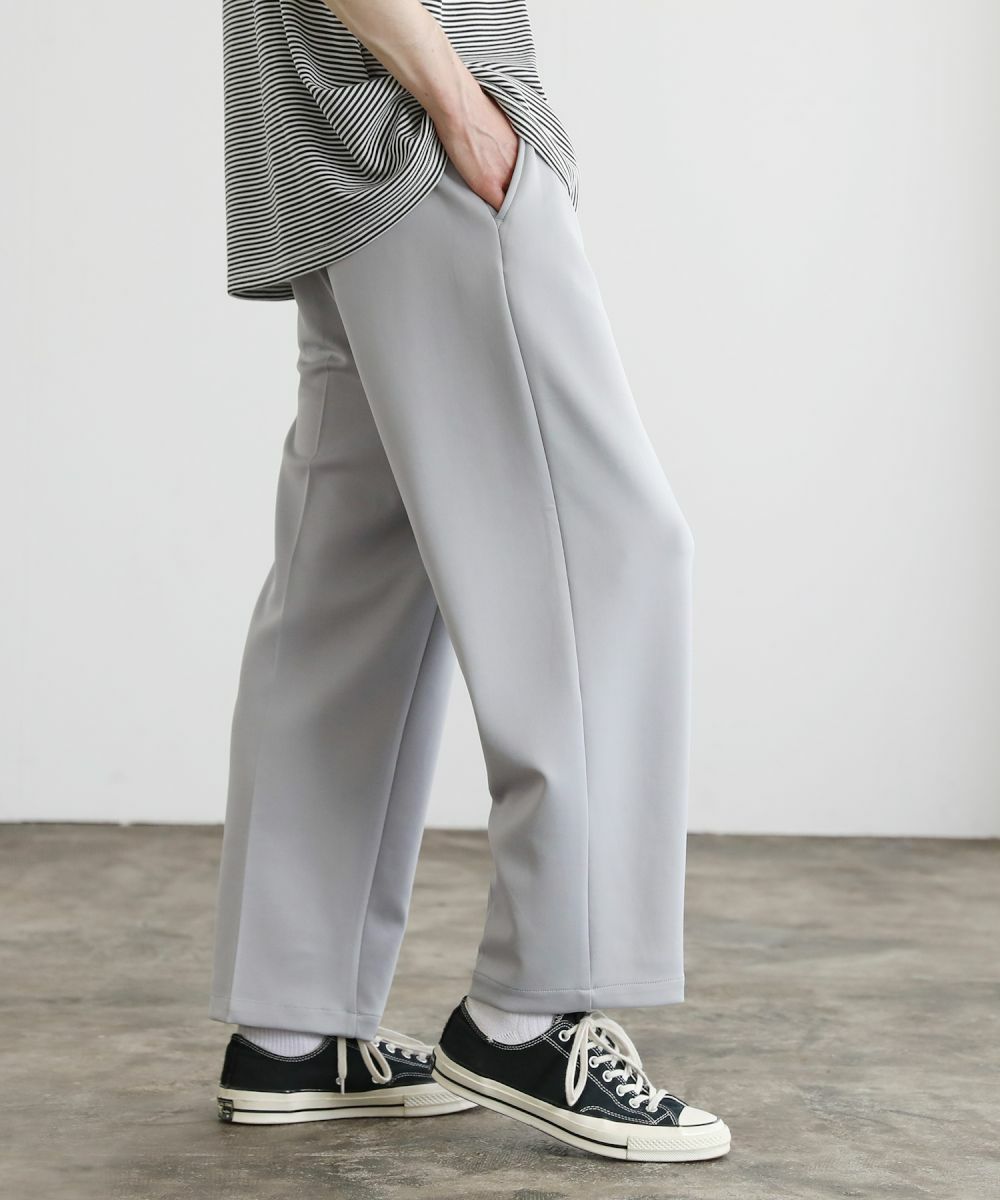 ゆったりとしたルーズシルエットが魅力のワイドスラックス。センタープレスが入っており、キレイなシルエットに仕上がっております。ウエスト後ろにゴムが入ったイージパンツ仕様。夏に嬉しいドライタッチなポンチ生地で、伸縮性に優れており楽な着心地が魅力。ほんのりと光沢感があり、シンプルなアイテムながら1枚で上品でキレイめな印象を与えてくれます。
