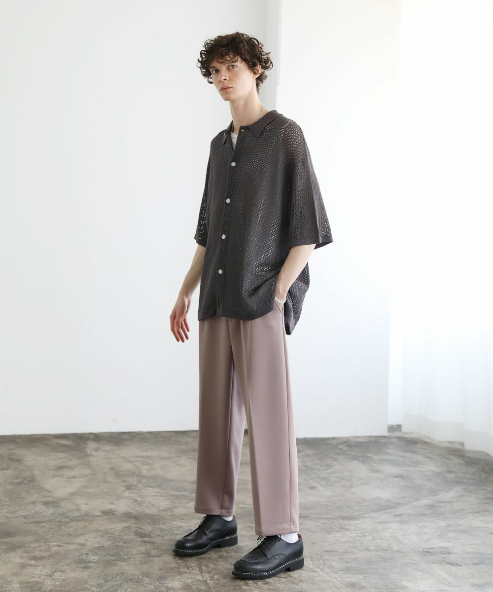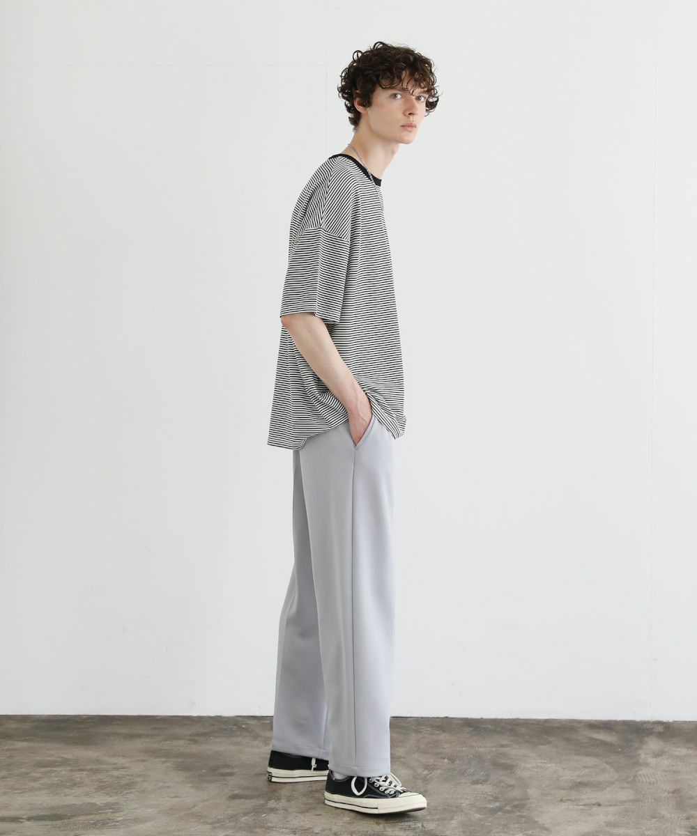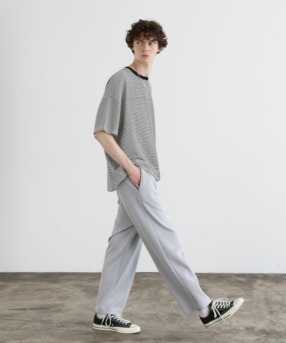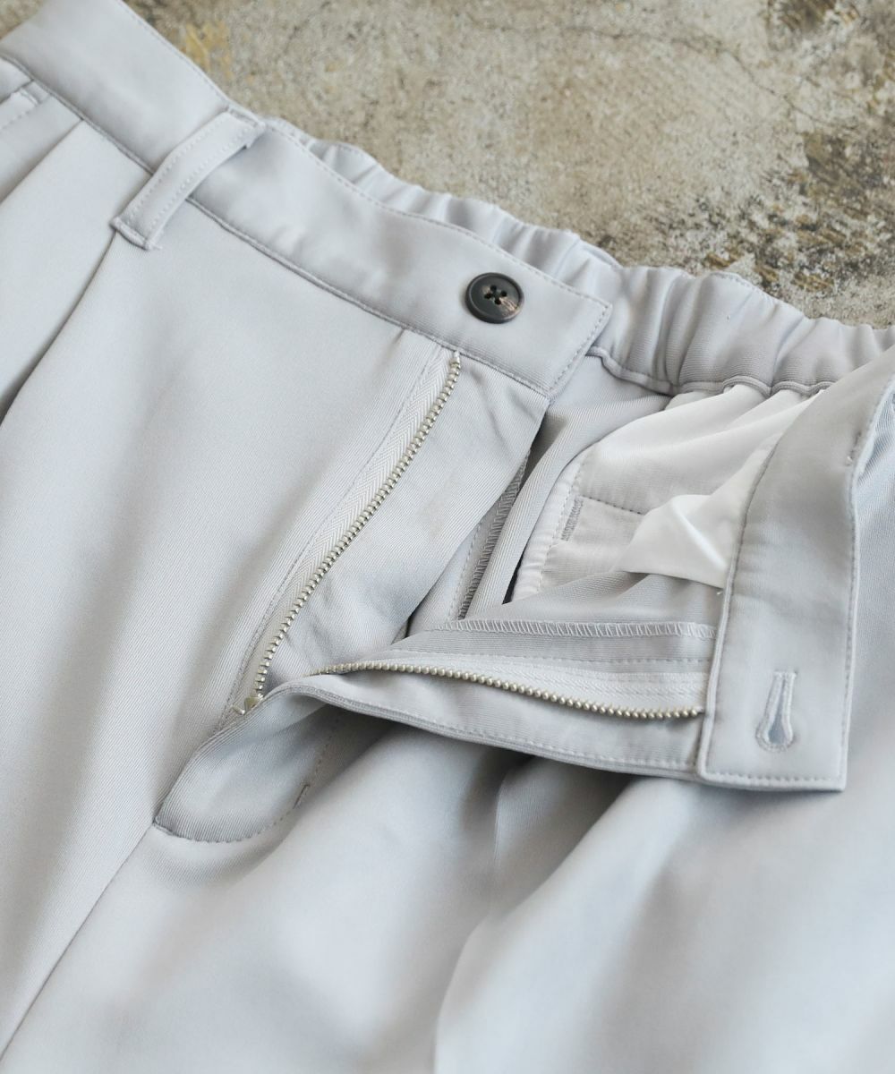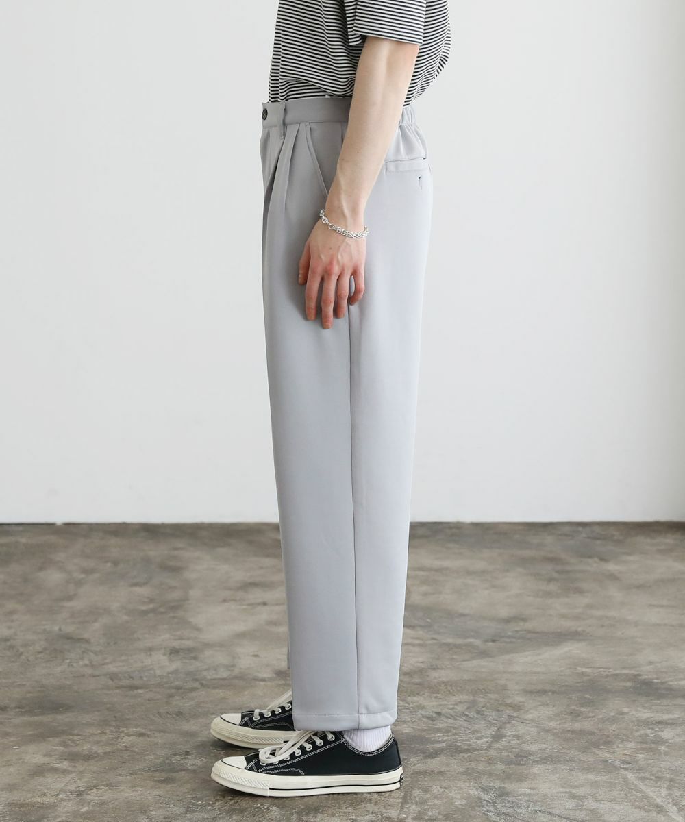 ゆったりとしたルーズシルエットが魅力のワイドスラックス。センタープレスが入っており、キレイなシルエットに仕上がっております。ウエスト後ろにゴムが入ったイージパンツ仕様。夏に嬉しいドライタッチなポンチ生地で、伸縮性に優れており楽な着心地が魅力。ほんのりと光沢感があり、シンプルなアイテムながら1枚で上品でキレイめな印象を与えてくれます。