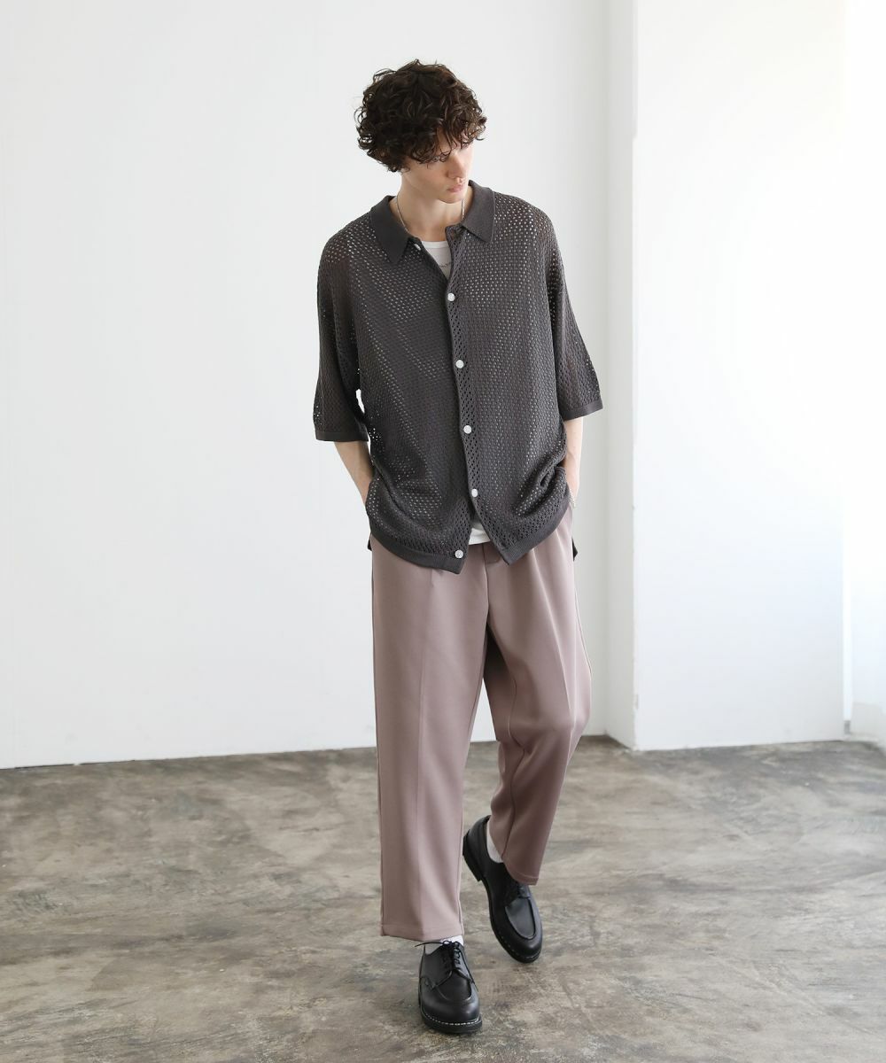 伸縮性のある柔らかなポンチ素材を使用しています。ドライタッチ生地なため、夏でも快適に着用可能。 程よい光沢感と艶感があり、キレイめな雰囲気のある生地。シワになりにくくご自宅でのケアも簡単なのも嬉しいポイント。