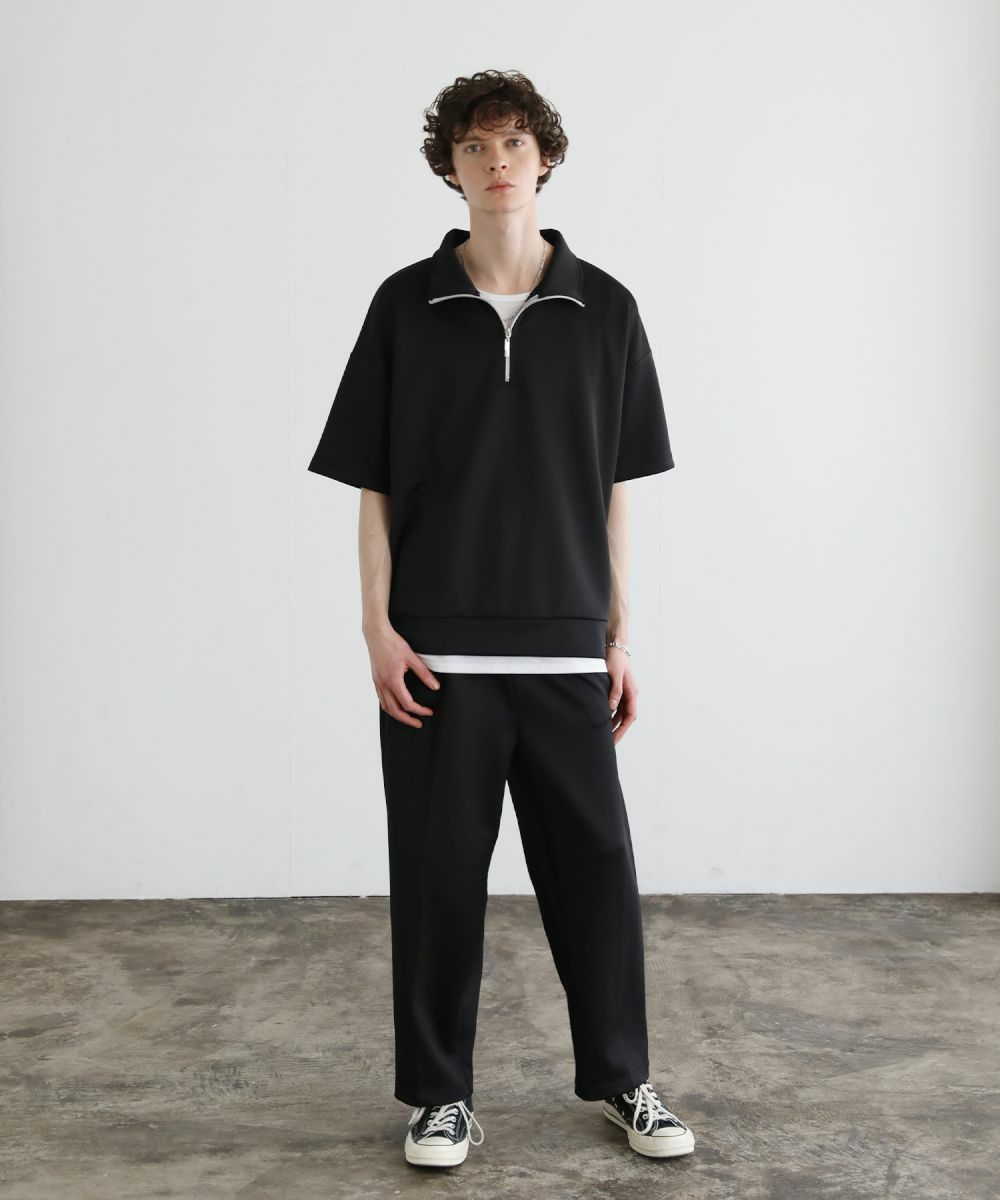 ポンチハーフジップスタンドネック5分袖プルオーバー