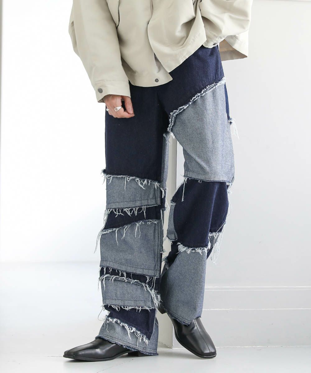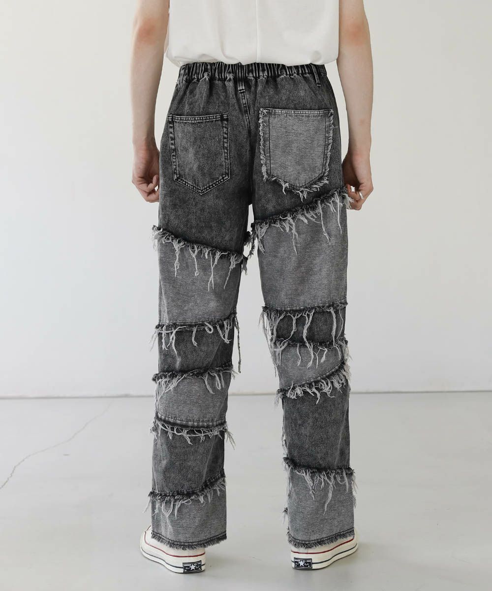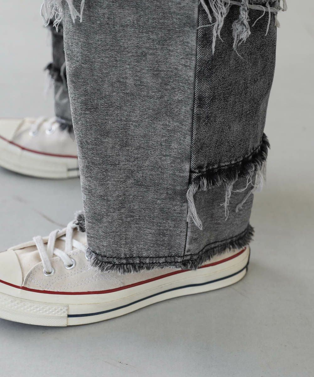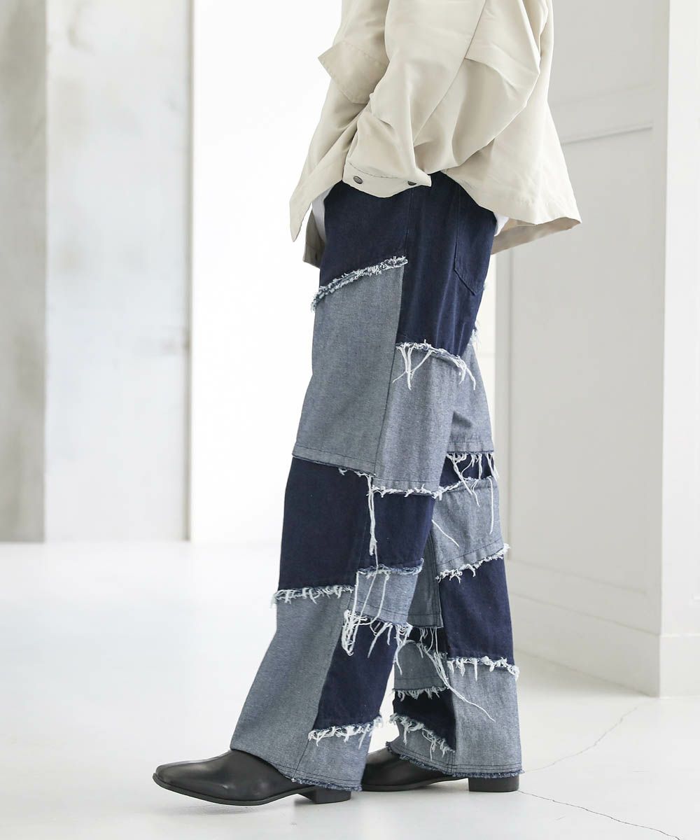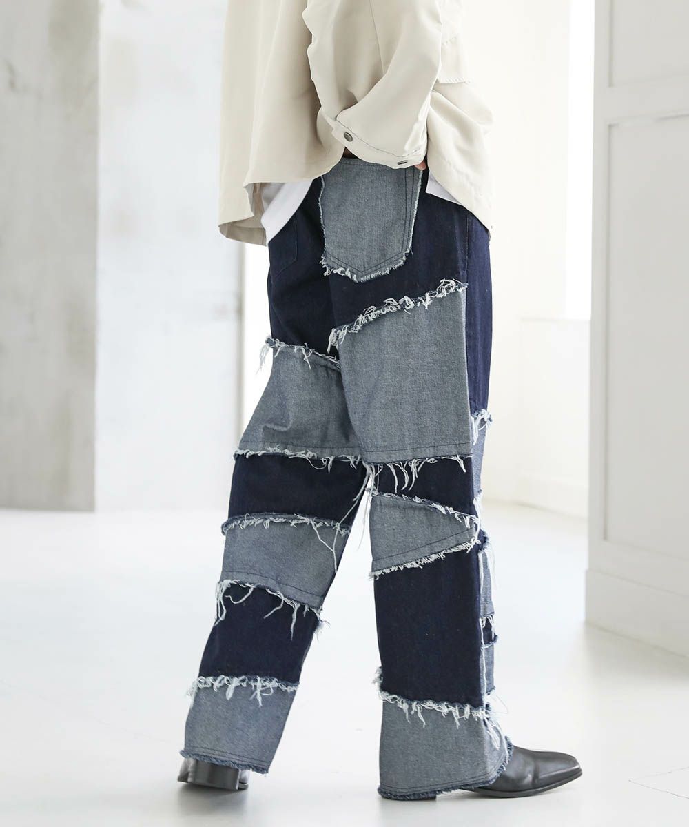 着こなしのメインになるフリンジ切り替えデニム。異なるカラーのデニムを組み合わせたパッチワークのようなデザイン&フリンジがアクセントに。シンプルなトップスと合わせるだけでもインパクトのある着こなしに見せてくれる、デザイン性の高い一本です。生地は程よい厚みのある綿100%デニムを採用し、シーズンを問わずに着用が可能。またウエストのバックはゴム入りになっているので楽に穿けるのもポイント。すとんと裾に向かって落ちるワイドストレートのシルエットは体型を問わずにキレイに穿きこなせます。