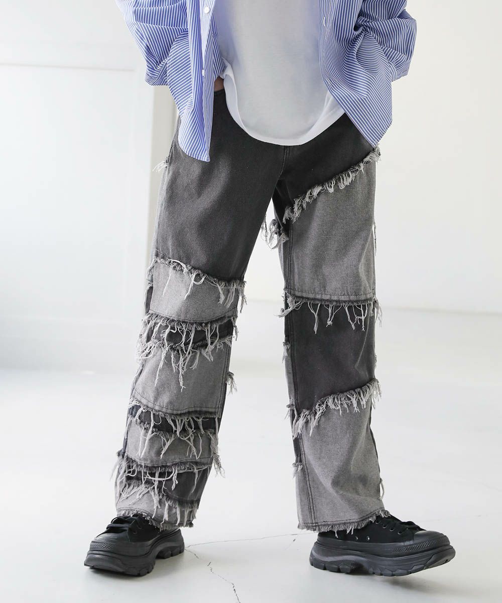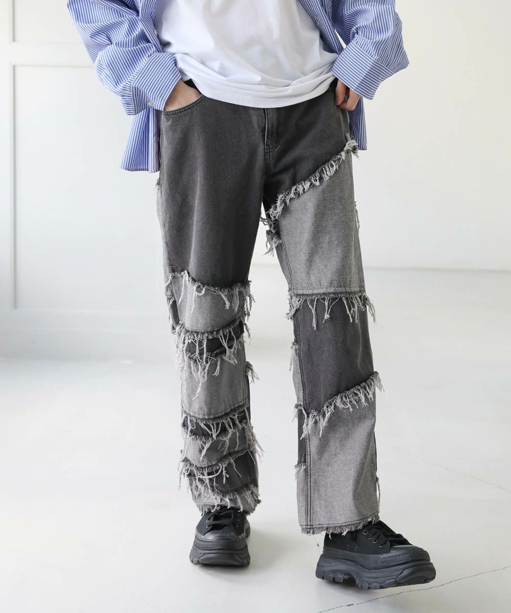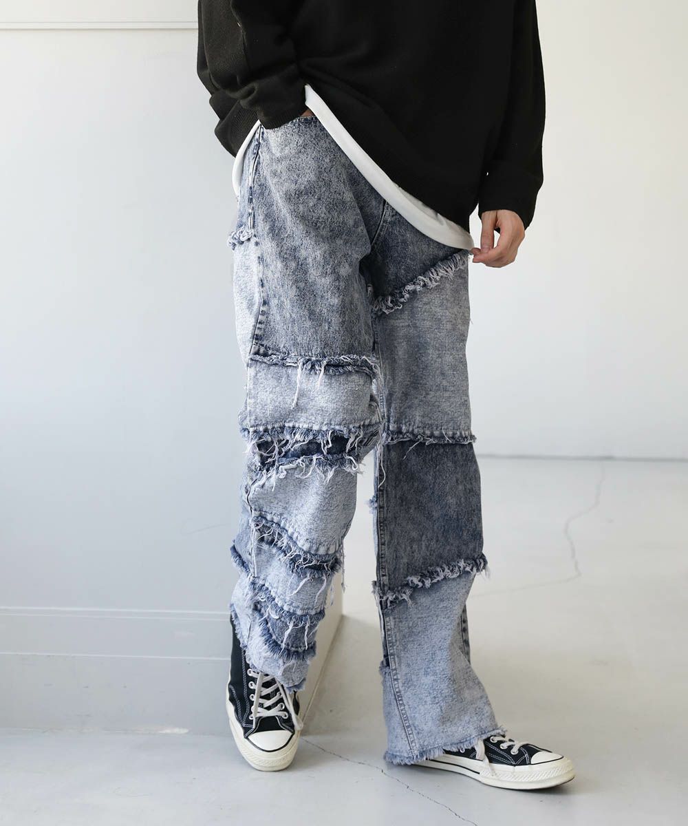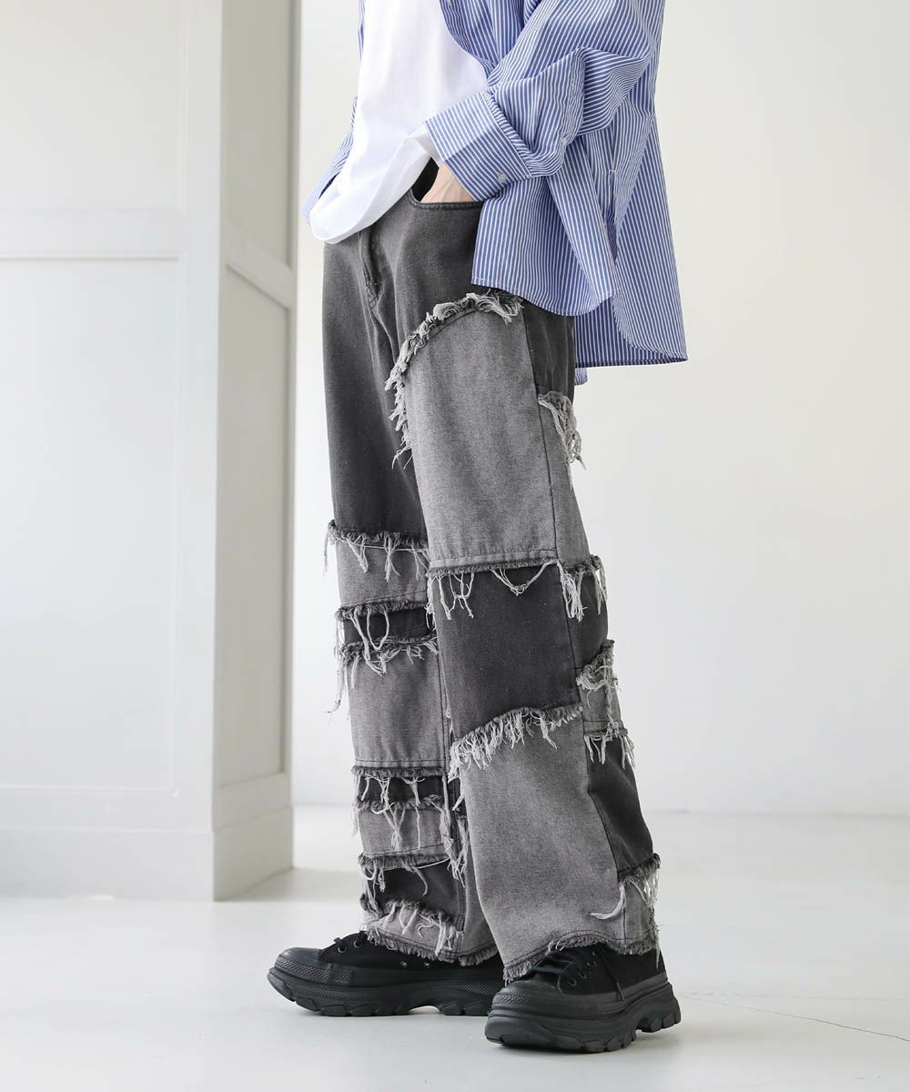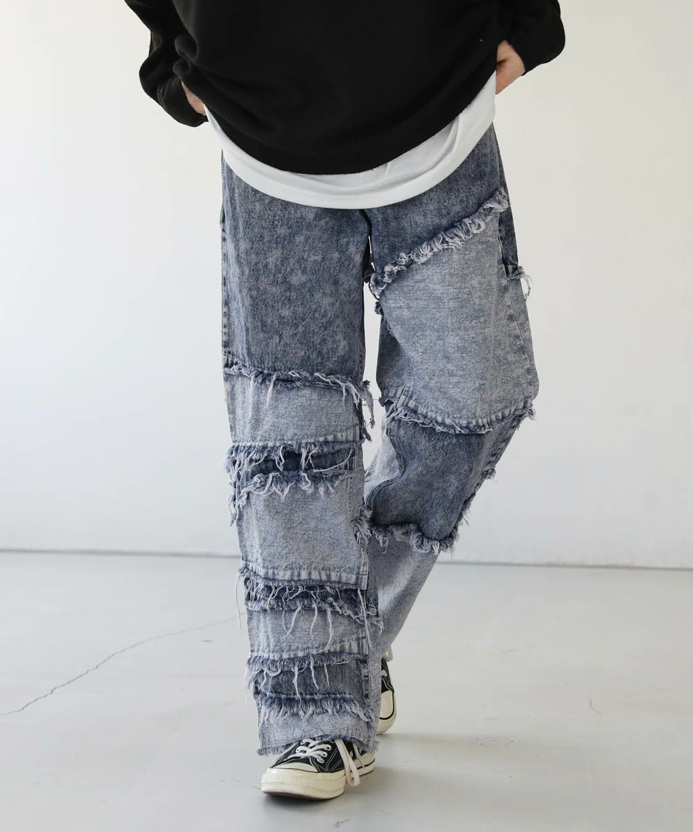 着こなしのメインになるフリンジ切り替えデニム。異なるカラーのデニムを組み合わせたパッチワークのようなデザイン&フリンジがアクセントに。シンプルなトップスと合わせるだけでもインパクトのある着こなしに見せてくれる、デザイン性の高い一本です。生地は程よい厚みのある綿100%デニムを採用し、シーズンを問わずに着用が可能。またウエストのバックはゴム入りになっているので楽に穿けるのもポイント。すとんと裾に向かって落ちるワイドストレートのシルエットは体型を問わずにキレイに穿きこなせます。