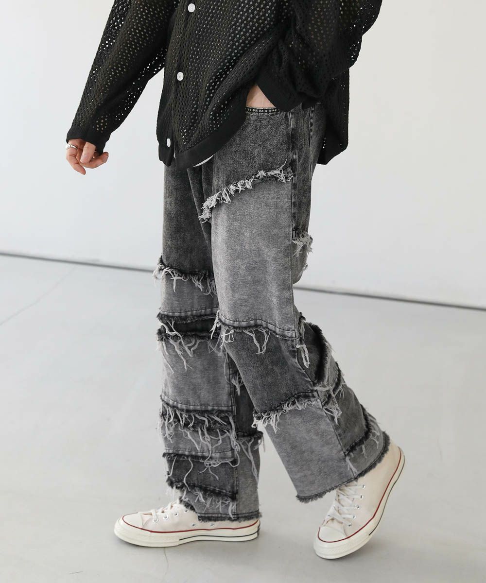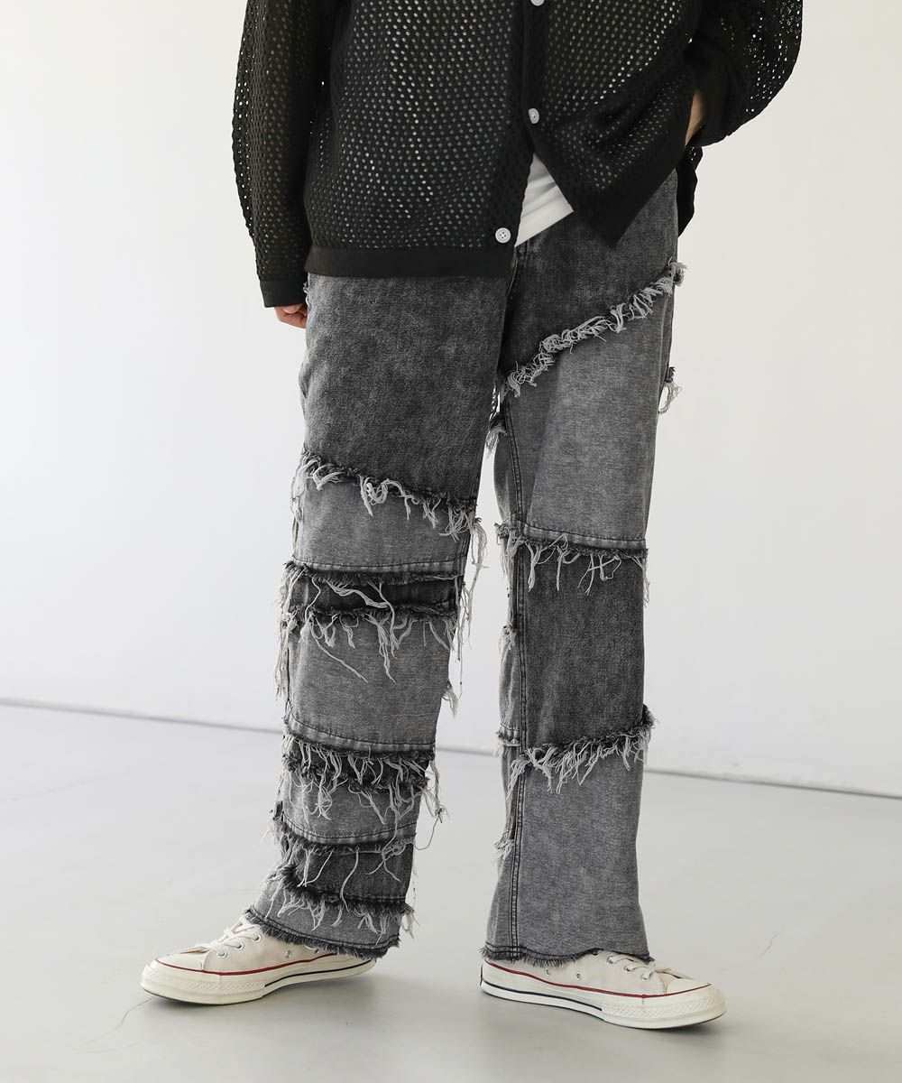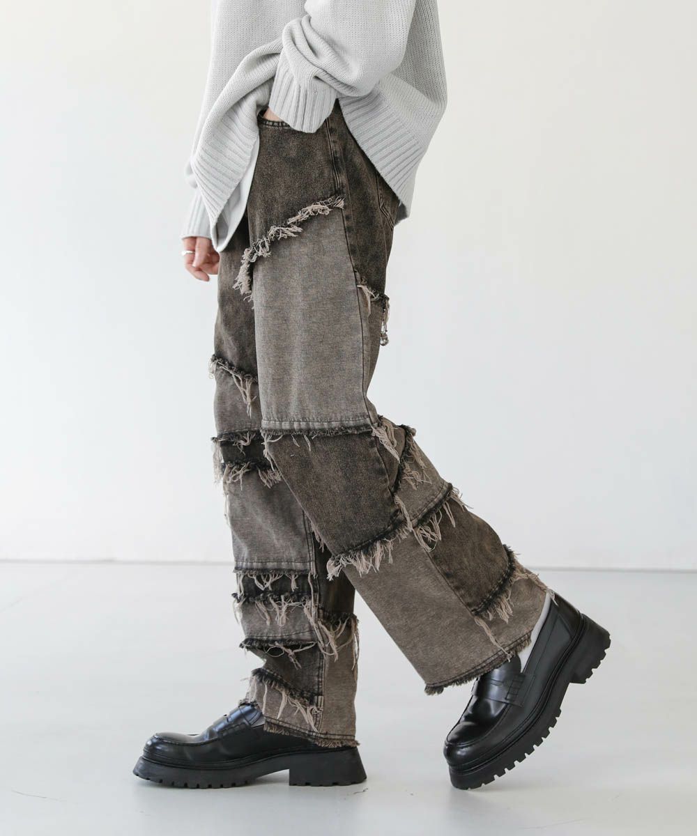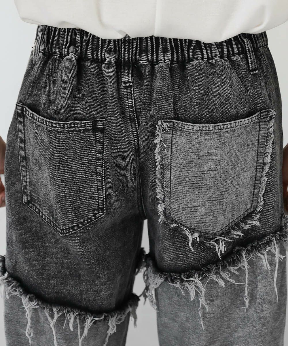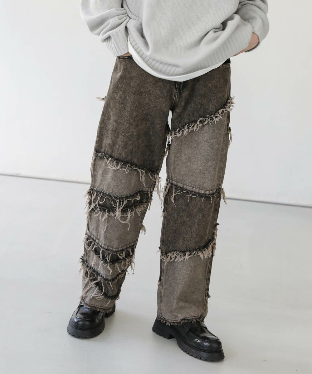 着こなしのメインになるフリンジ切り替えデニム。異なるカラーのデニムを組み合わせたパッチワークのようなデザイン&フリンジがアクセントに。シンプルなトップスと合わせるだけでもインパクトのある着こなしに見せてくれる、デザイン性の高い一本です。生地は程よい厚みのある綿100%デニムを採用し、シーズンを問わずに着用が可能。またウエストのバックはゴム入りになっているので楽に穿けるのもポイント。すとんと裾に向かって落ちるワイドストレートのシルエットは体型を問わずにキレイに穿きこなせます。
