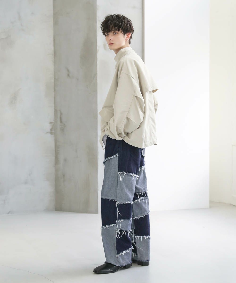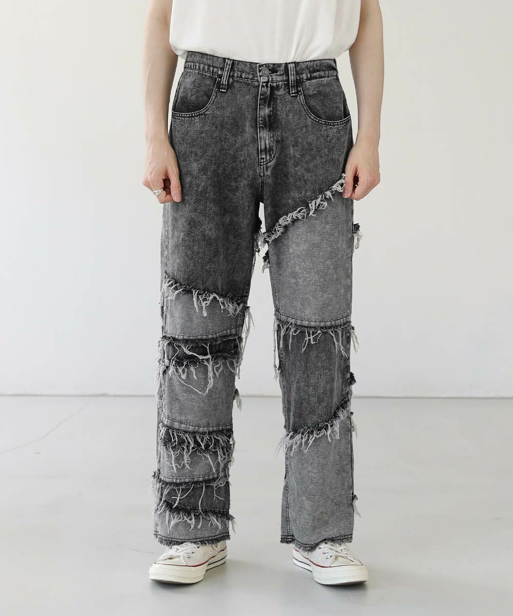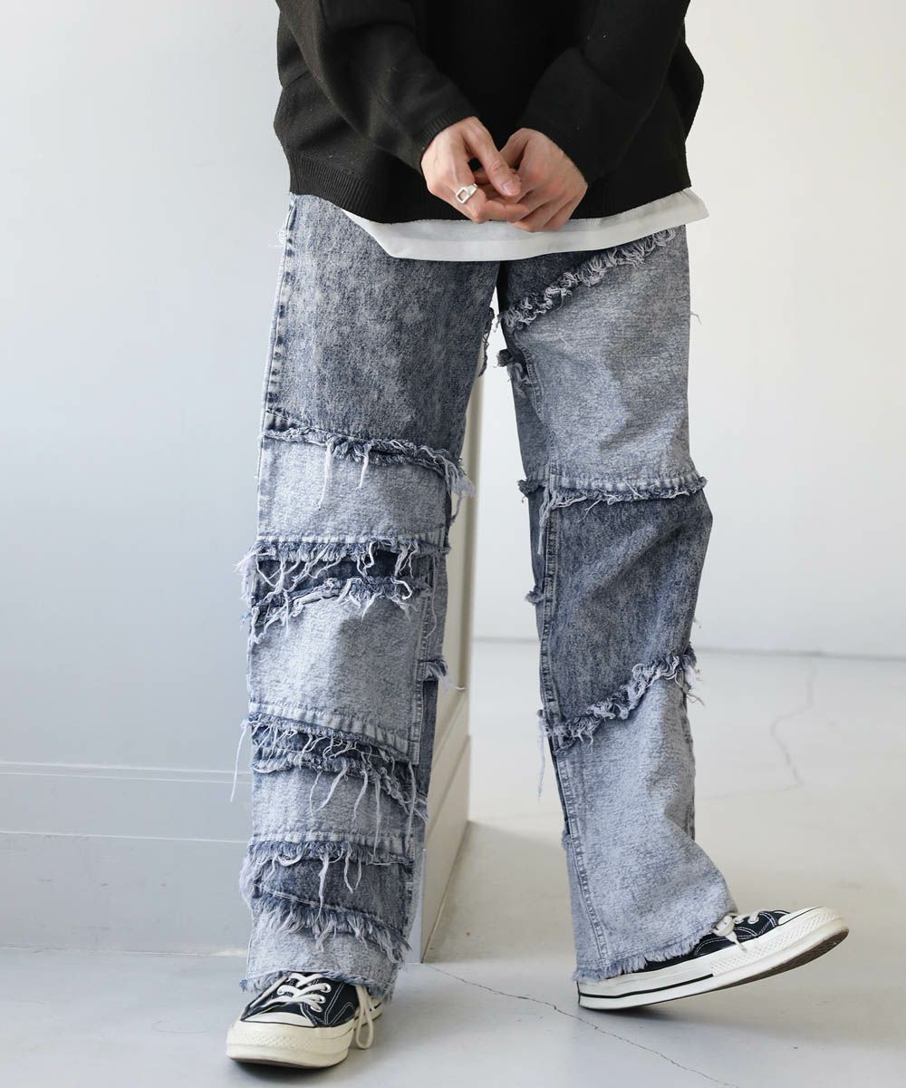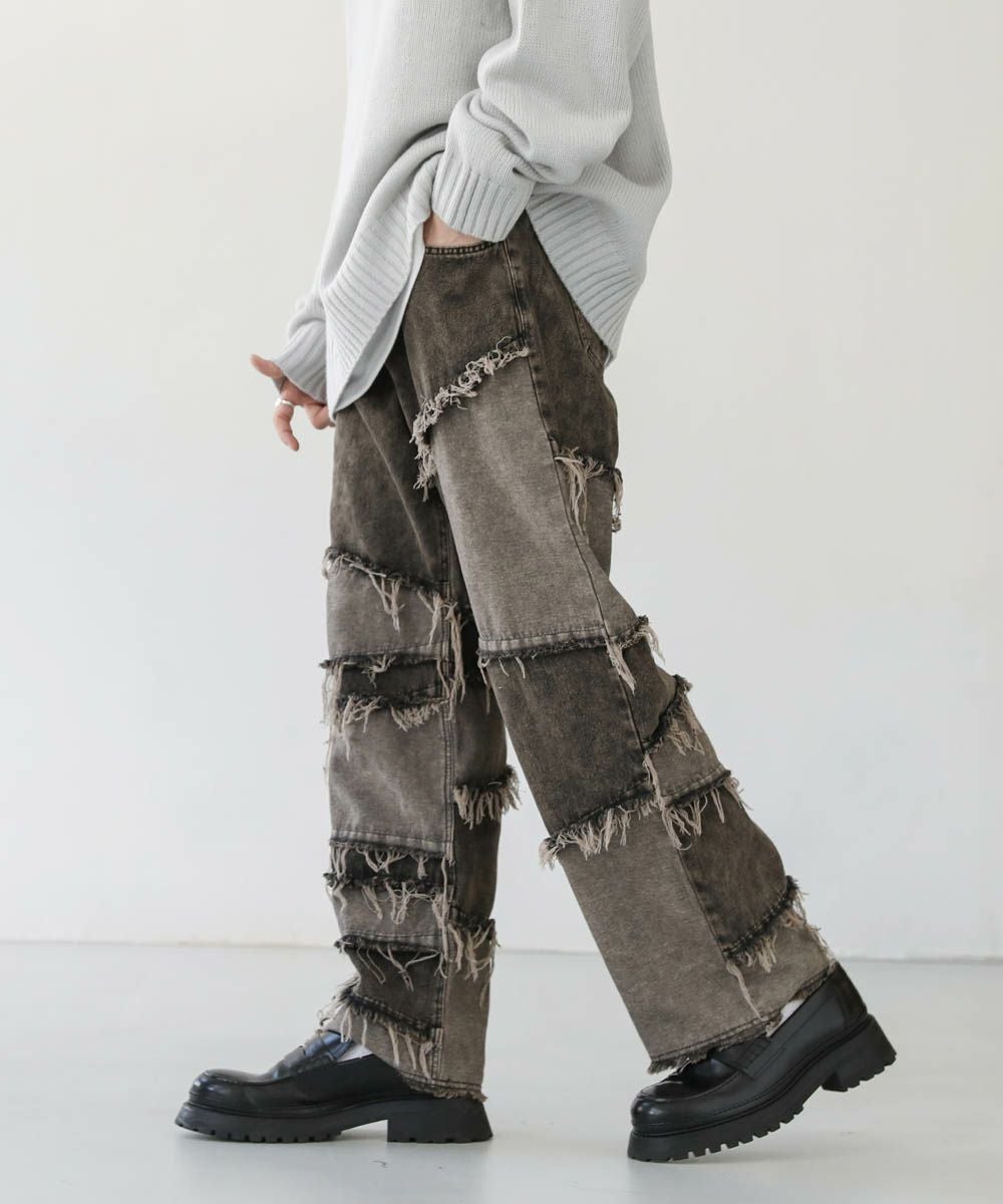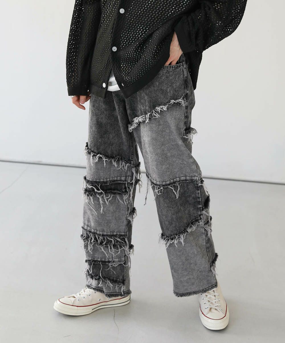 着こなしのメインになるフリンジ切り替えデニム。異なるカラーのデニムを組み合わせたパッチワークのようなデザイン&フリンジがアクセントに。シンプルなトップスと合わせるだけでもインパクトのある着こなしに見せてくれる、デザイン性の高い一本です。生地は程よい厚みのある綿100%デニムを採用し、シーズンを問わずに着用が可能。またウエストのバックはゴム入りになっているので楽に穿けるのもポイント。すとんと裾に向かって落ちるワイドストレートのシルエットは体型を問わずにキレイに穿きこなせます。